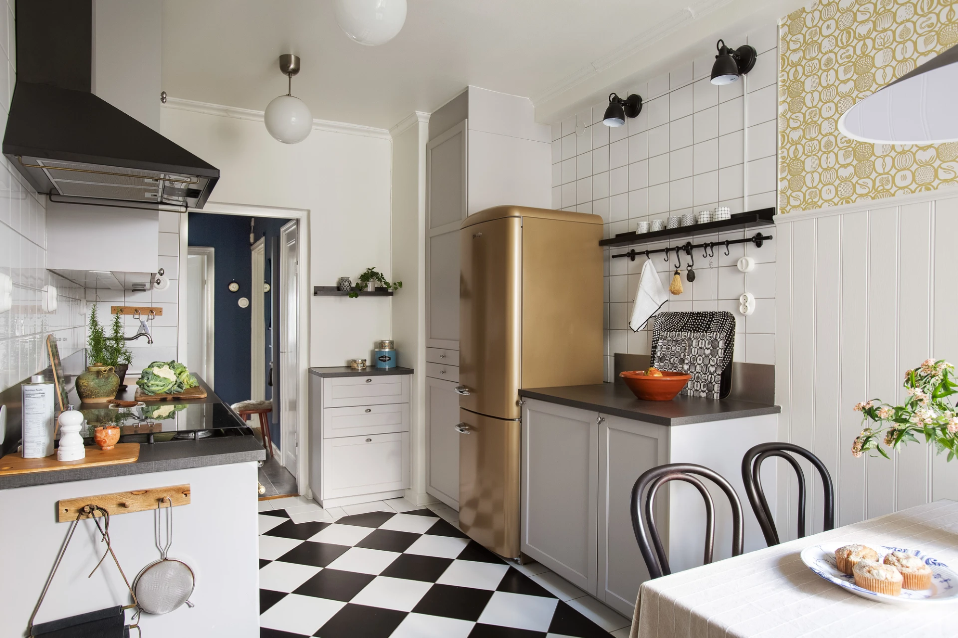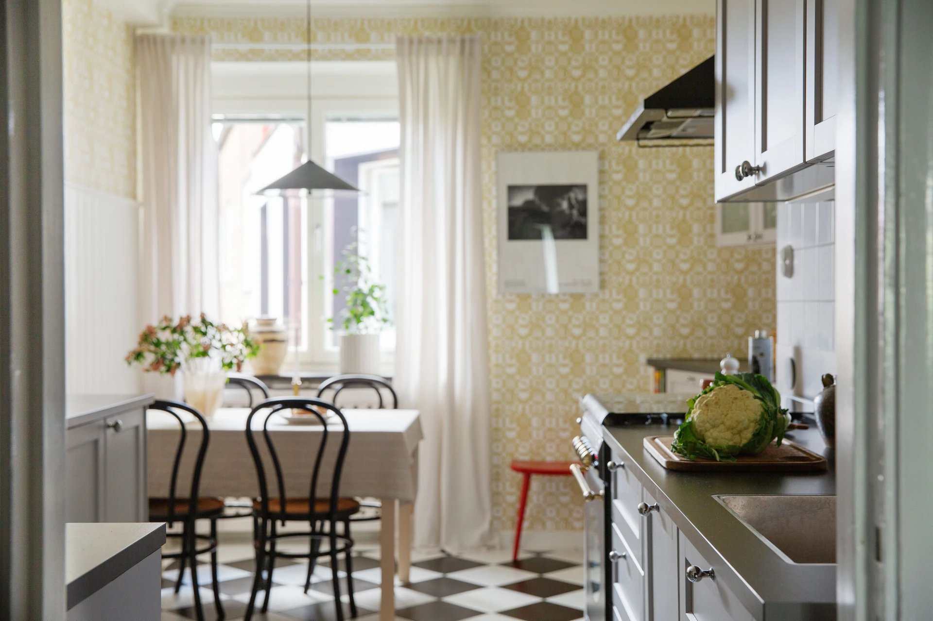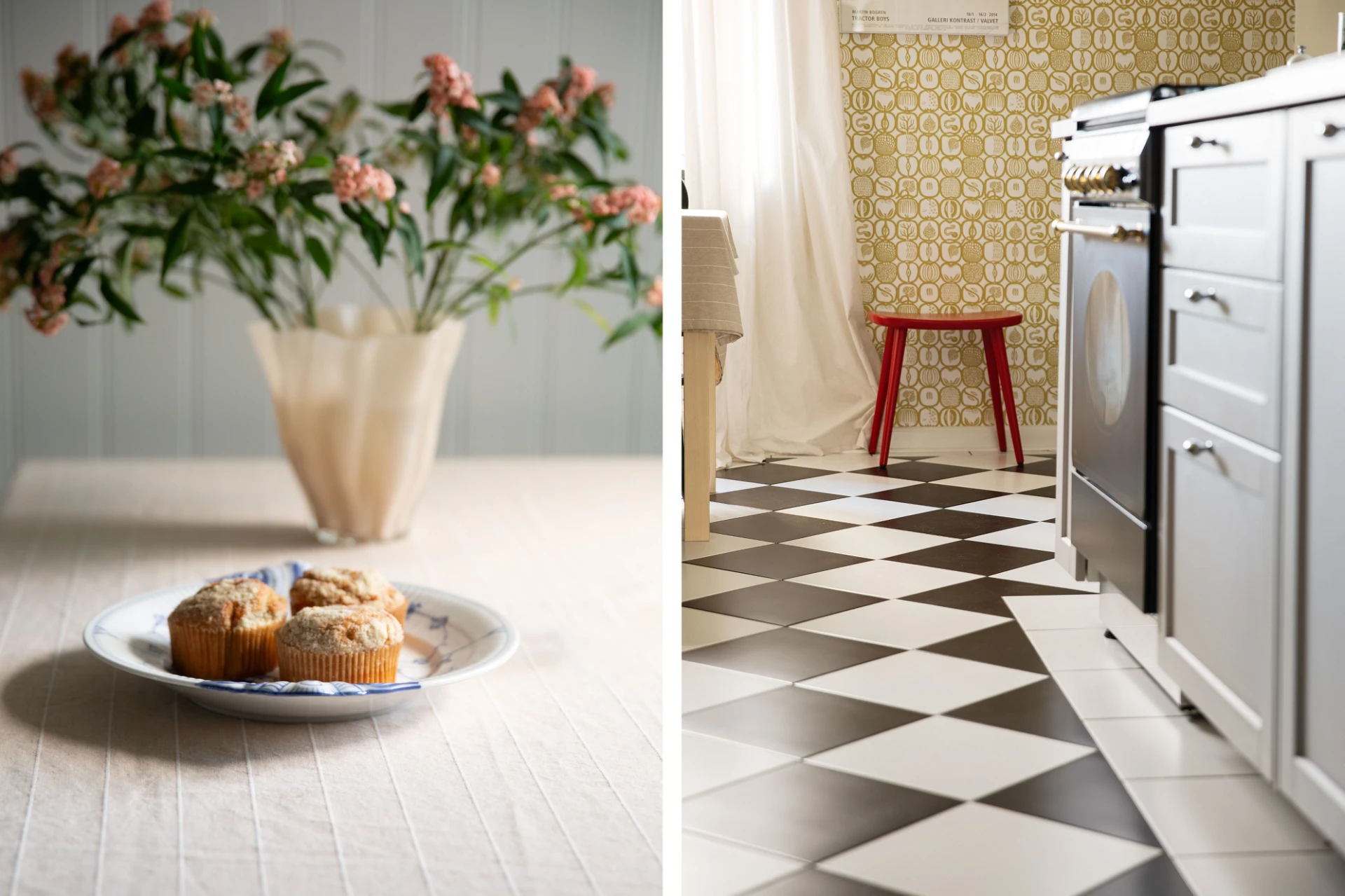 Klinkergolv med golvvärme och målade samt tapetserade väggar i Boråstapeter "Fruktlåda" av Stig Lindberg. Köksinredning i grått och ovanför bänkskivan i laminat sitter vitt kakel som belyses av spotlights med dimmerfunktion. Köket är utrustat med kombinerad kyl/frys, gasspis med elugn, köksfläkt och diskmaskin. Matplats för ca 6 personer.