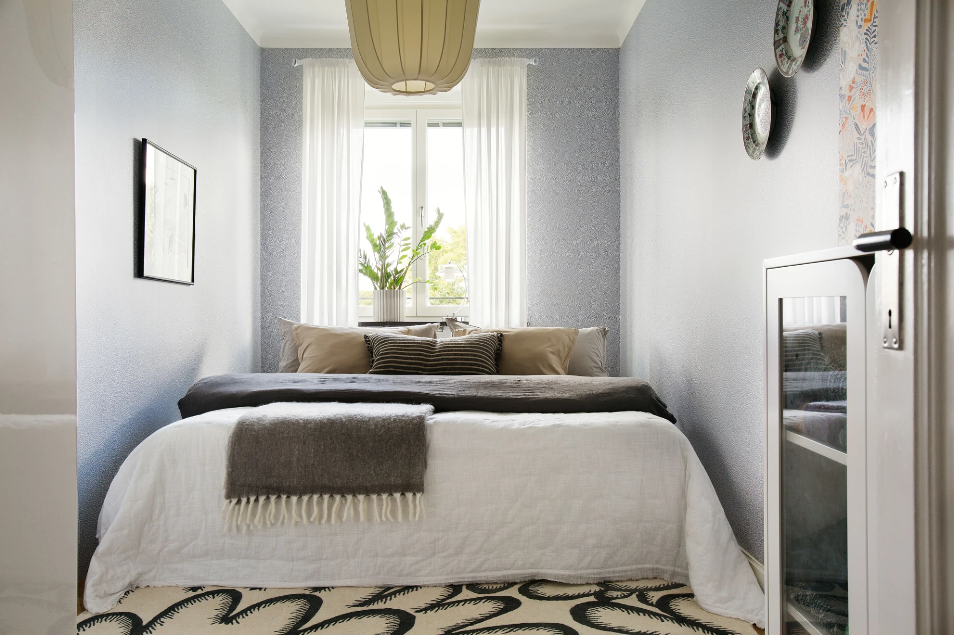 Fiskbensparkett och tapetserade väggar i Midbec "Lina"-små blå löv med crème botten samt en fondvägg från Midbec "Lina"-blommig. Här finns plats för dubbelsäng med tillhörande möblemang. Förvaring i en rymlig garderob som är försedd med hyllor, klädstång och belysning.