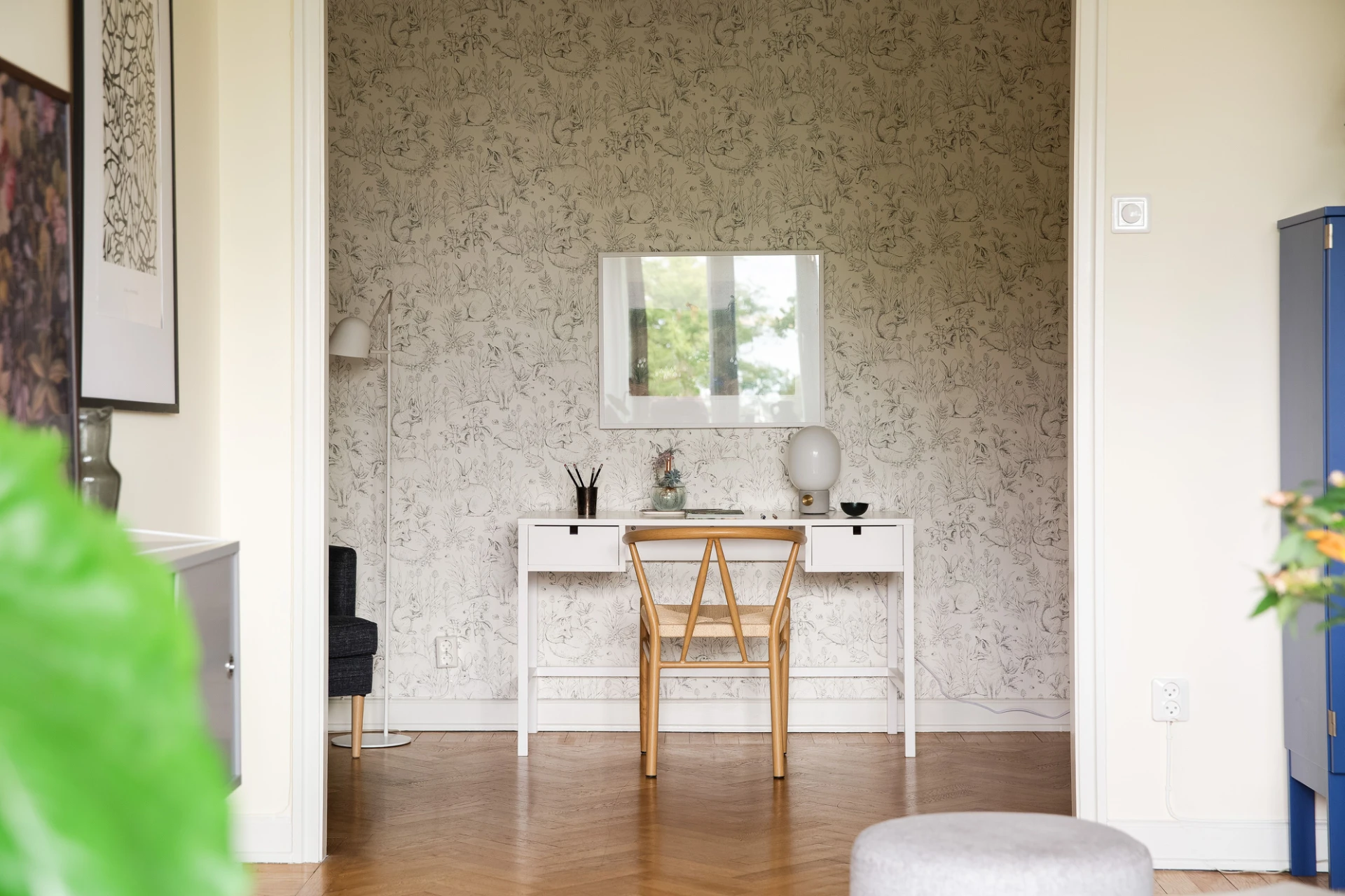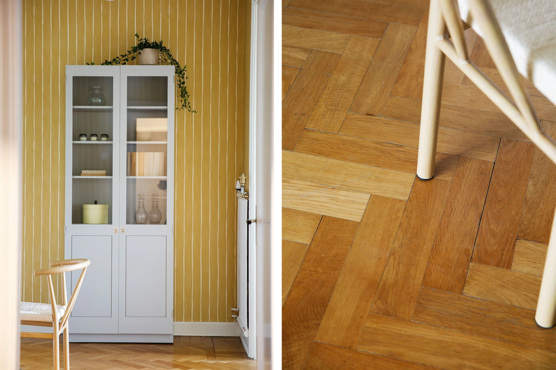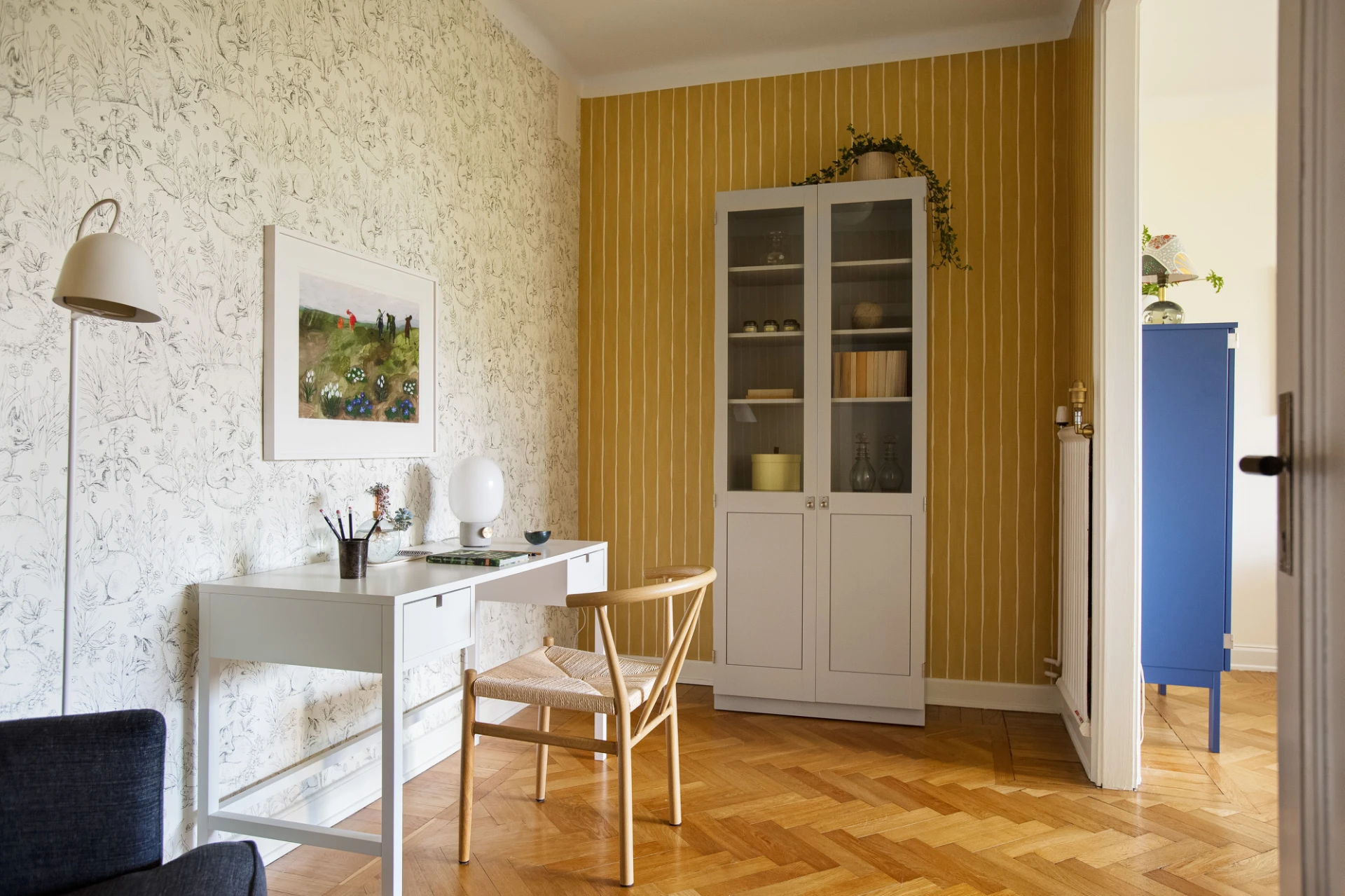 Fiskbensparkett och tapetserade väggar i nyansen Mustard från Cole & Son -"Marquee Stripe" samt en fondtapet från Boråstapeter "Newbie" djur. Här finns plats för skrivbord med tillhörande möblemang.