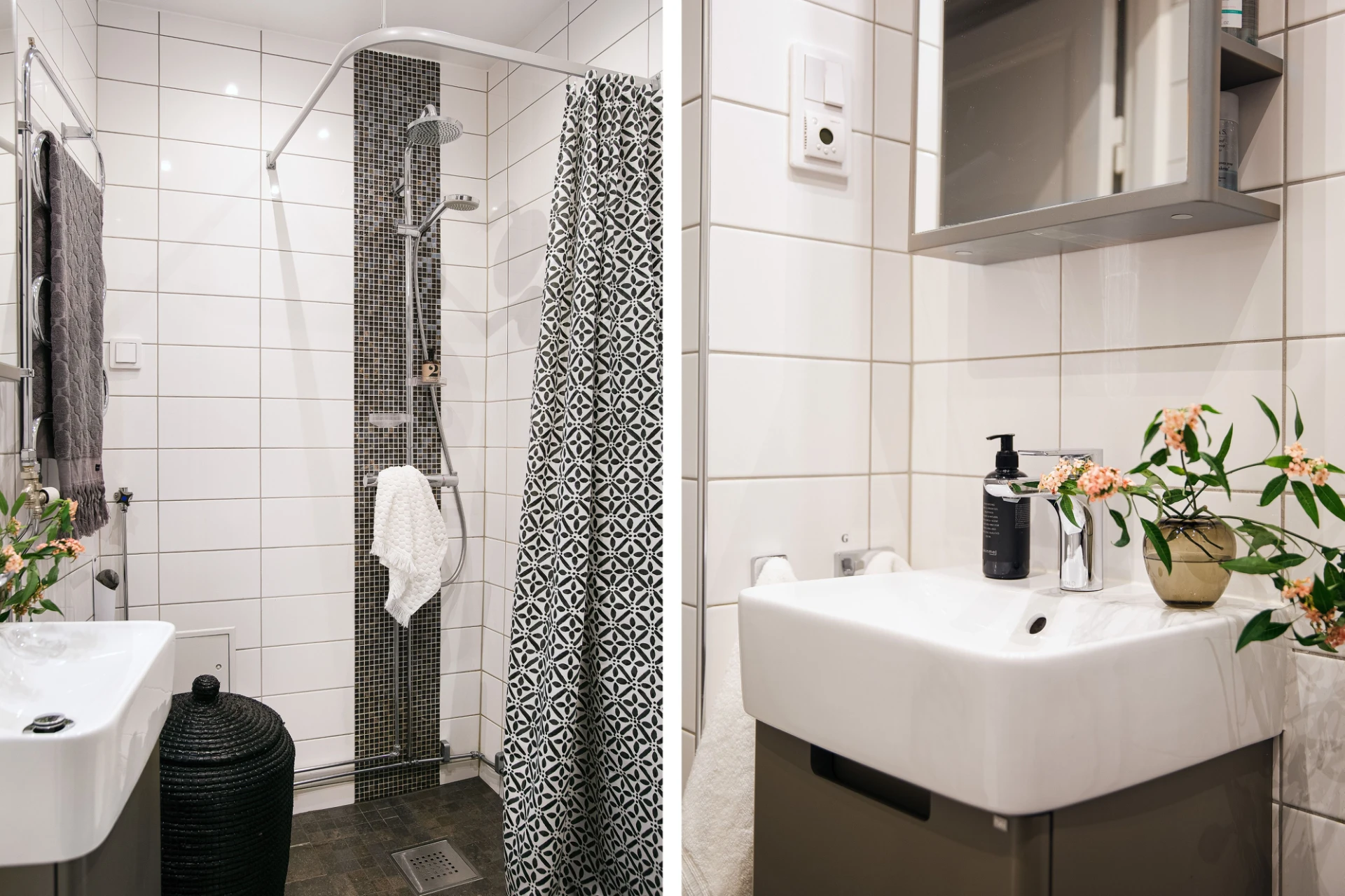 Klinkergolv med golvvärme och helkaklade väggar i vitt. Badrummet är utrustat med WC, handfat med kommod, spegelskåp, dusch, handdukstork samt förberett för tvättmaskin.