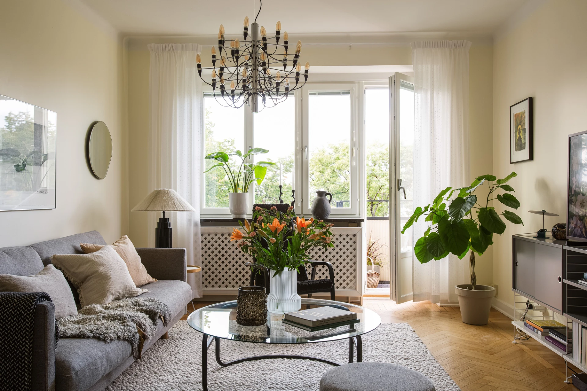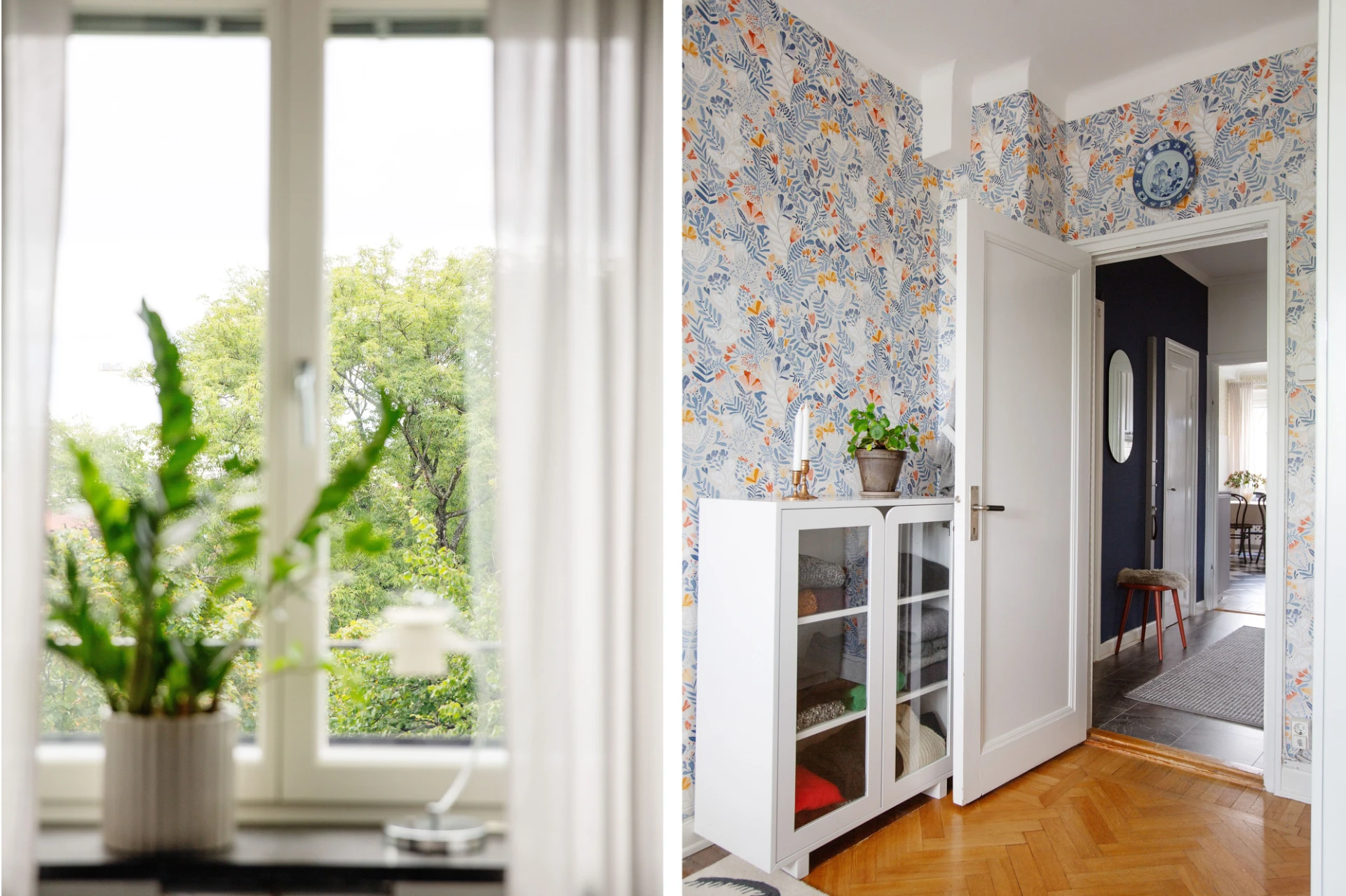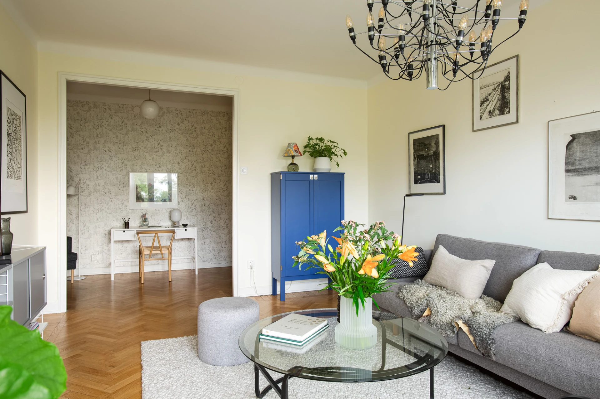 Fiskbensparkett och målade väggar i nyansen First Light från Little Greene. Här finns plats för soffgrupp med tillhörande möblemang samt matsalsbord. Utgång till bostadens balkong med plats för utemöbler.