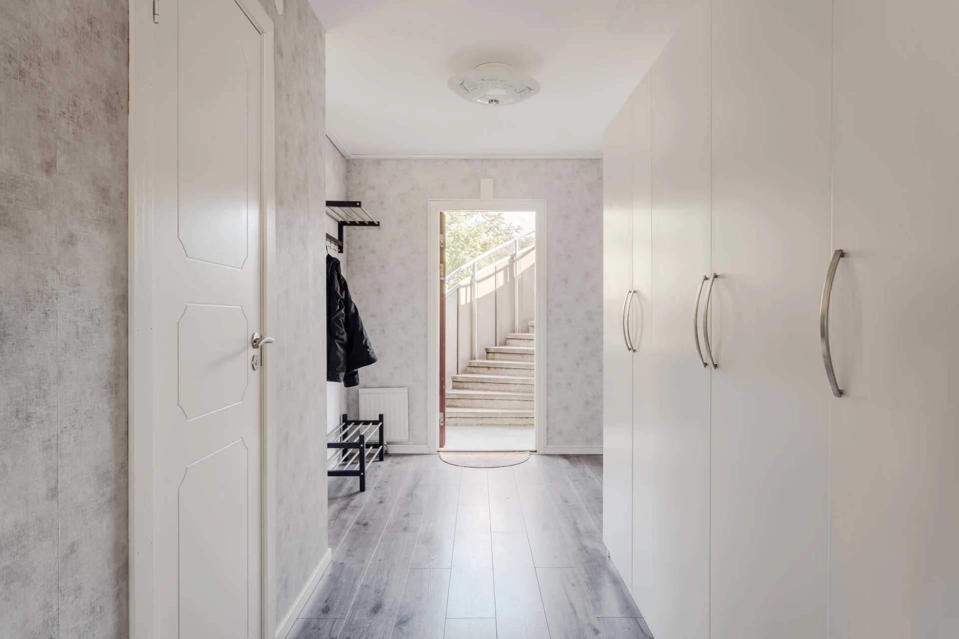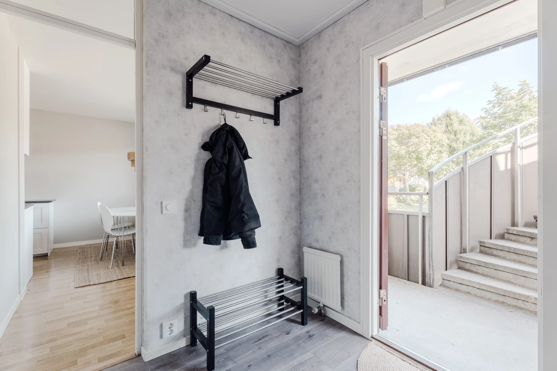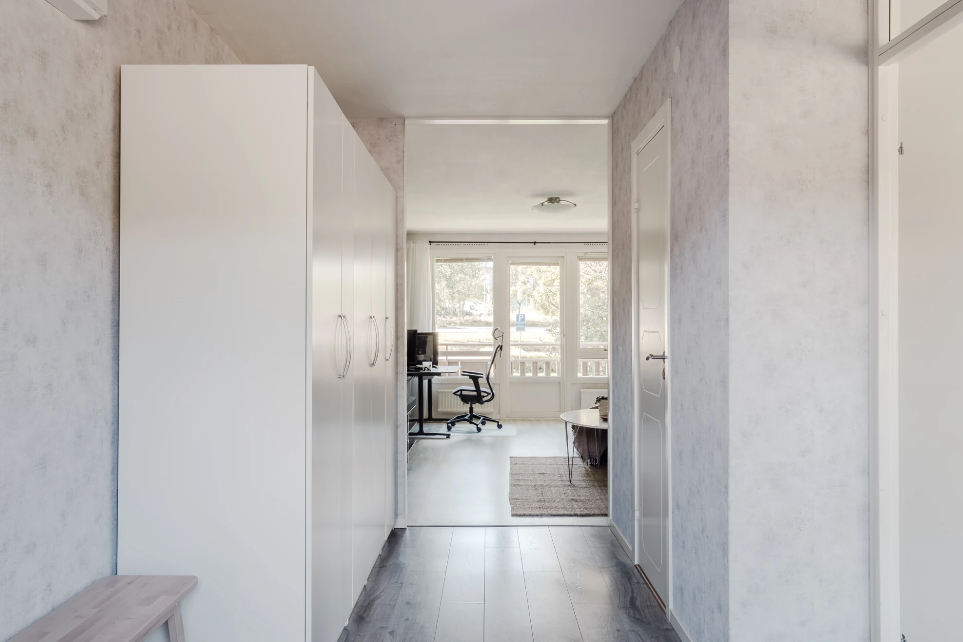 Laminatgolv samt tapetserade väggar. Här finns plats för avhängning och förvaring i en garderob.