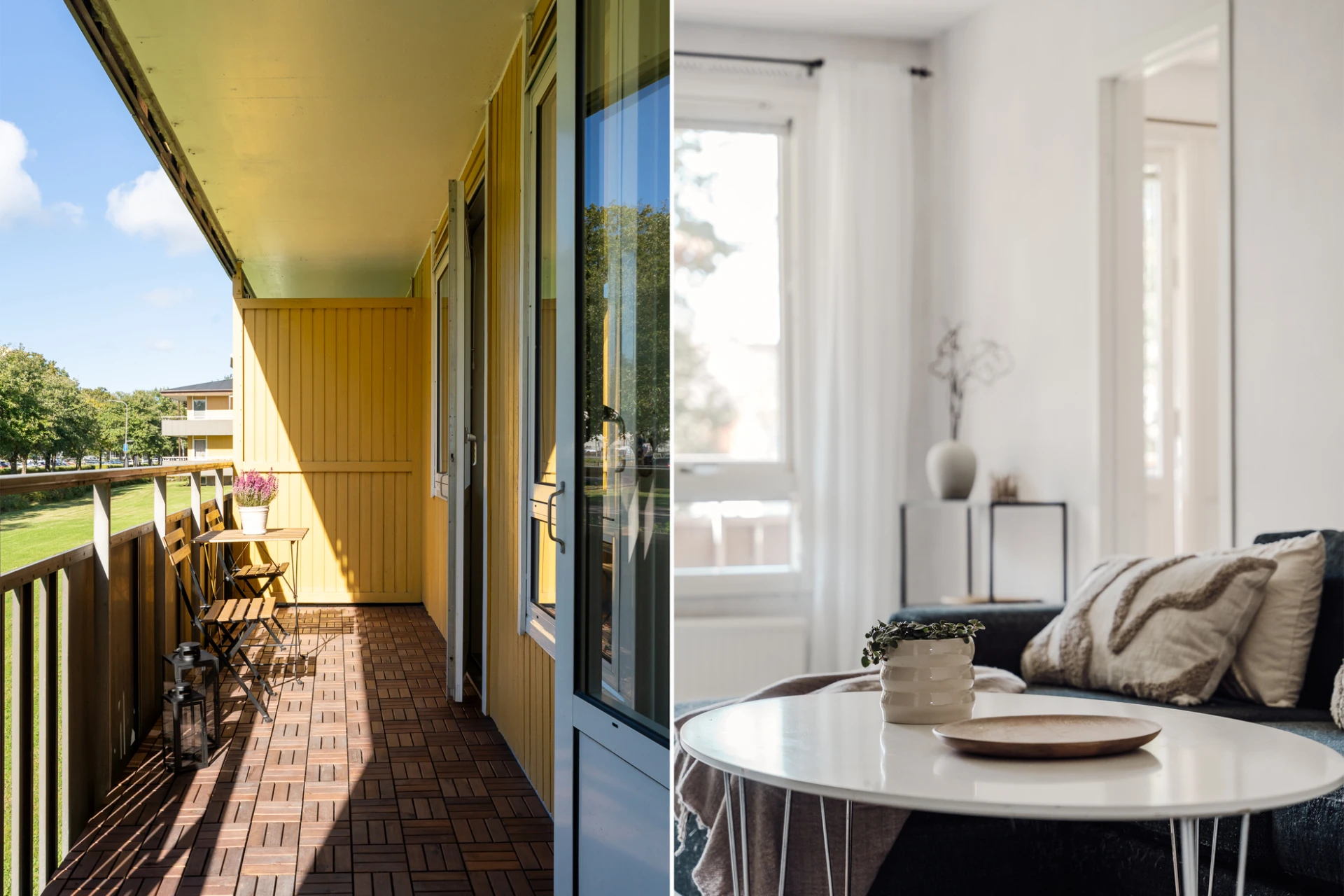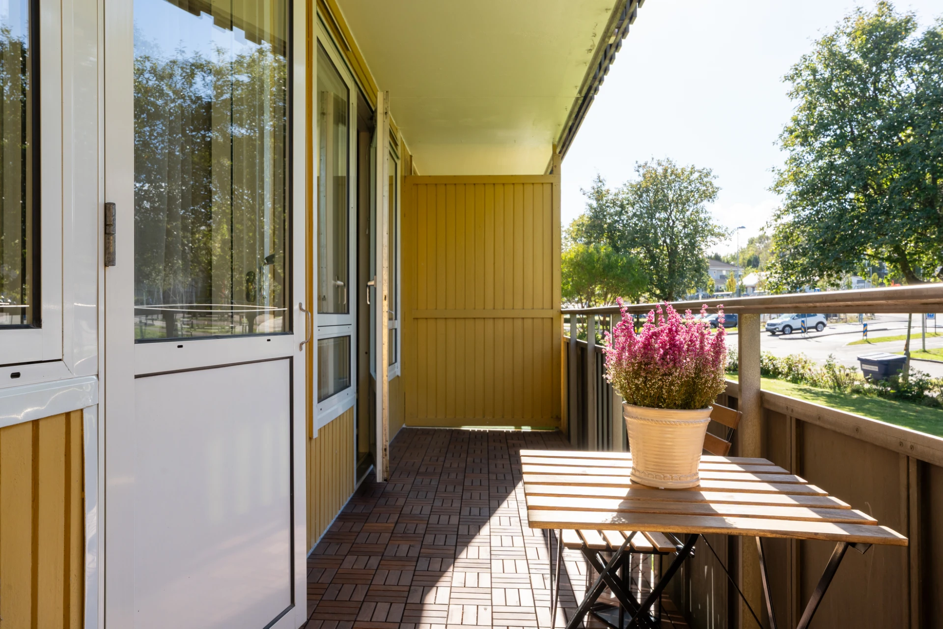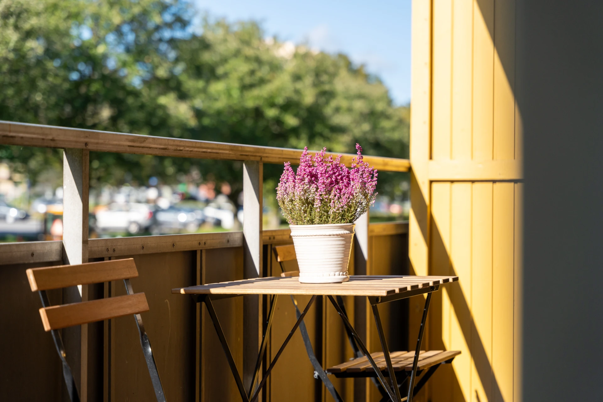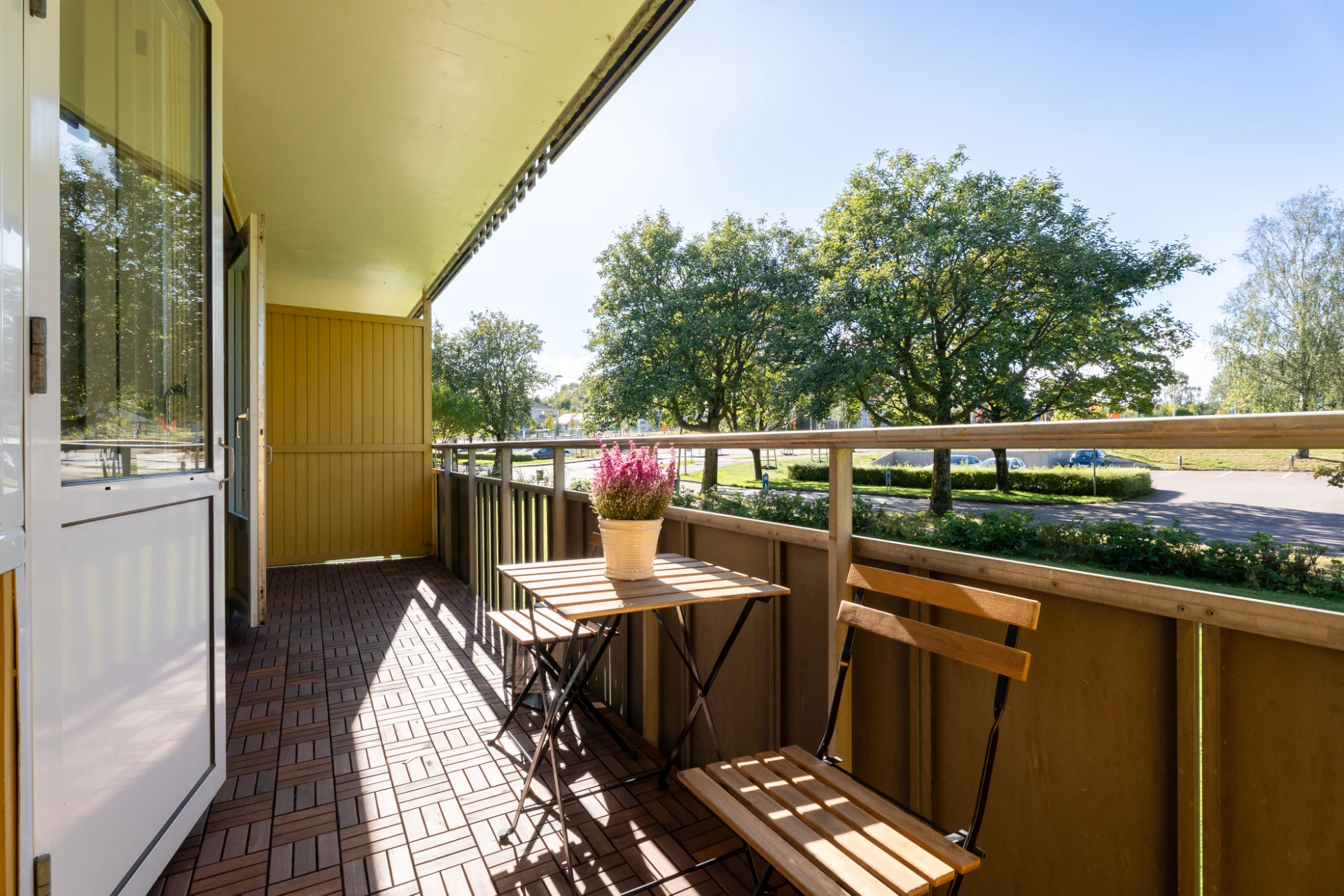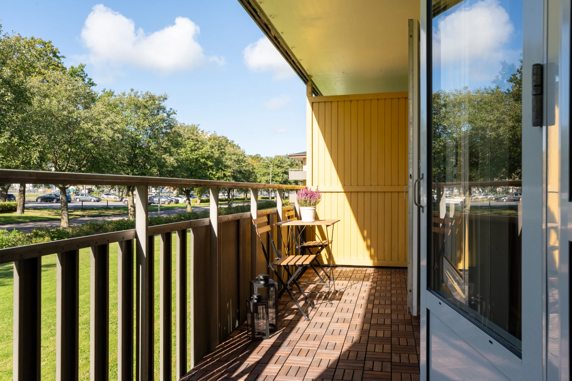 Generös balkong i västerläge med trallgolv om ca 9 m². Här finns plats för cafemöbler och solstolar.