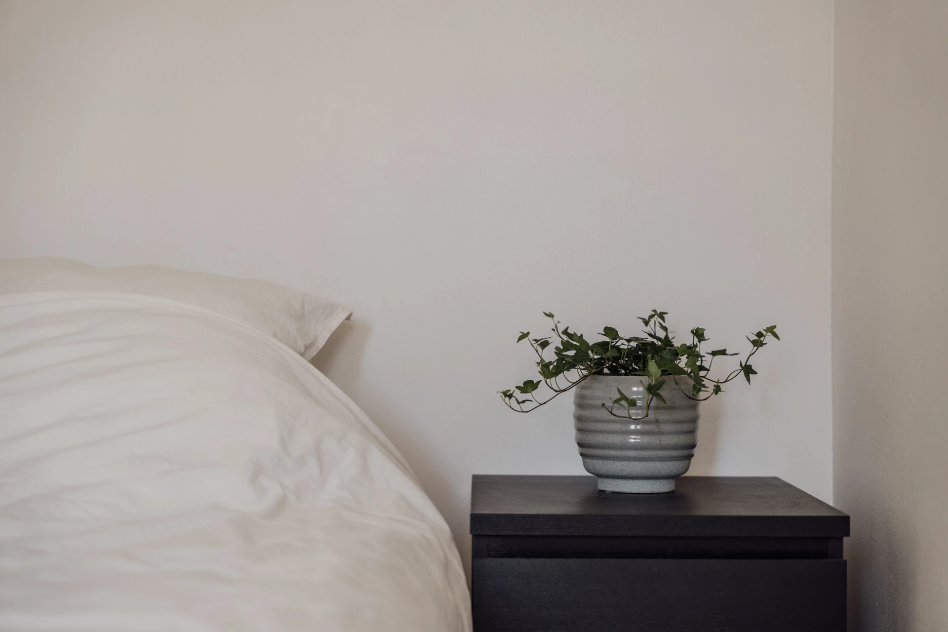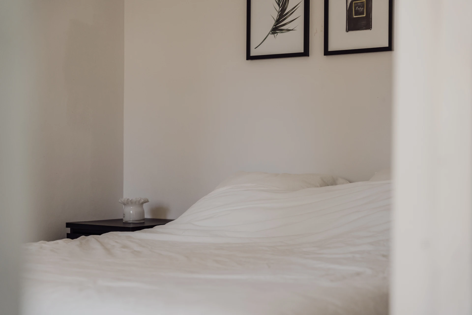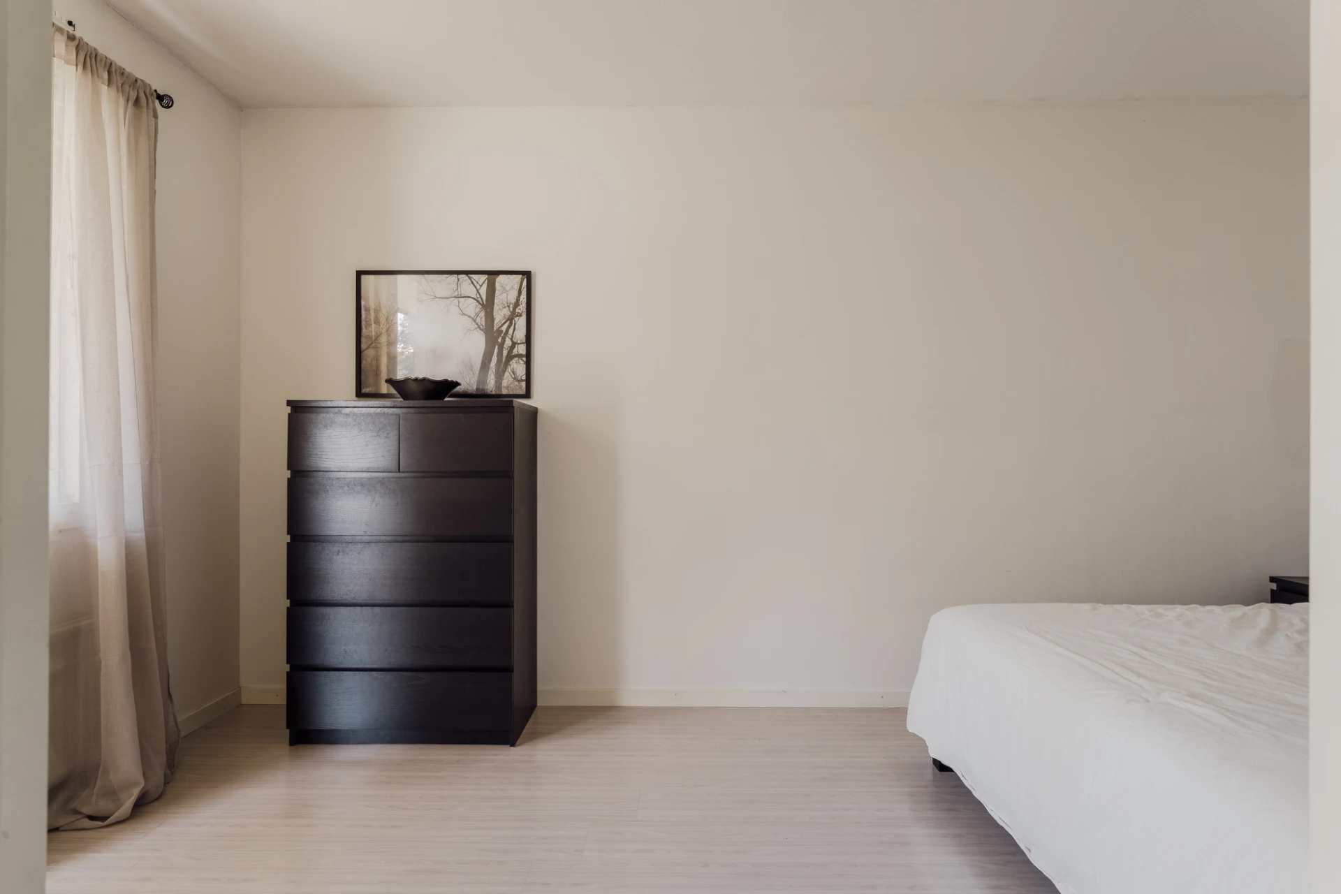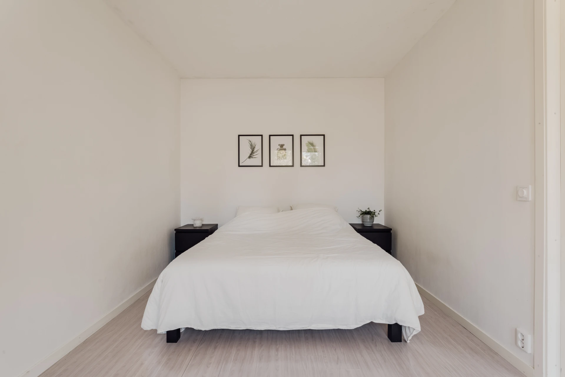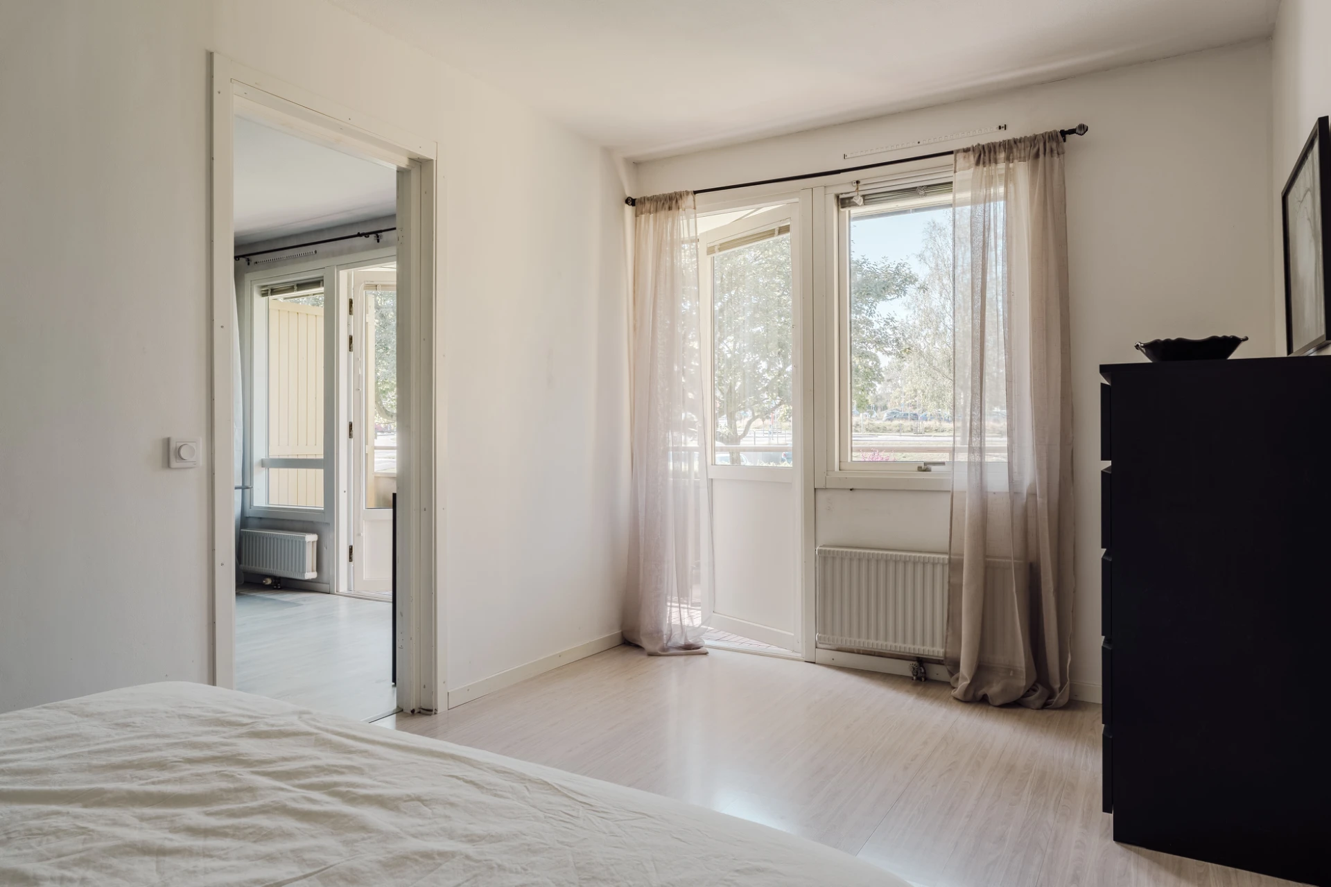 Laminatgolv och målade väggar. Här finns plats för dubbelsäng med tillhörande möblemang. Härifrån kan balkongen nås i västerläge.