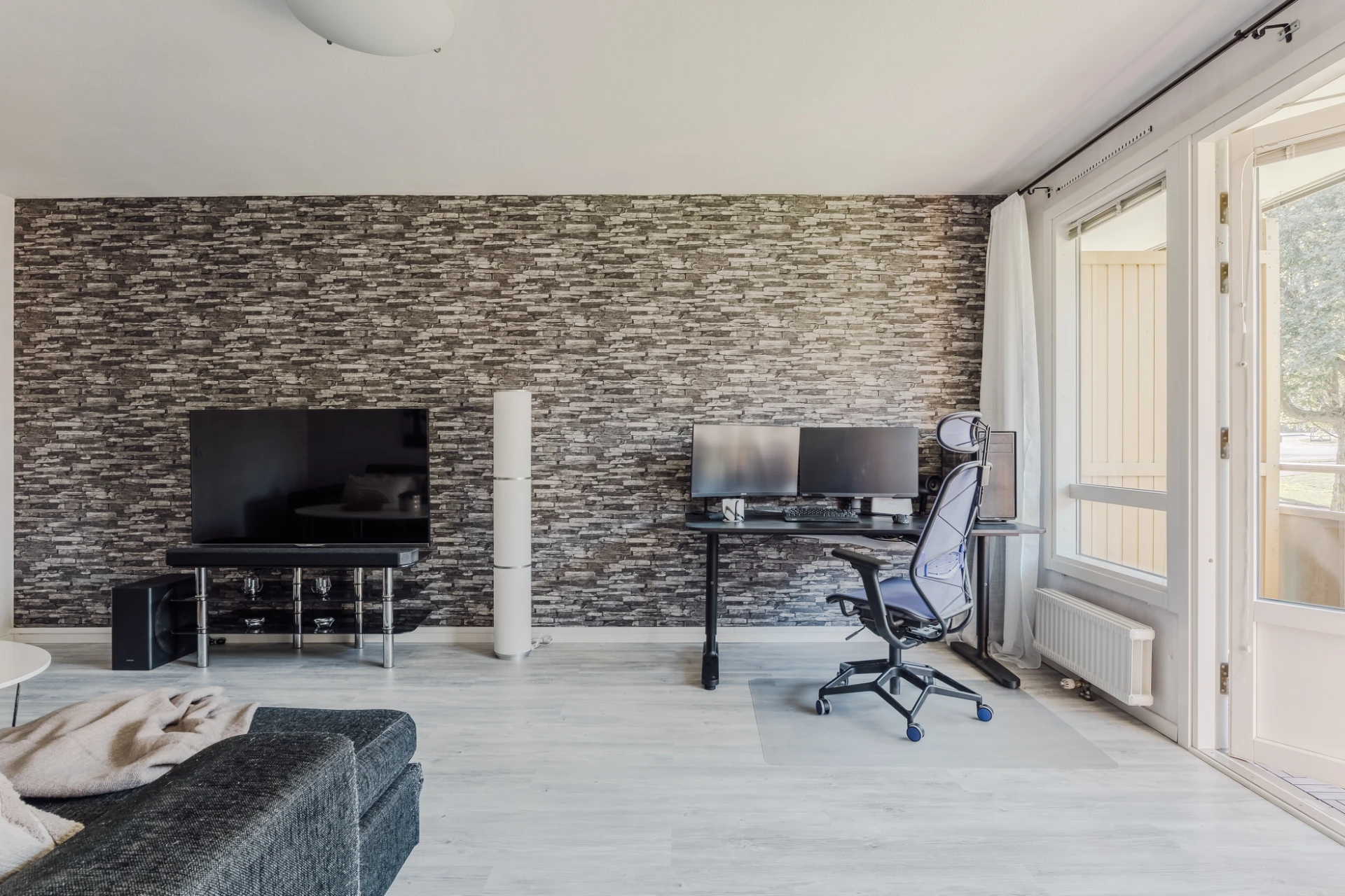 Laminatgolv och delvist målade/tapetserade väggar. Här finns plats för soffgrupp med tillhörande möblemang samt mindre matsalsdel/skrivbord. Härifrån kan balkongen nås i västerläge.