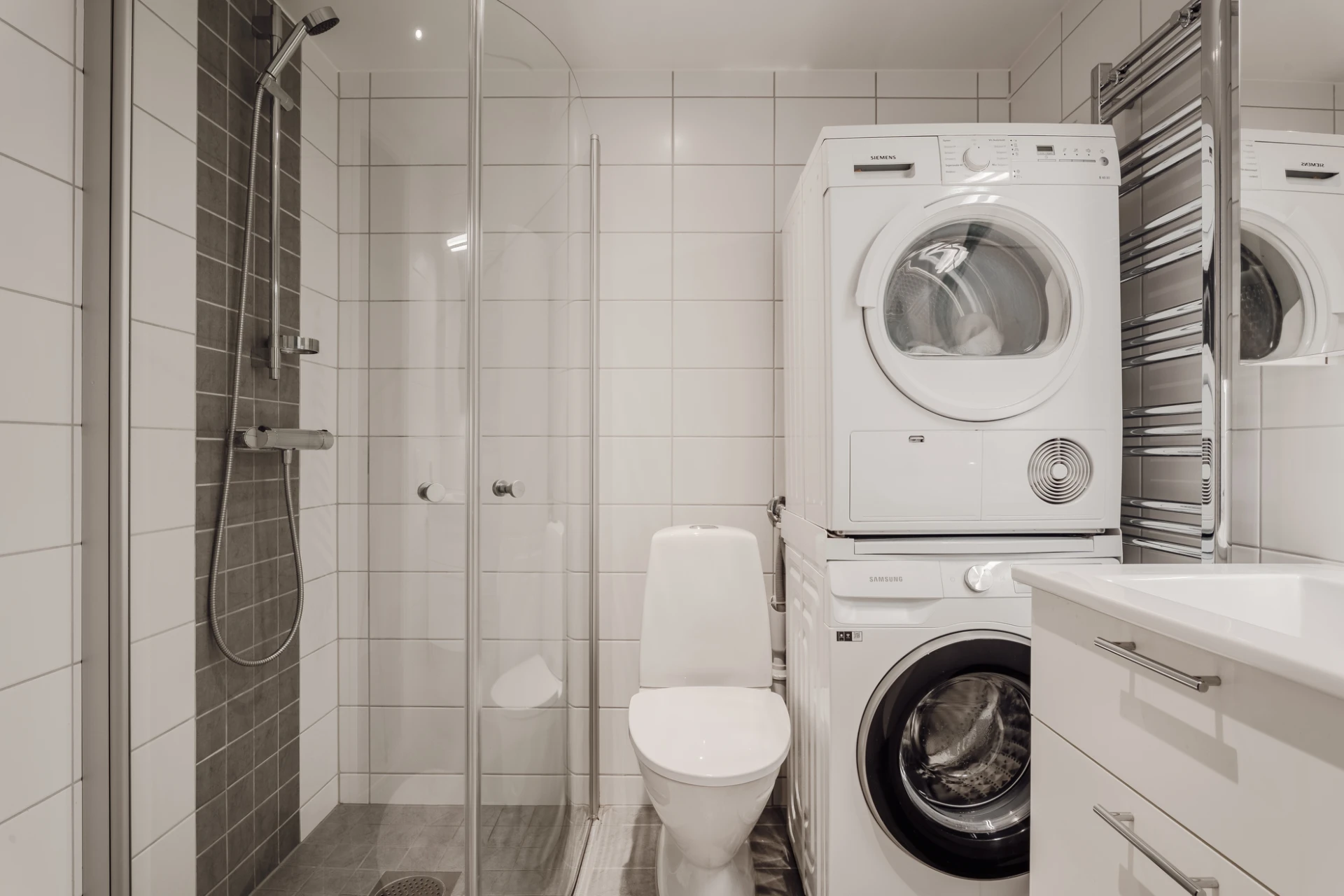 Klinkergolv och helkaklade väggar. Badrummet är utrustat med WC, takdusch med vikbara glasdörrar, handfat med kommod, spegel, handdukstork samt tvättmaskin (Samsung) och torktumlare (Siemens). Belysning genom spottar i taket.