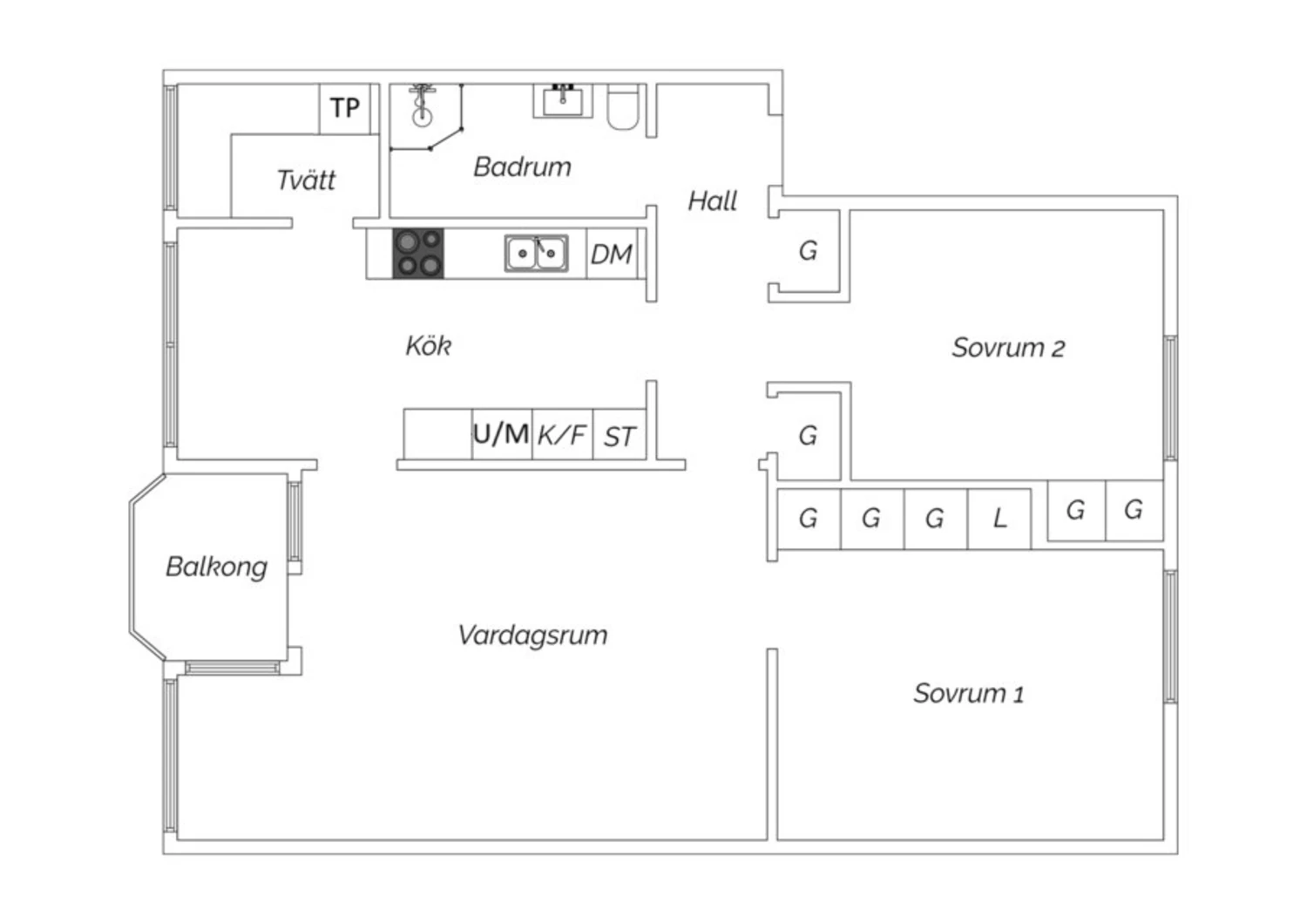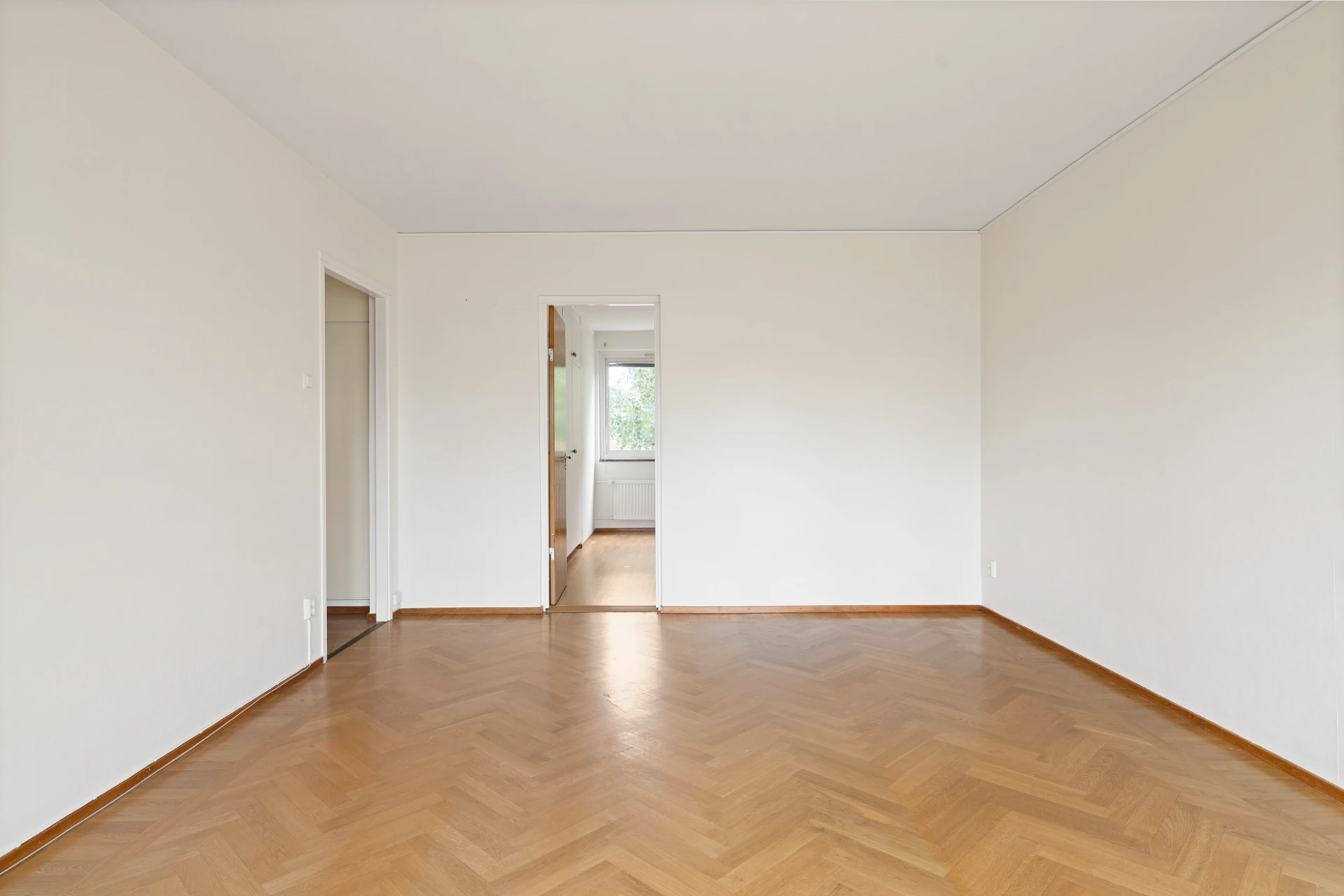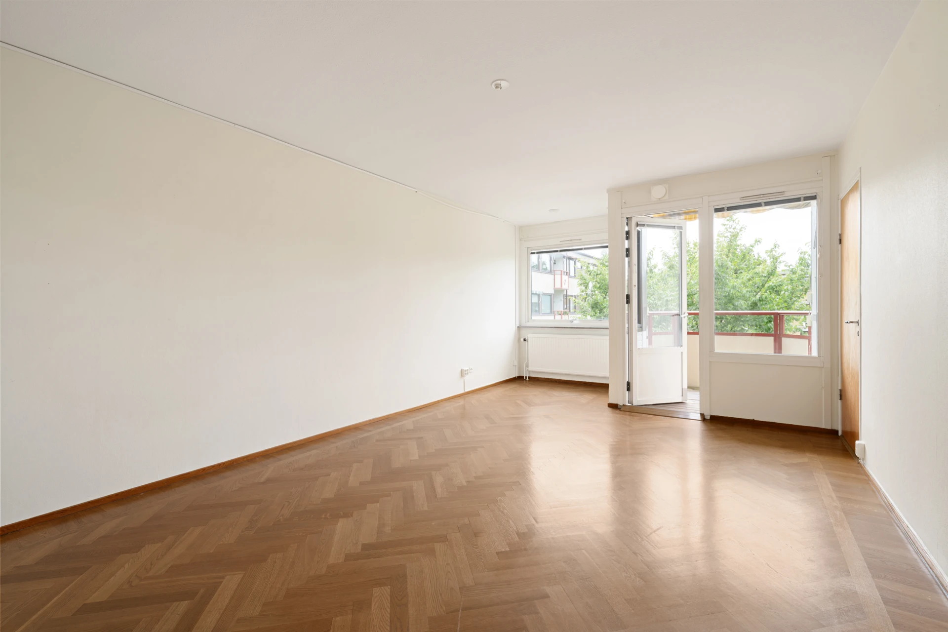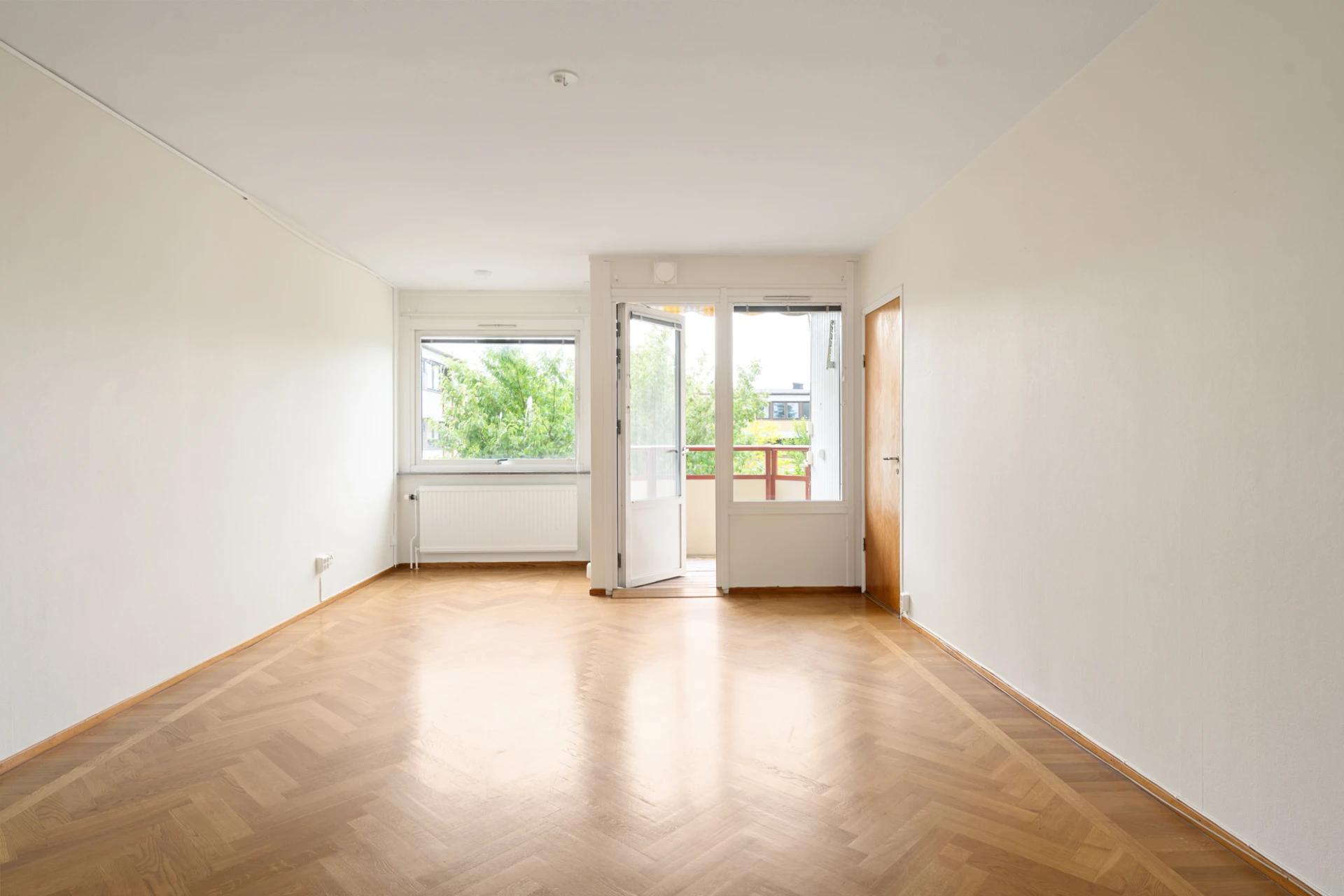 Fiskbensparkett och ljusa väggar. Här finns plats för soffgrupp med tillhörande möblemang samt matsalsbord. Utgång till bostadens balkong med plats för utemöbler.