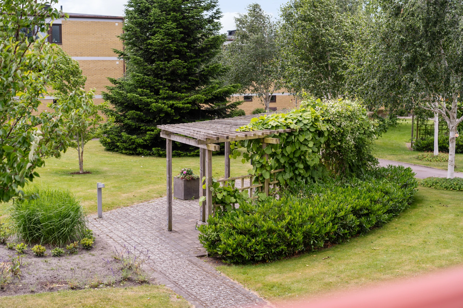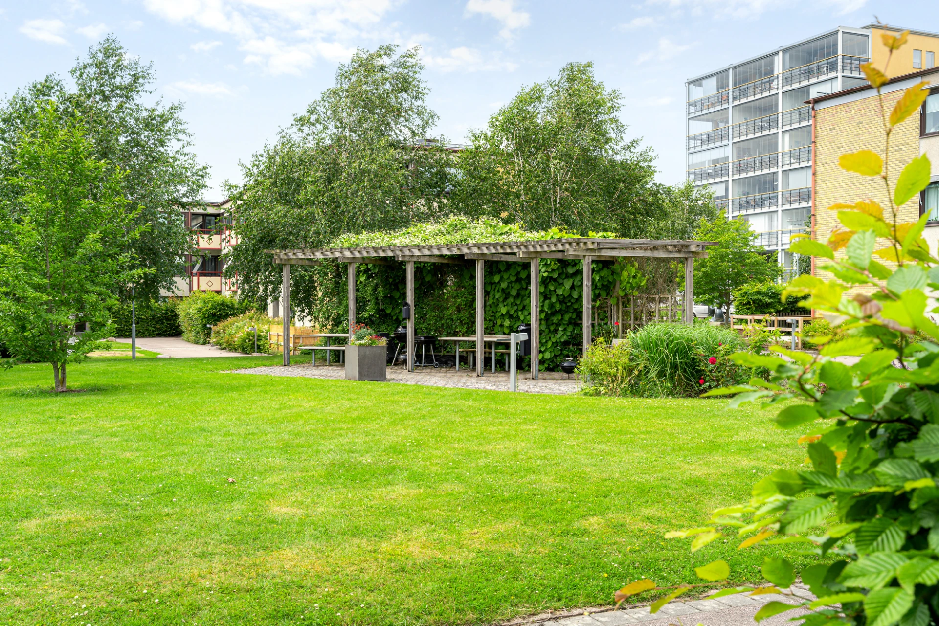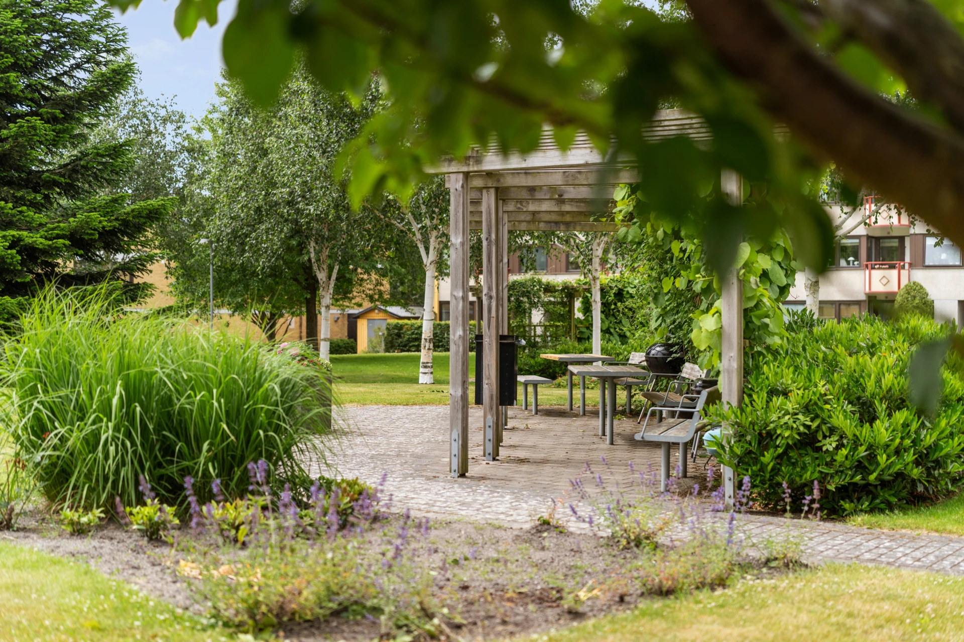 Gemensamma grönskande gårdar med utemöbler, lekplatser och boulebana.