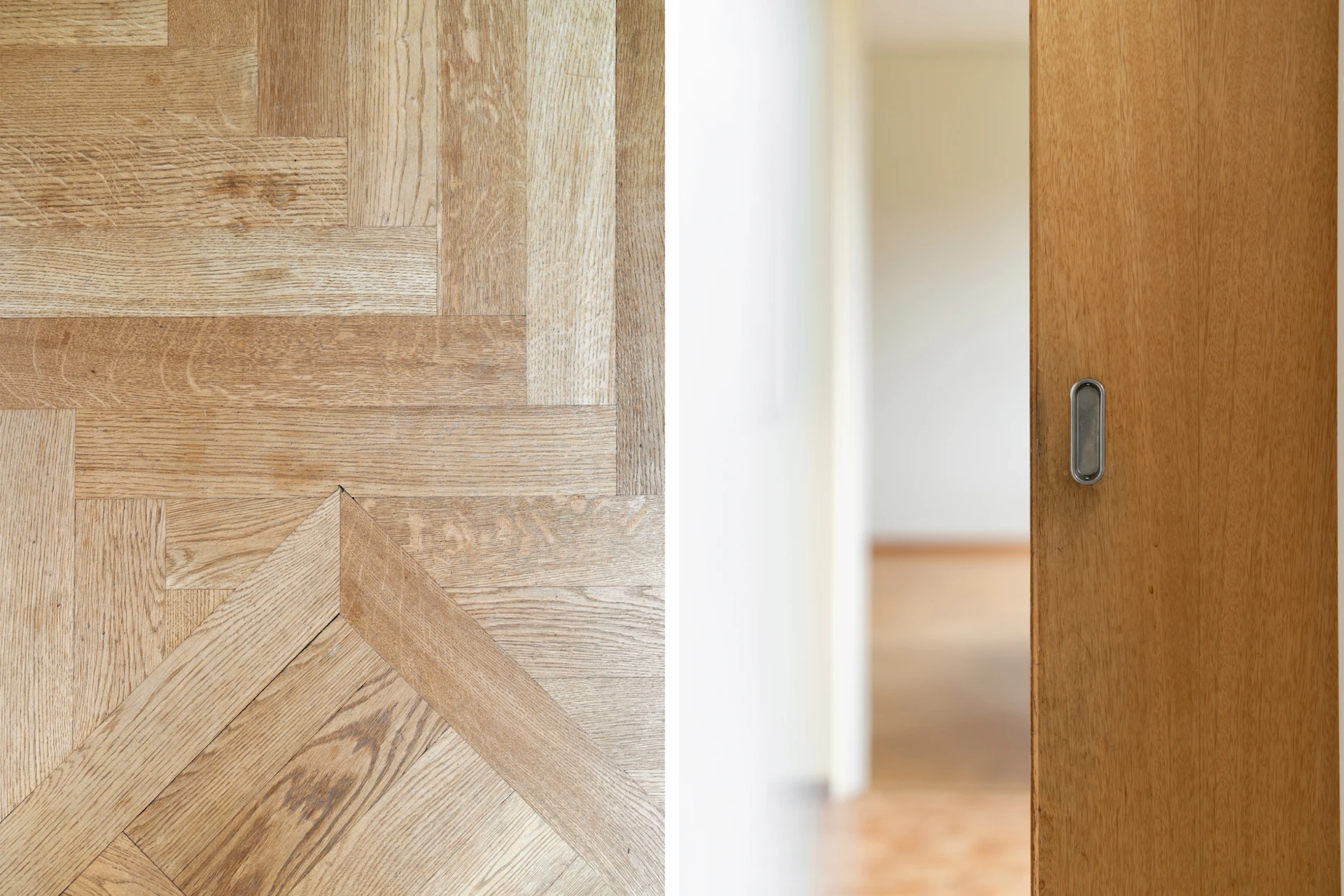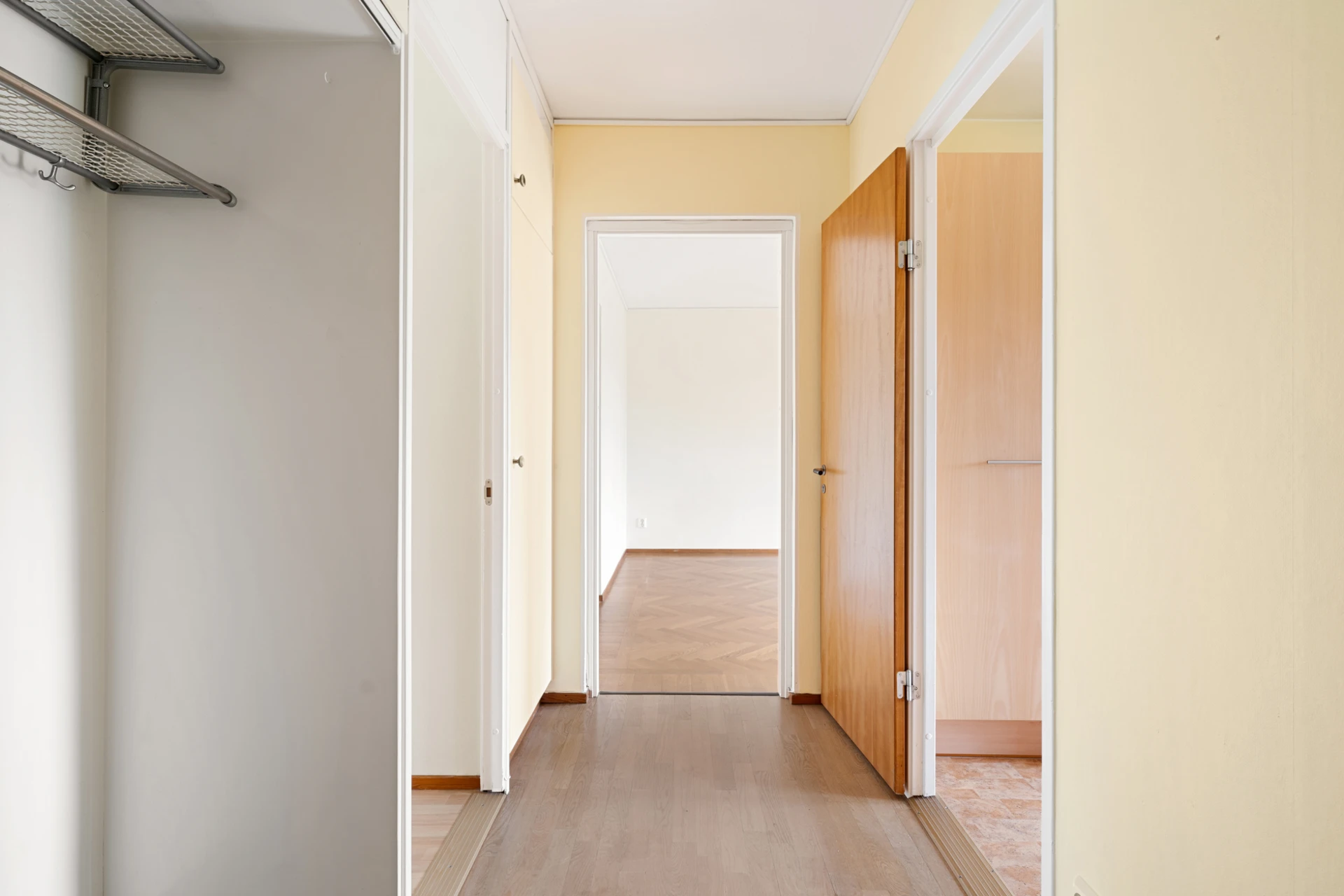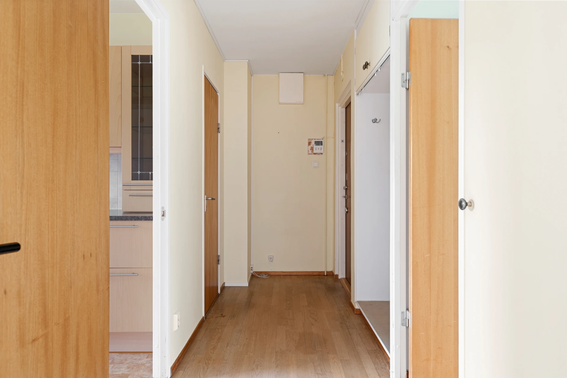 Parkettgolv och ljusgula väggar. Här finns plats för avhängning samt förvaring i inbyggda garderober.
