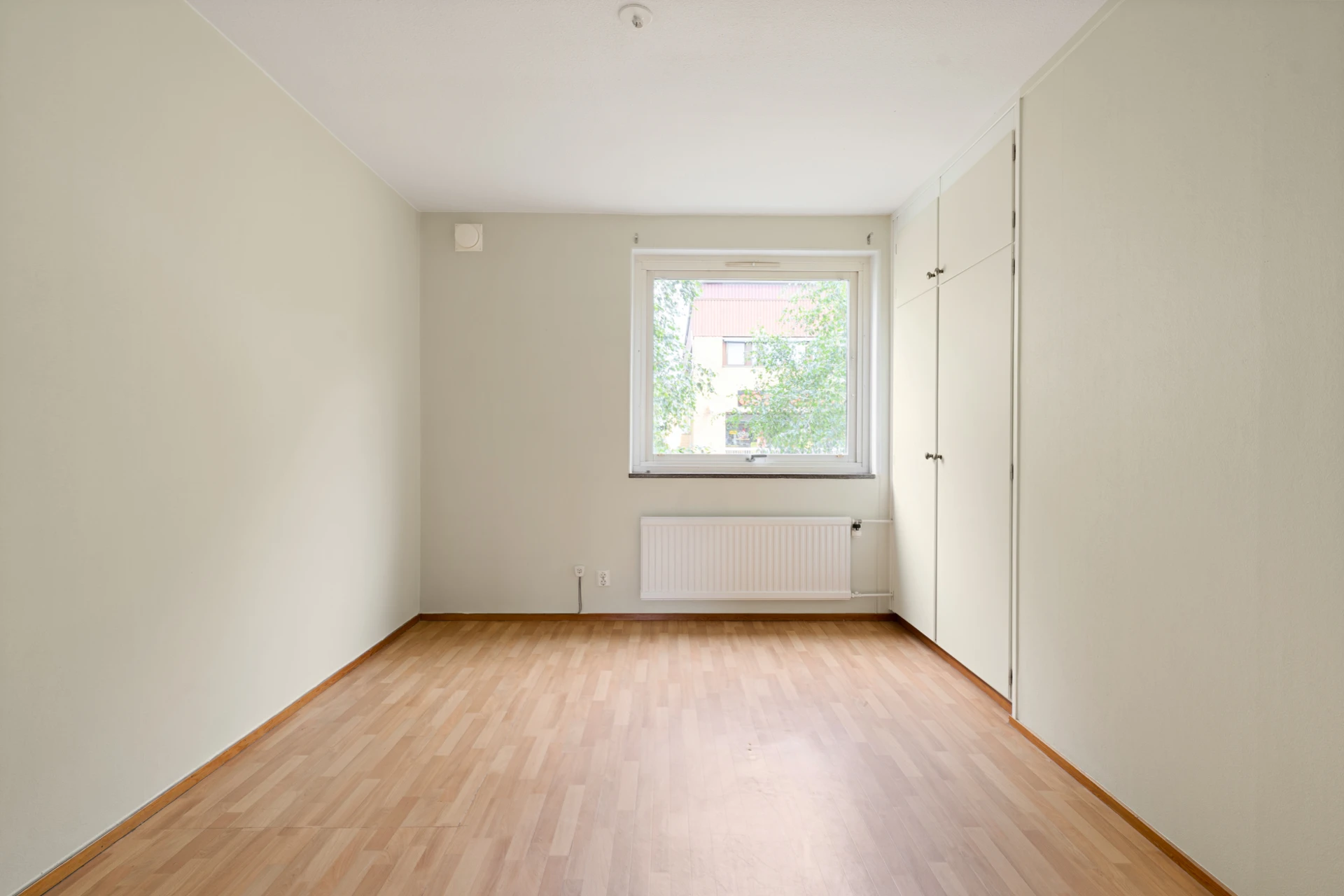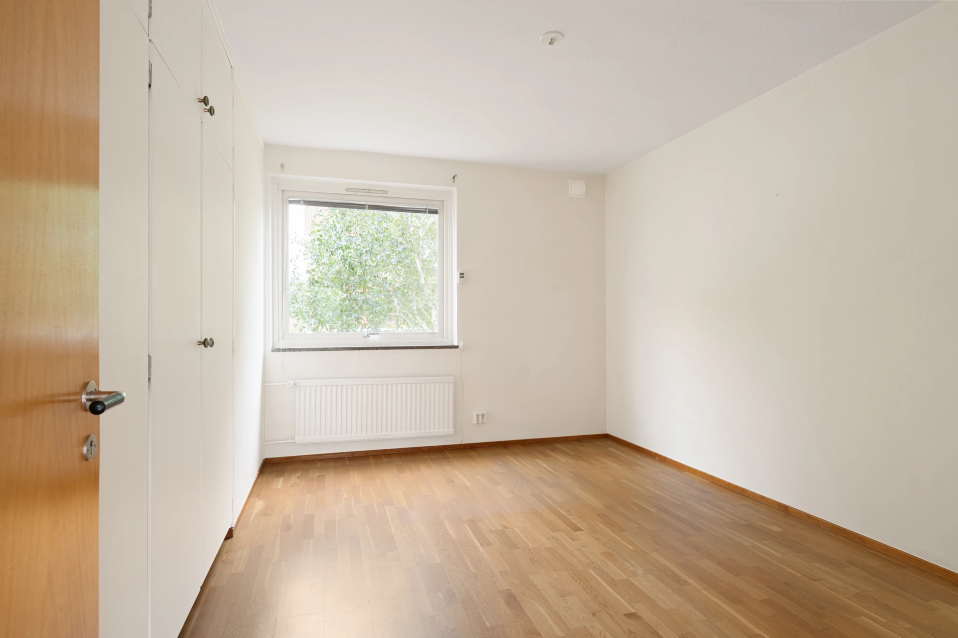 Parkettgolv och ljusa väggar. Här finns plats för dubbelsäng med tillhörande möblemang. Förvaring i inbyggda garderober.