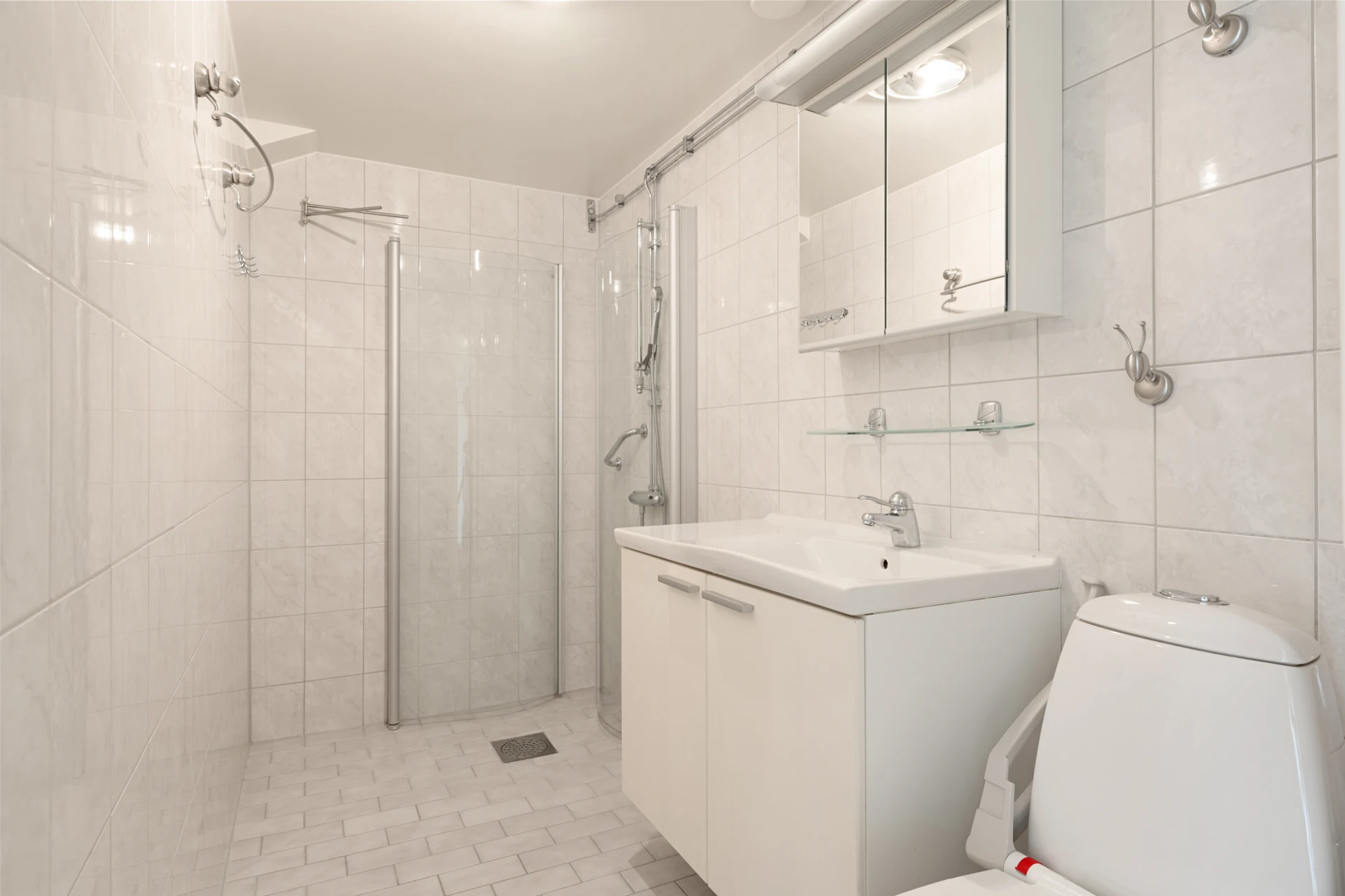 Ljust klinkergolv och ljust helkaklade väggar. Badrummet är utrustat med WC, handfat med kommod, spegelskåp samt dusch.