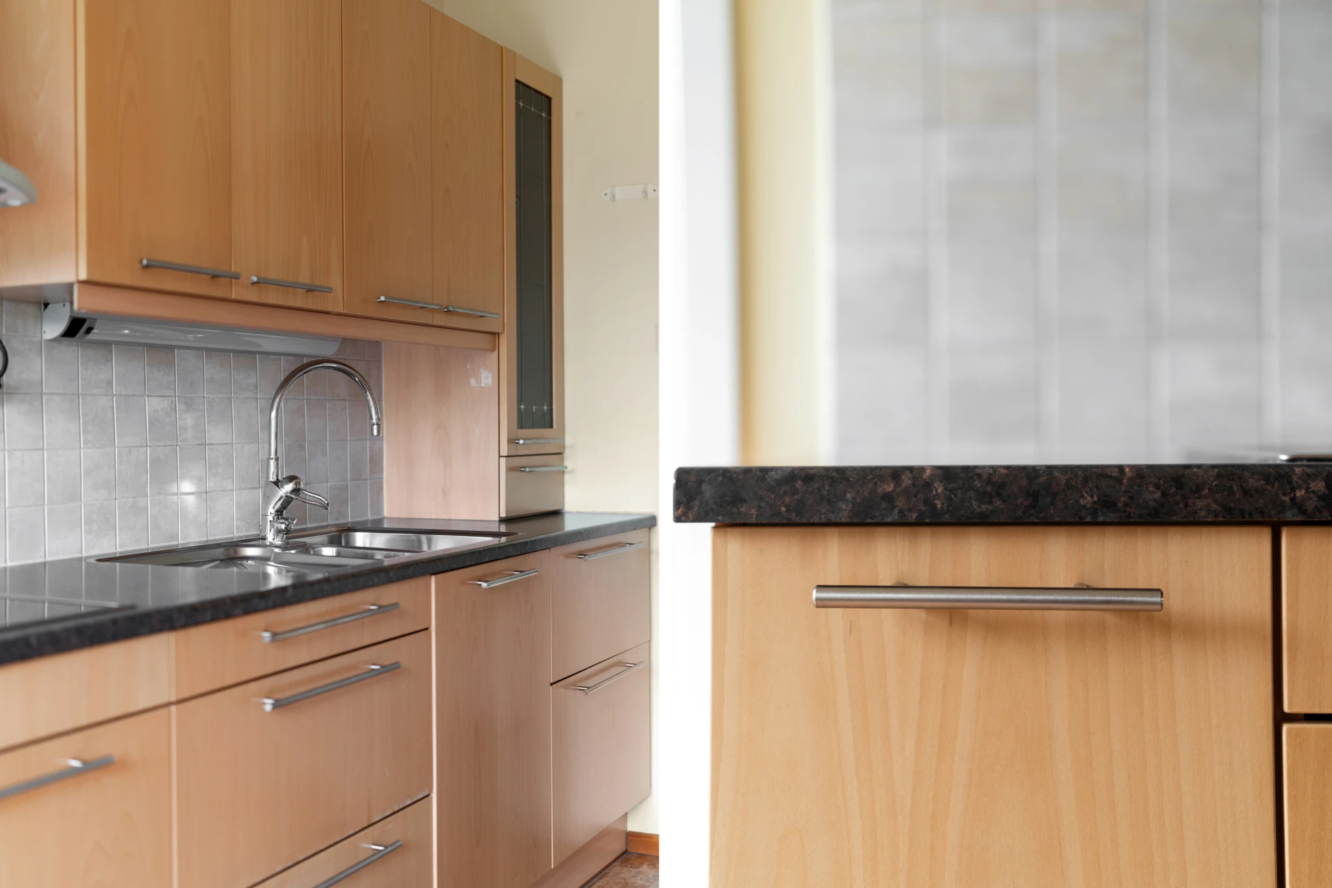 Plastmatta och ljusgula väggar. Köksinredning i trä och ovanför bänkskivan i laminat sitter grått kakel. Köket är utrustat med kombinerad kyl/frys, spishäll, inbyggd ugn, köksfläkt, inbyggd mikro och diskmaskin. Matplats för ca 4-6 personer.