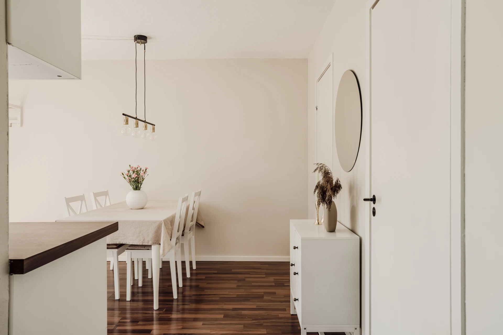 Laminatgolv och målade väggar. Här finns plats för avhängning.