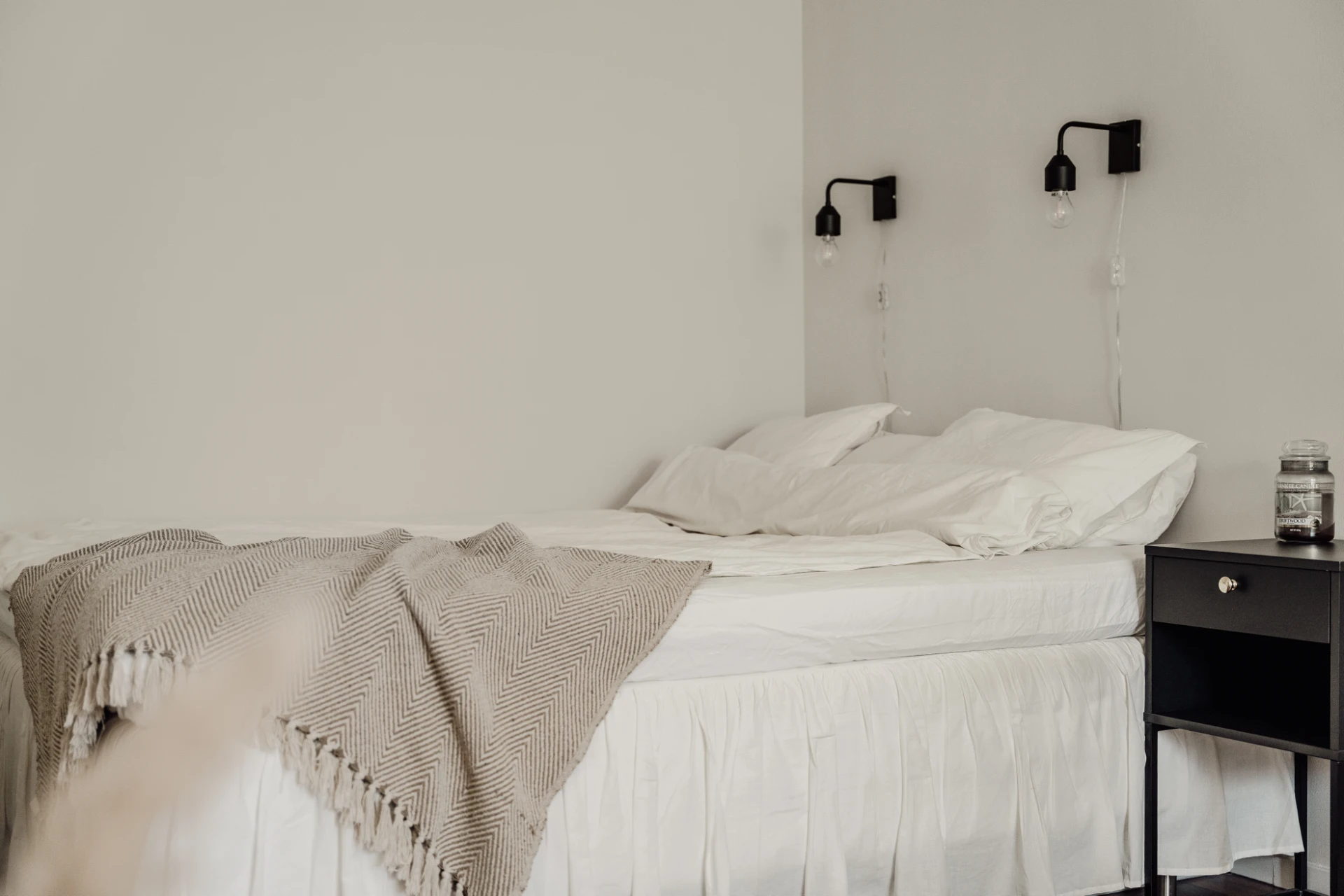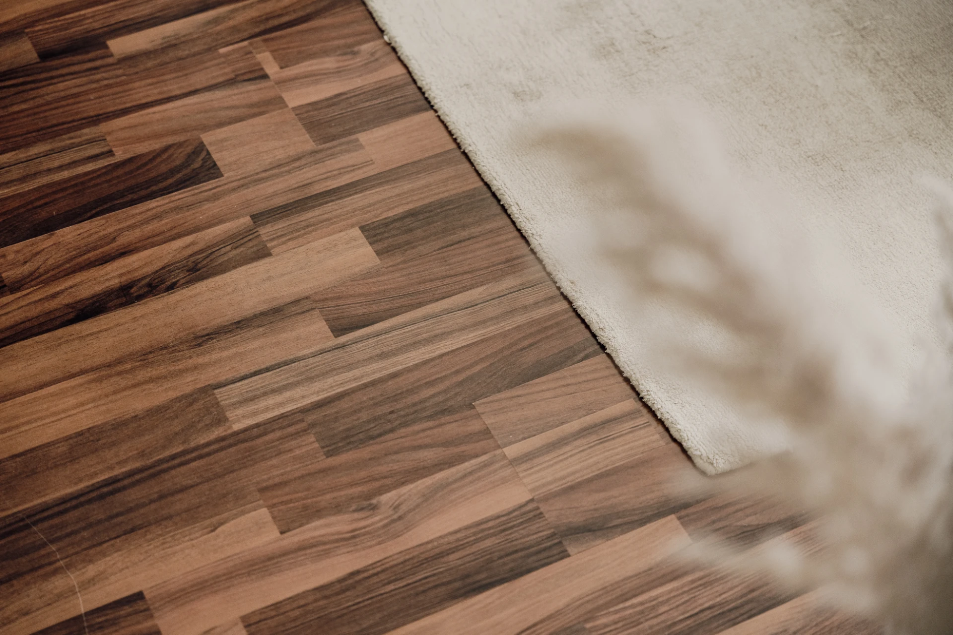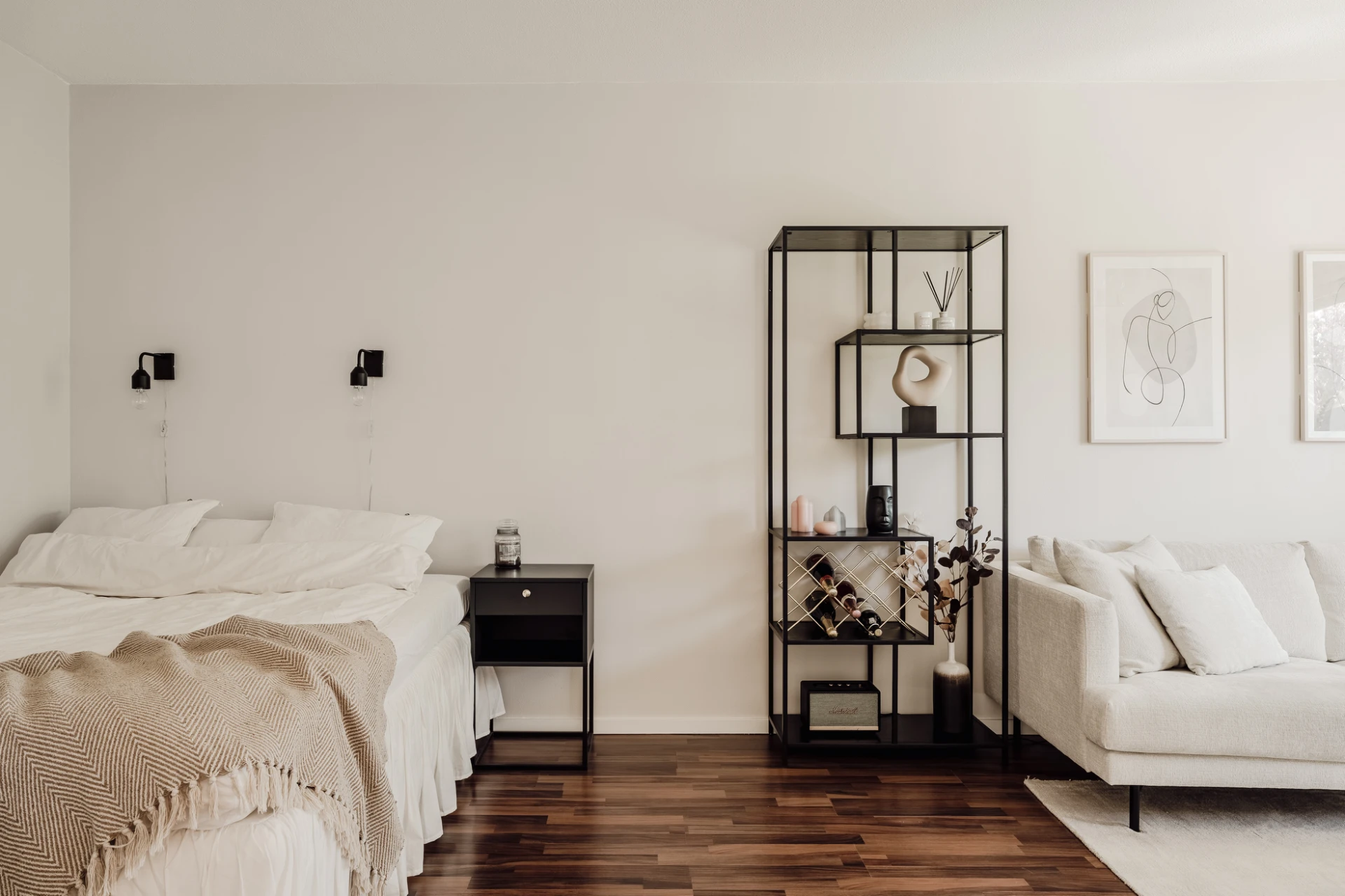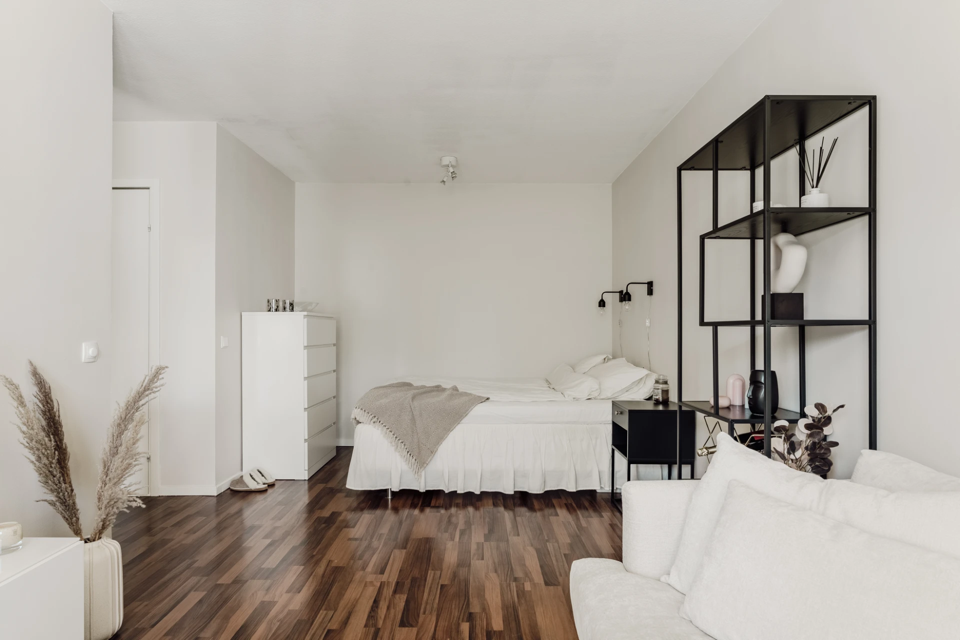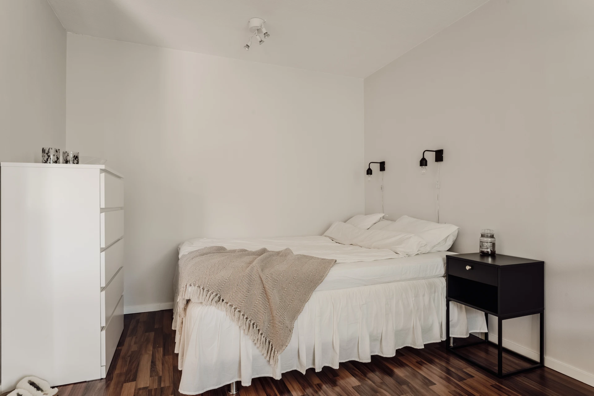 Laminatgolv och målade väggar. Plats för säng och tillhörande möblemang (en del av vardagsrummet).