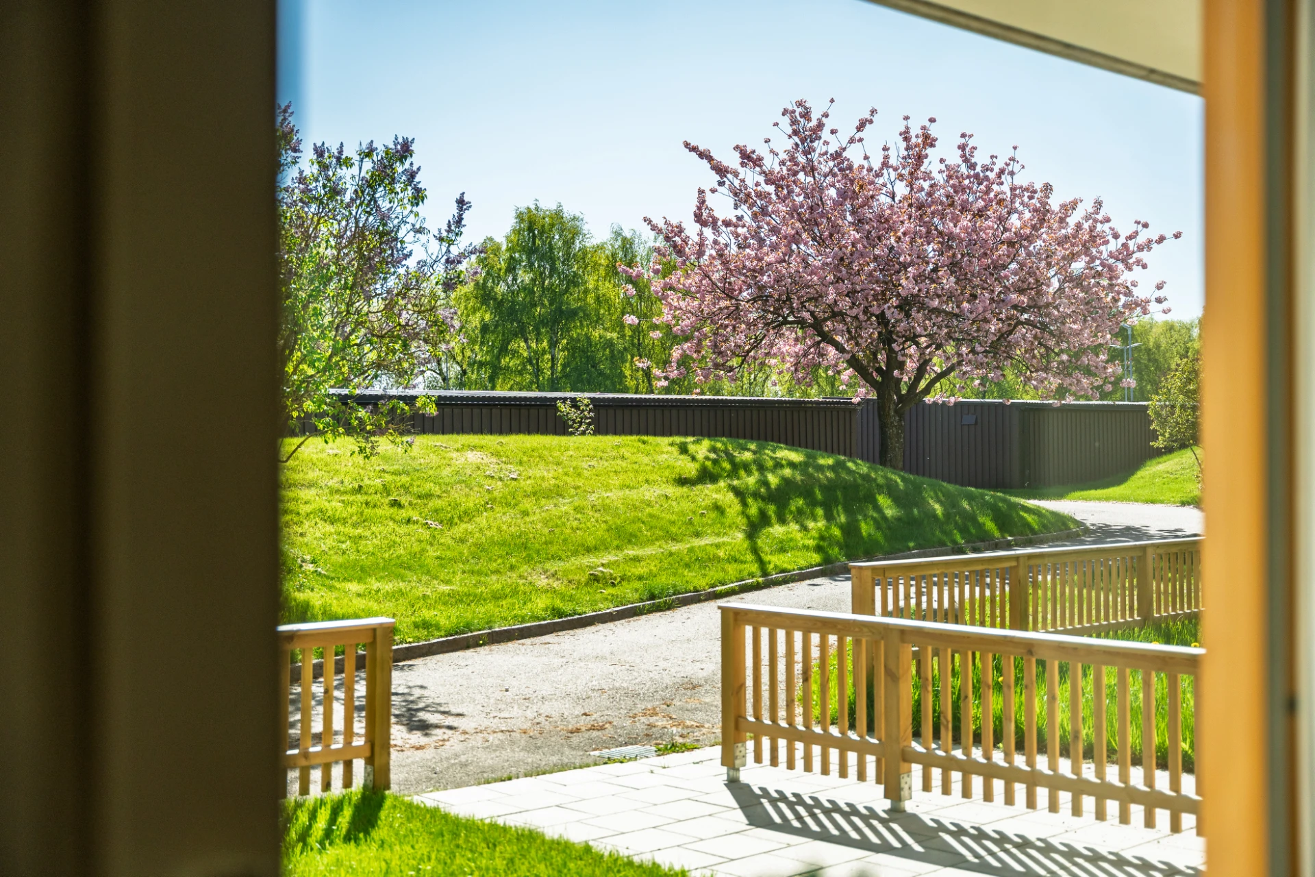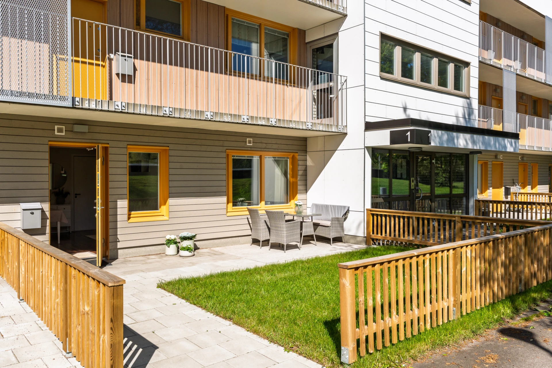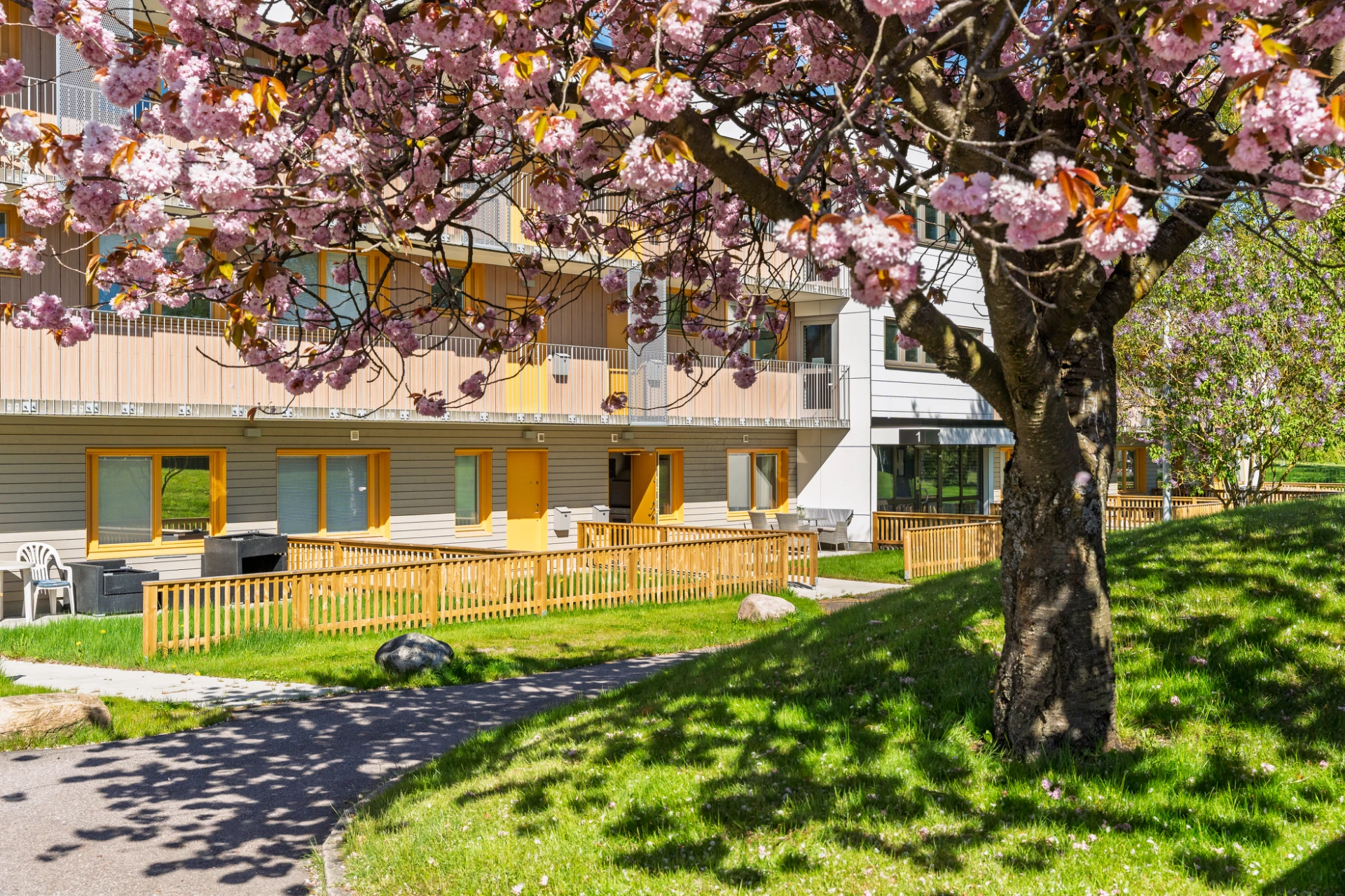 Gemensamma innergårdar med utemöbler, grillplatser och lekplatser.