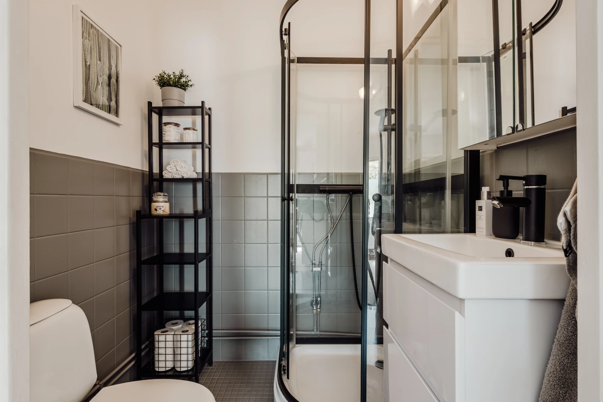 Badrummet är snyggt och praktiskt med WC, kommod och en duschkabin. Bostadens klädkammaren erbjuder god förvaring i flertal garderober.