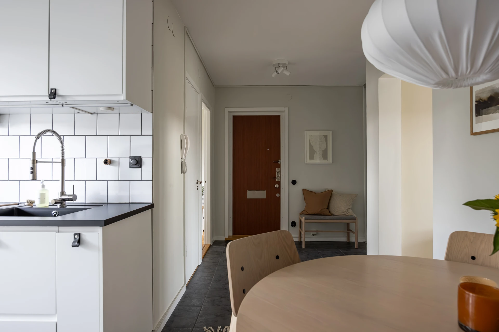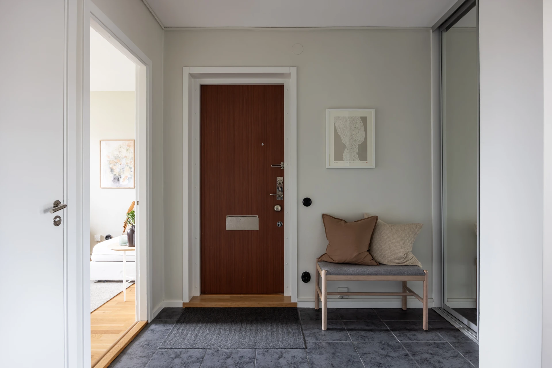 Grått klinkergolv och väggar i beige kulör. Här finns plats för avhängning samt förvaring i en skjutdörrsgarderob. Lägenheten är utrustad med säkerhetsdörr.
