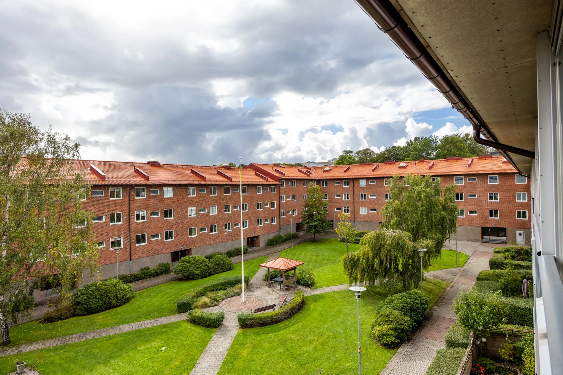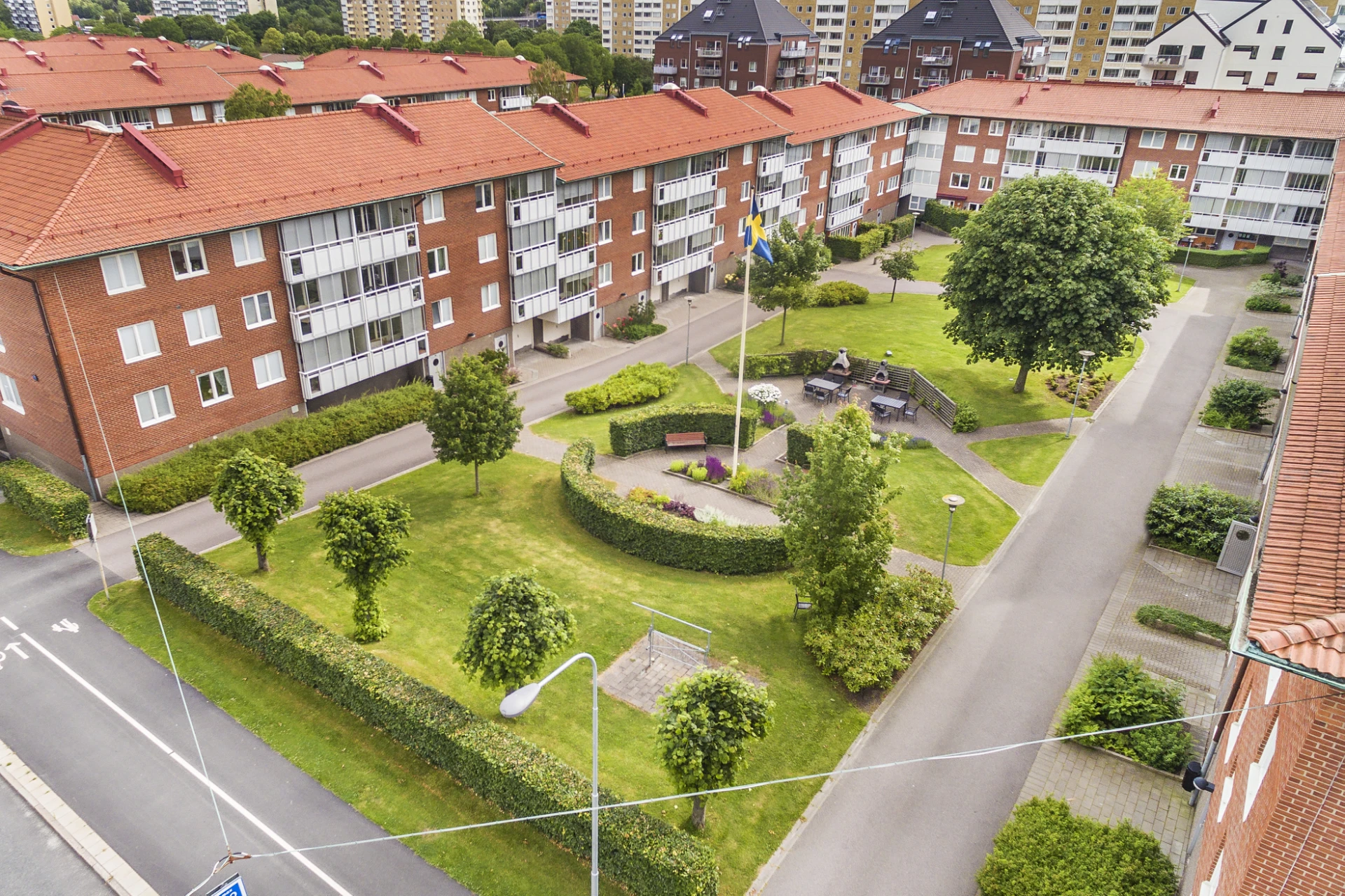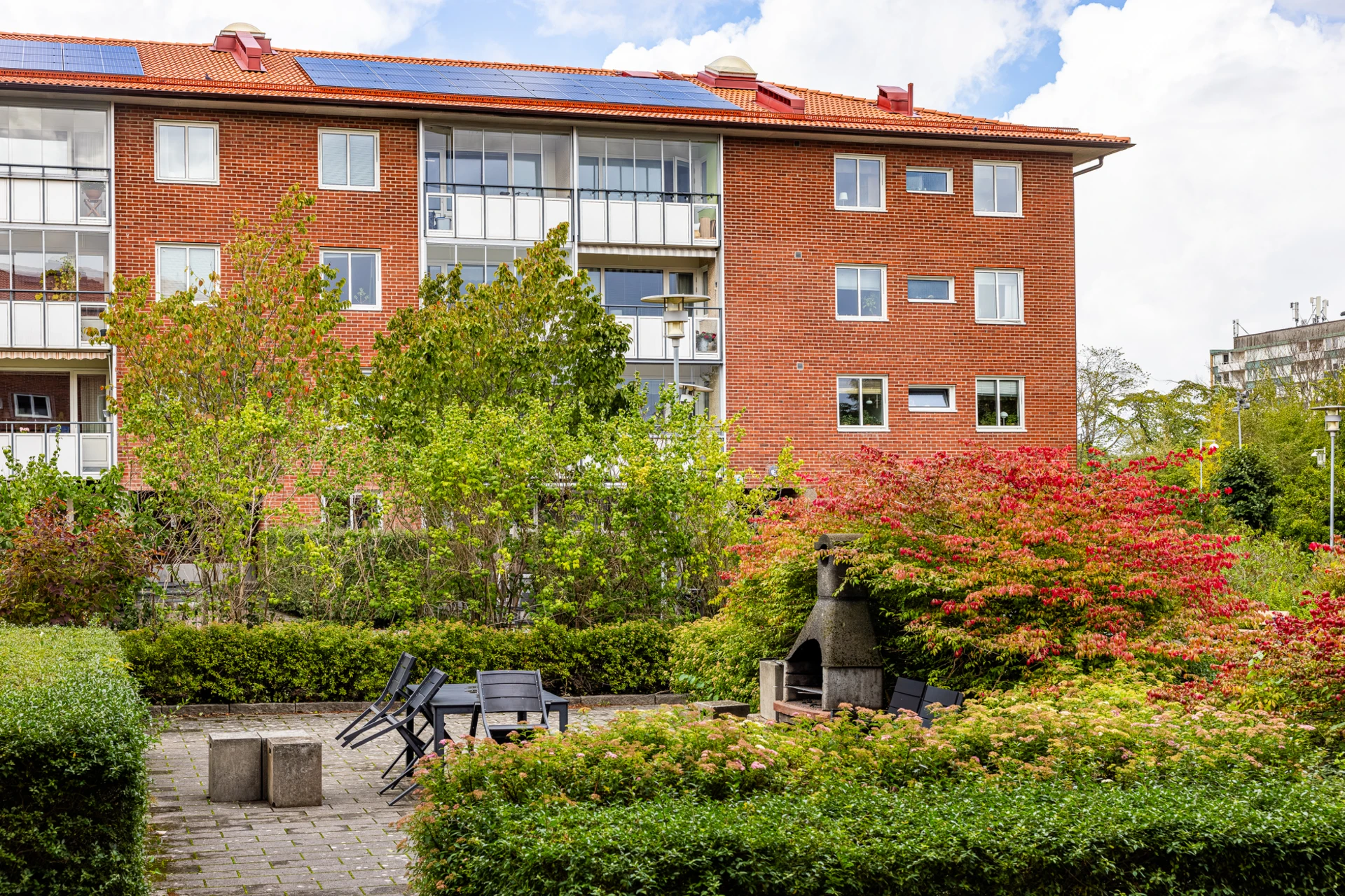 Flera stora renoverade innergårdar med grill, utemöbler, lekplatser och ett lusthus.