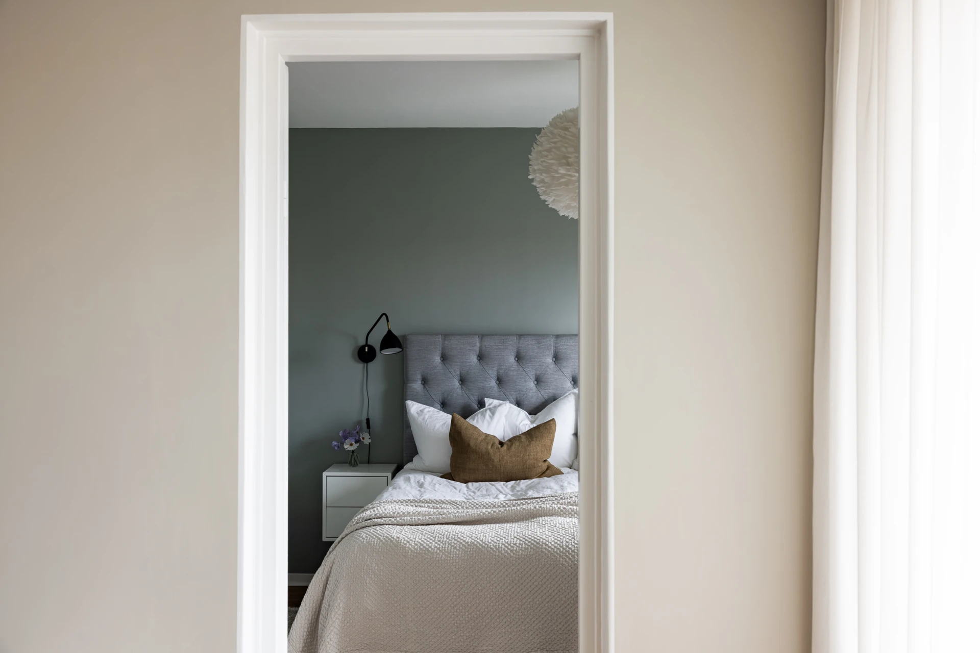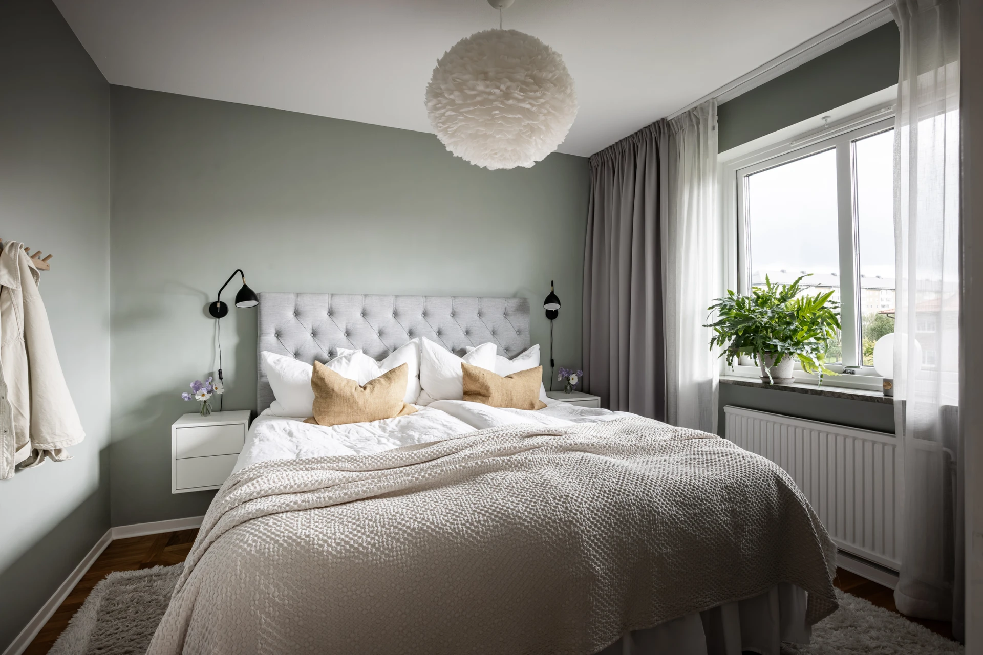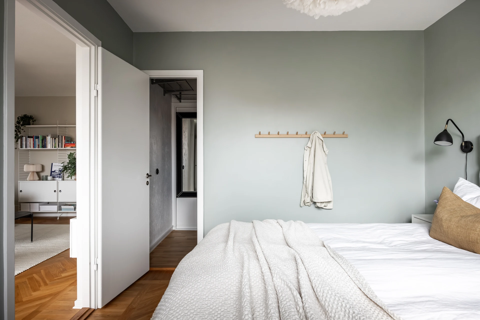 Fiskbensparkett och väggar i grön kulör. Här finns plats för dubbelsäng med tillhörande möblemang. Förvaring i en rymlig klädkammare.