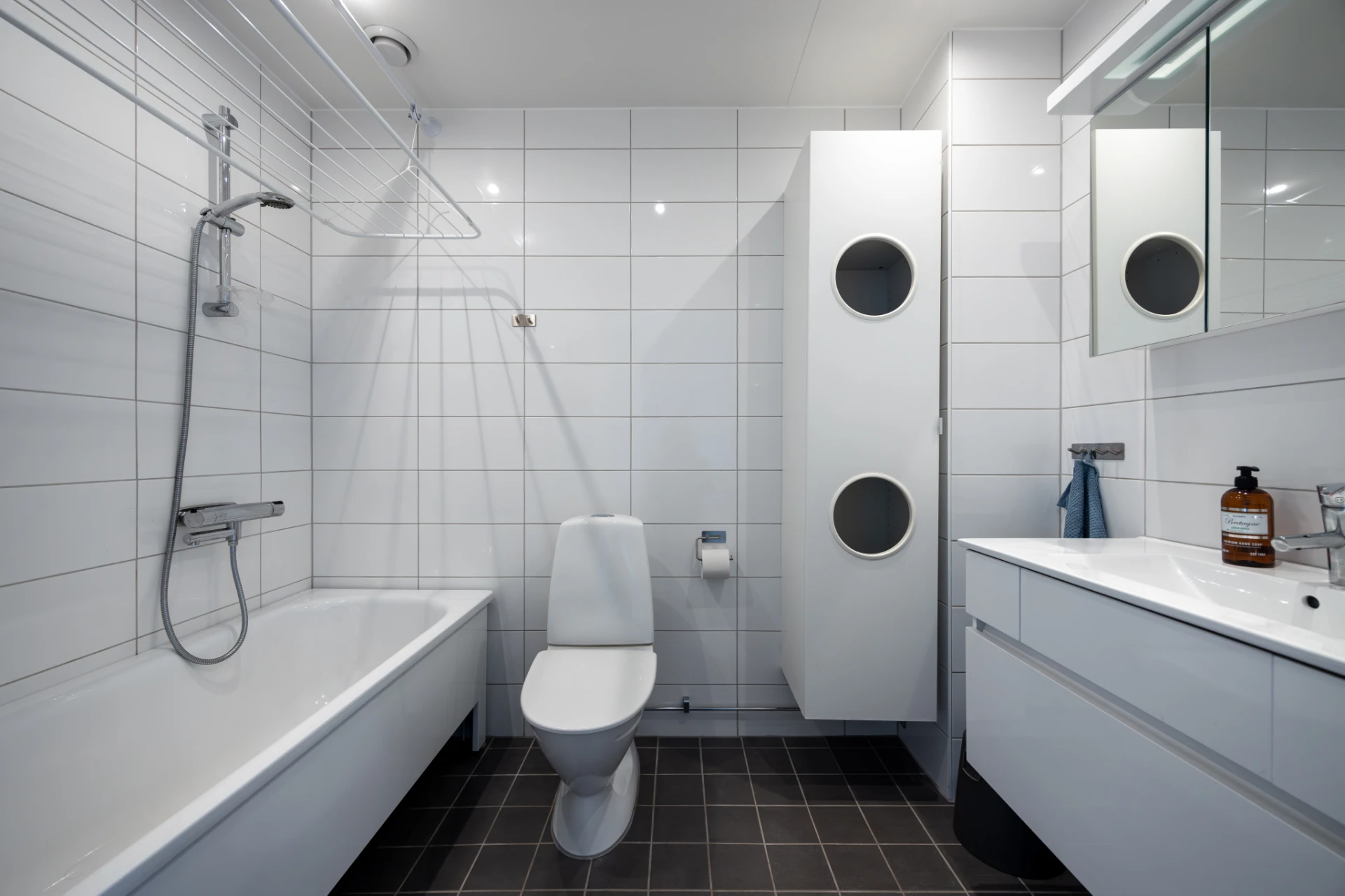 Grått klinkergolv med underliggande golvvärme och vita helkaklade väggar. Här finns WC, handfat med kommod, spegelskåp, badkar och handdukstork. I taket sitter spotlights med dimmerfunktion.