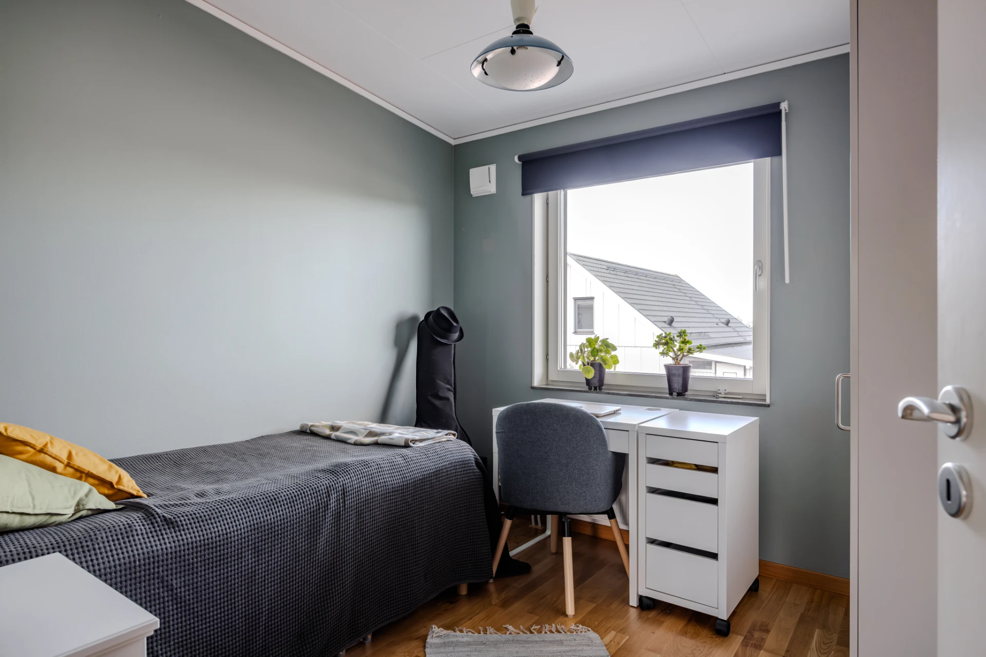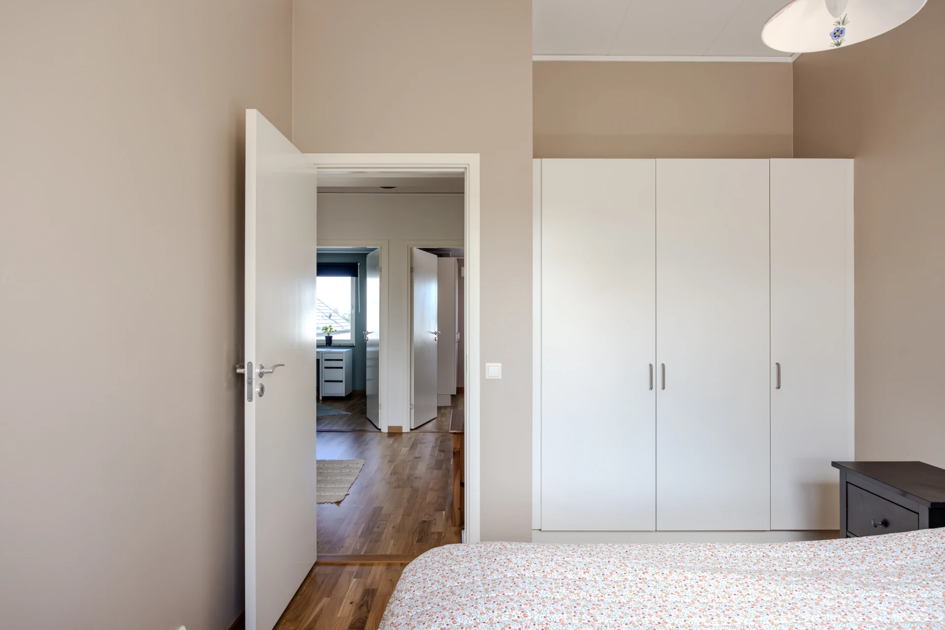 Parkettgolv och blå/gråmålade väggar. Här finns plats för säng med tillhörande möblemang. Förvaringsmöjligheter erbjuds i två garderober.