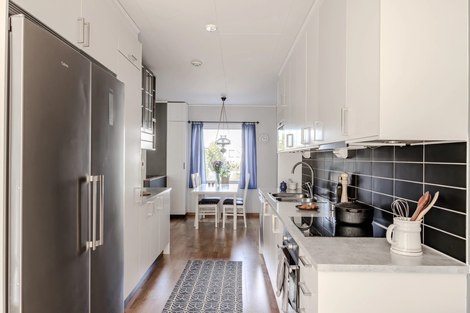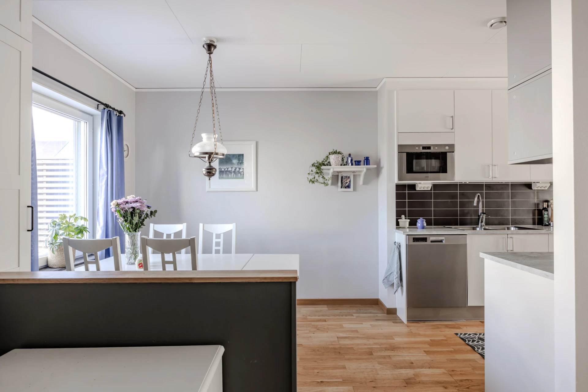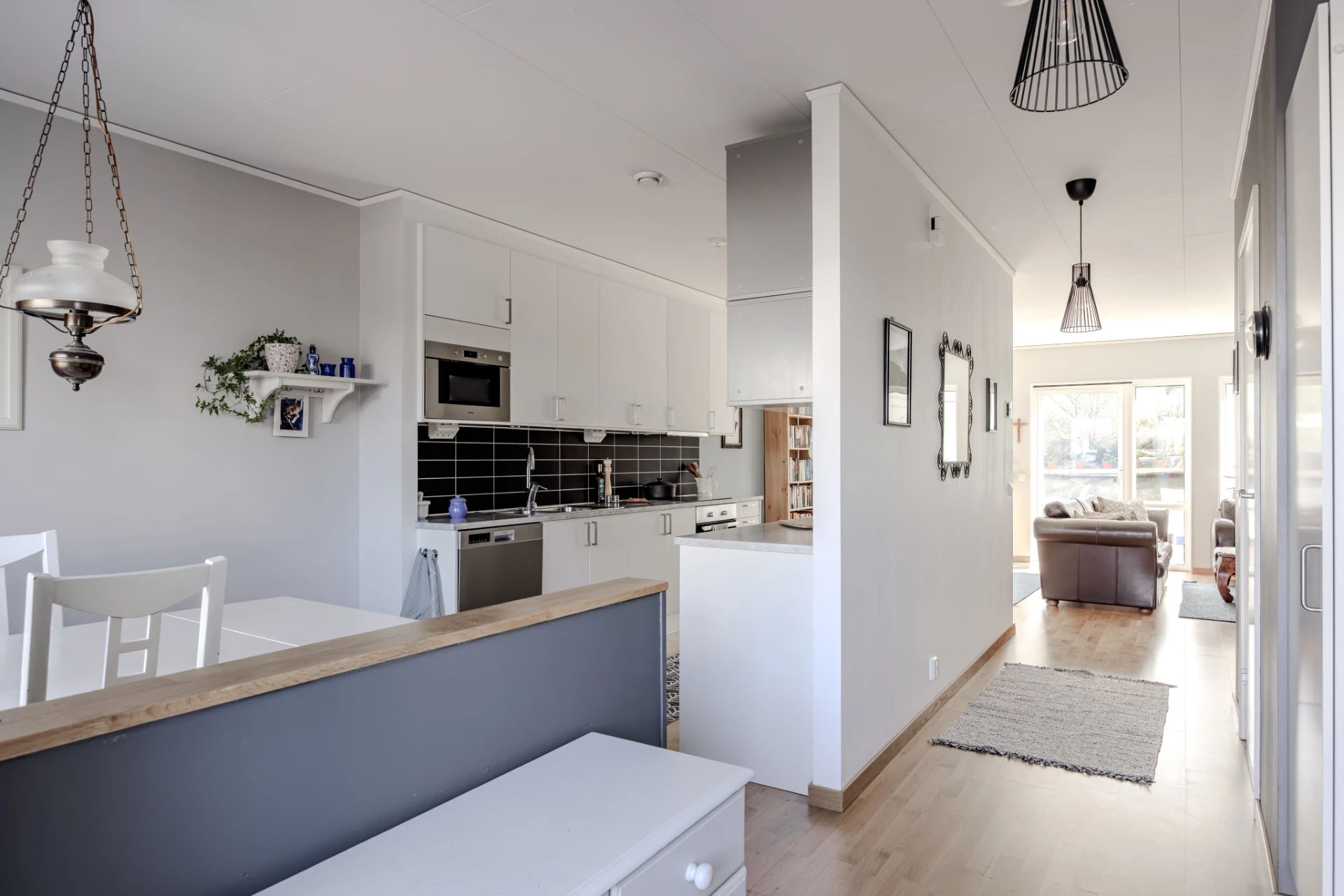 Parkettgolv med underliggande golvvärme och grå/vitmålade väggar. Köksinredning i vitt och grått, ovan bänkskivan i gråmelerad laminat sitter svart kakel. Den maskinella utrustningen består av kyl och frys i fullhöjd, induktionshäll, inbyggd ugn, fläkt, inbyggd mikro samt diskmaskin. Samtliga vitvaror från Cylinda 2018 förutom kylen som är från 2024. Förvaring sker i över- och underskåp samt extrainsatt vitrinskåp. Matplats för ca 4-6 personer intill köksfönstret. Delvis öppen planlösning mot vardagsrummet.