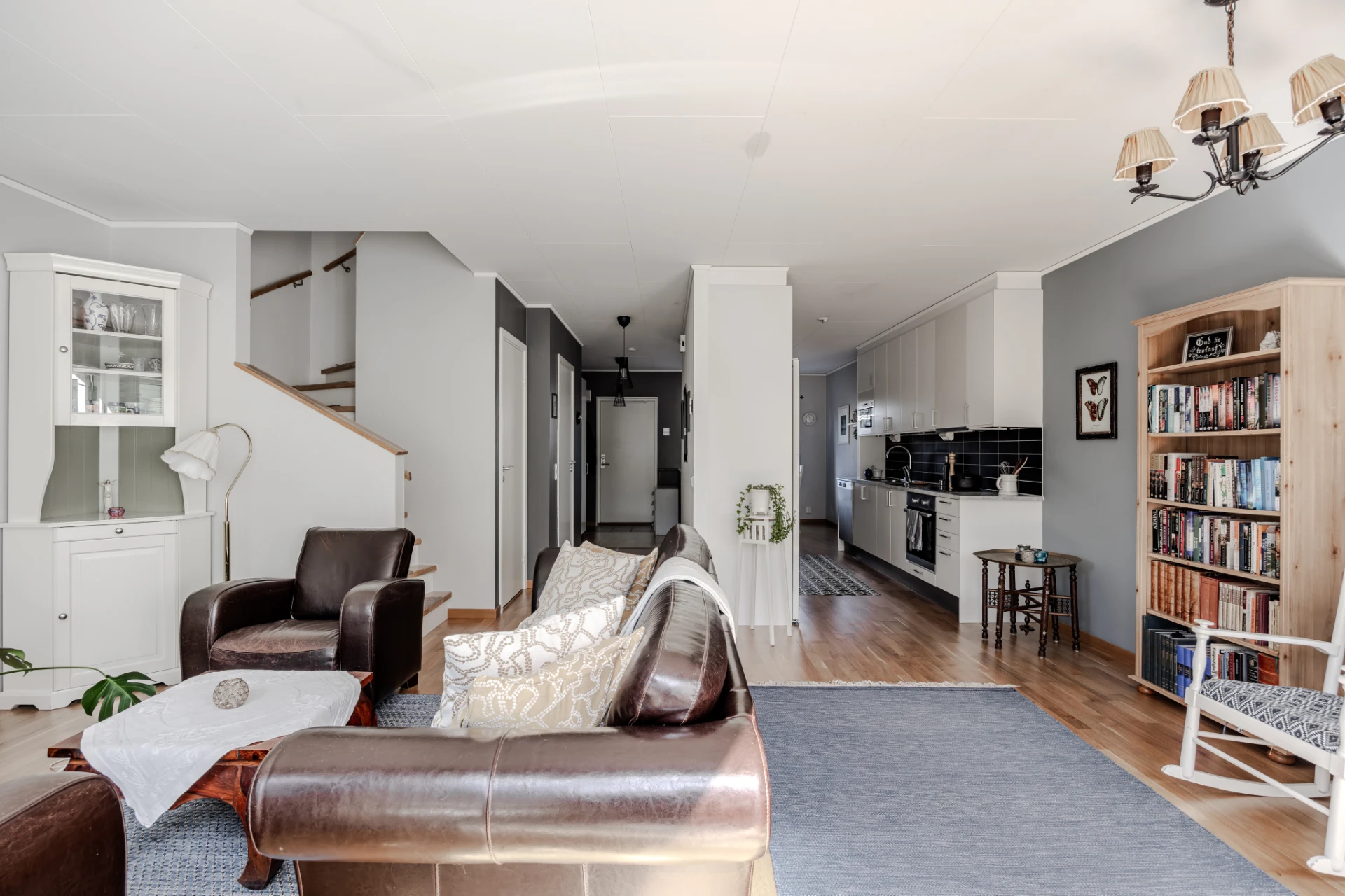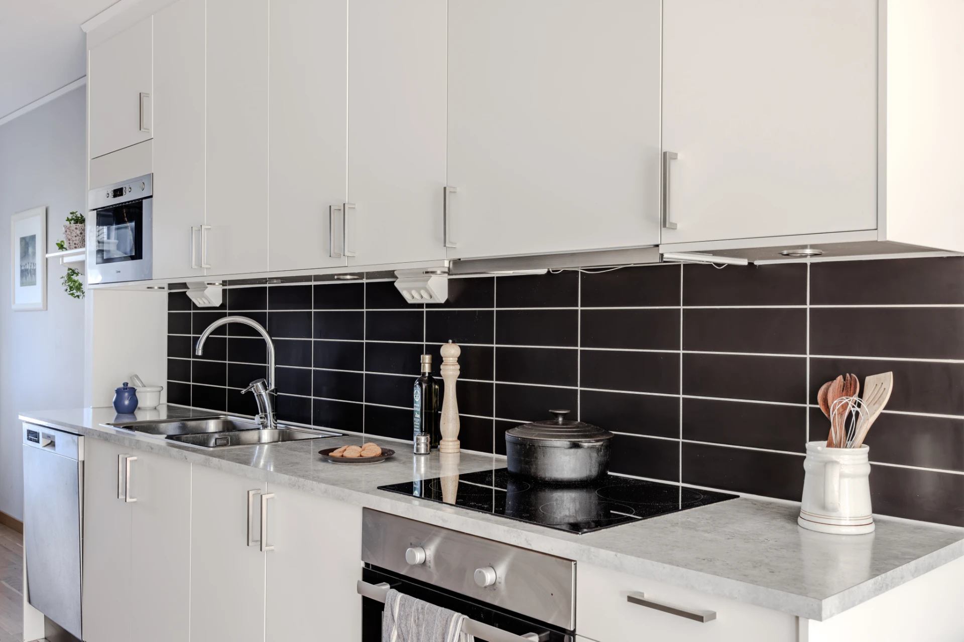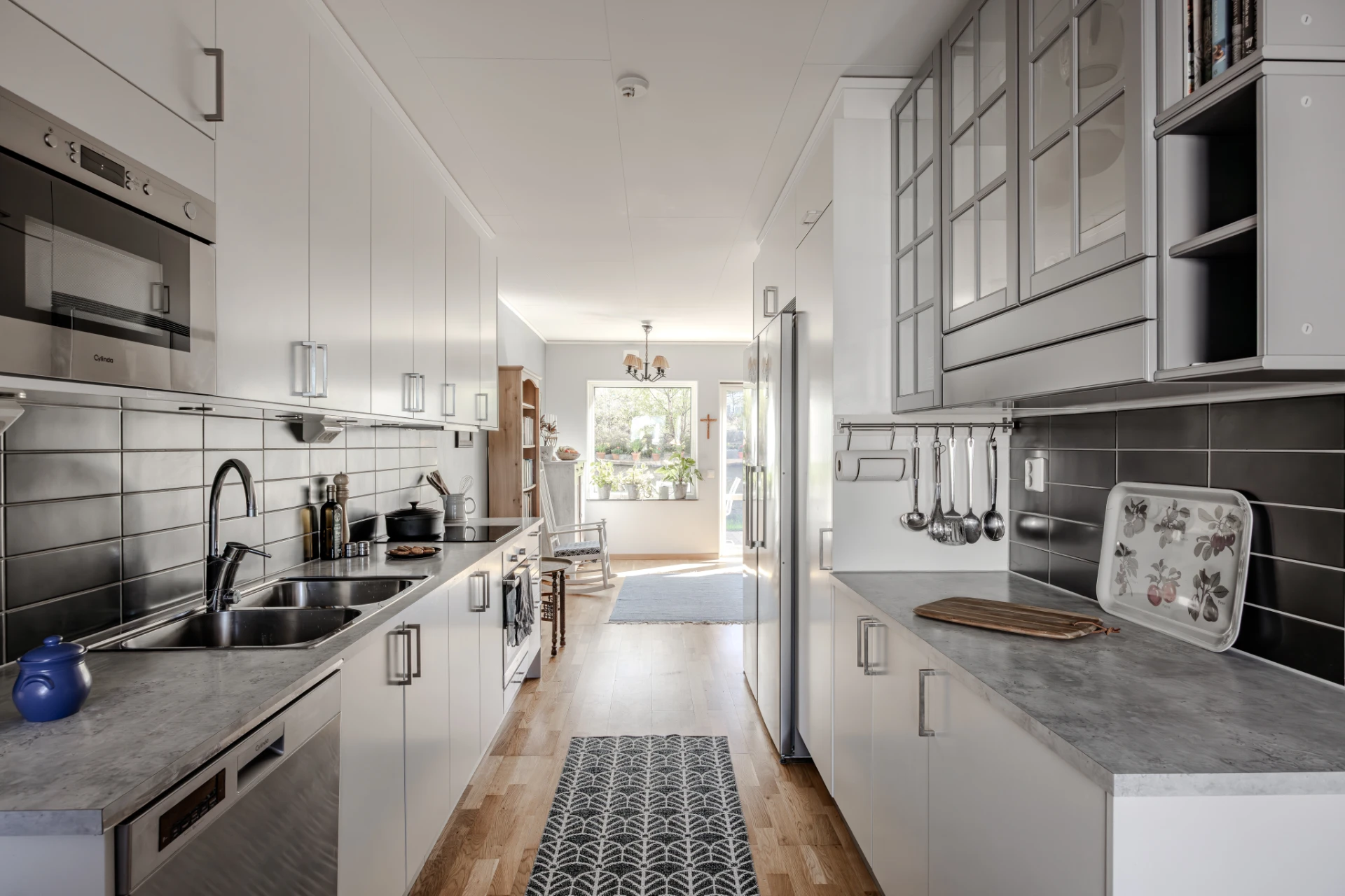 Parkettgolv med underliggande golvvärme och grå/vitmålade väggar. Köksinredning i vitt och grått, ovan bänkskivan i gråmelerad laminat sitter svart kakel. Den maskinella utrustningen består av kyl och frys i fullhöjd, induktionshäll, inbyggd ugn, fläkt, inbyggd mikro samt diskmaskin. Samtliga vitvaror från Cylinda 2018 förutom kylen som är från 2024. Förvaring sker i över- och underskåp samt extrainsatt vitrinskåp. Matplats för ca 4-6 personer intill köksfönstret. Delvis öppen planlösning mot vardagsrummet.