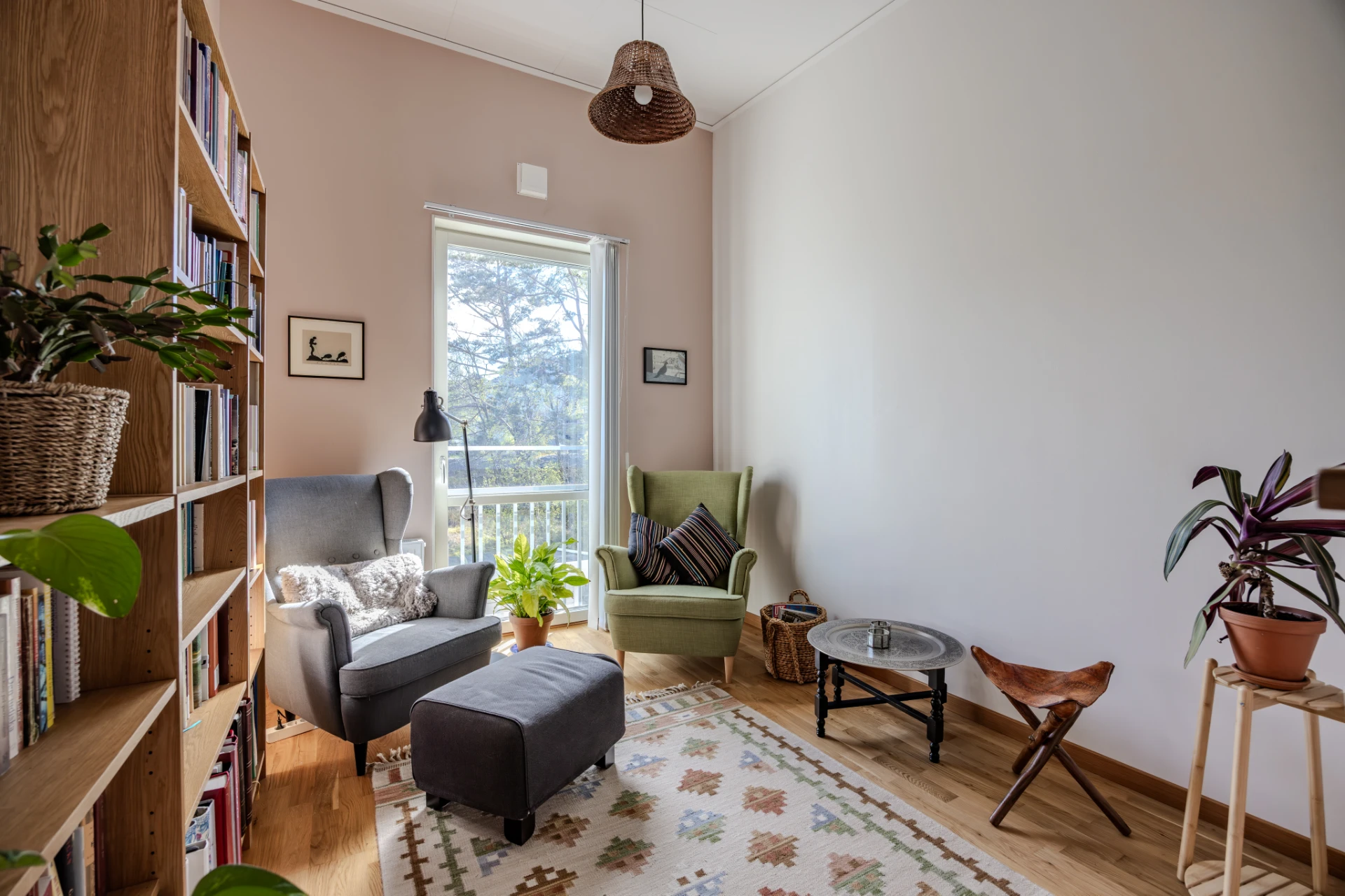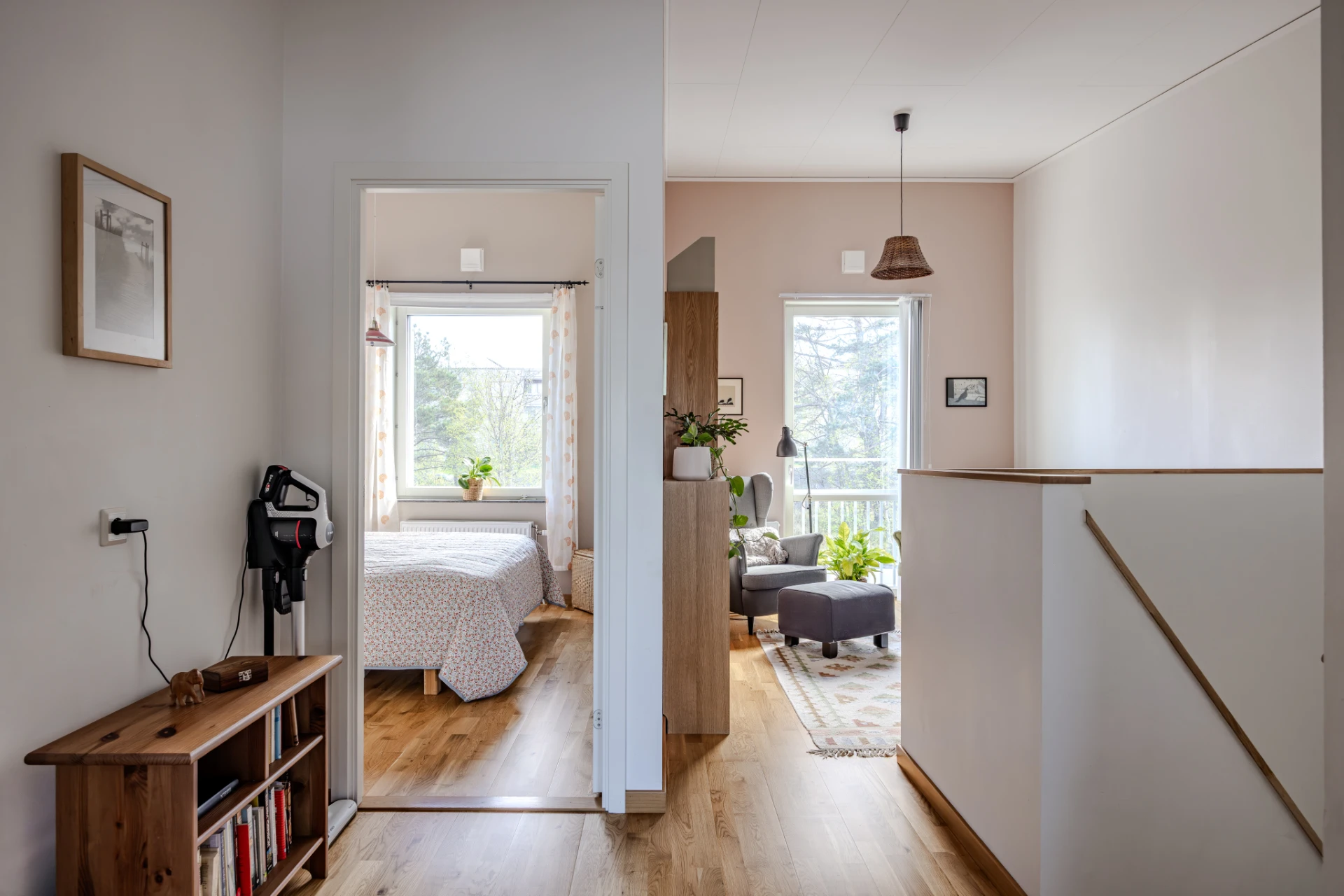 Parkettgolv och rosa/vitmålade väggar. Rummet lämpar sig utmärkt som exempelvis sovrum, kontor eller bibliotek.