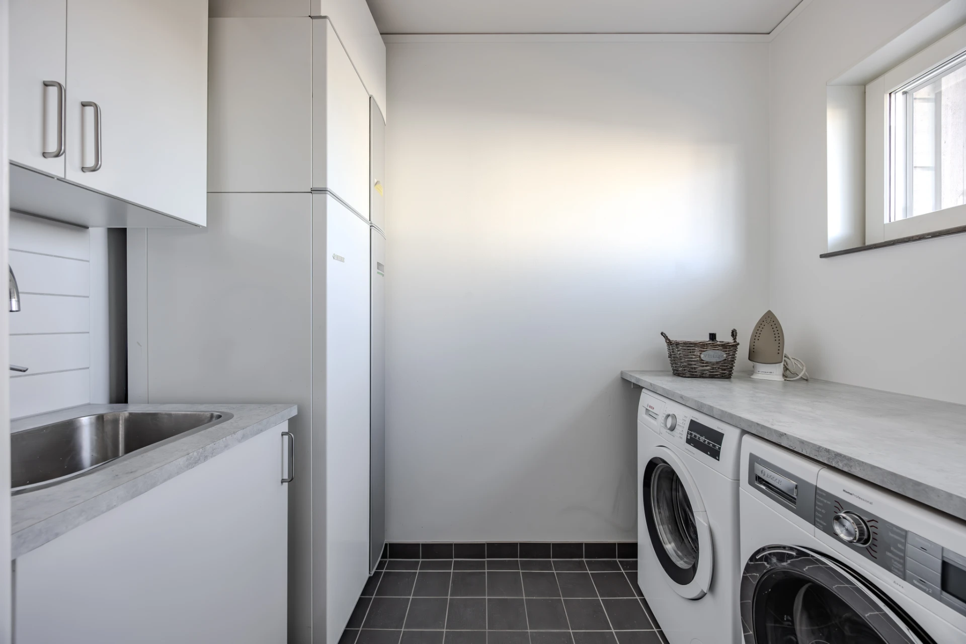 Grått klinkergolv med underliggande golvvärme och vitmålade väggar. Här finns tvättmaskin, torktumlare samt arbetsbänk med zink och kakel ovan. Förvaring sker i över- och underskåp. Här är hemmets värmepump placerad.