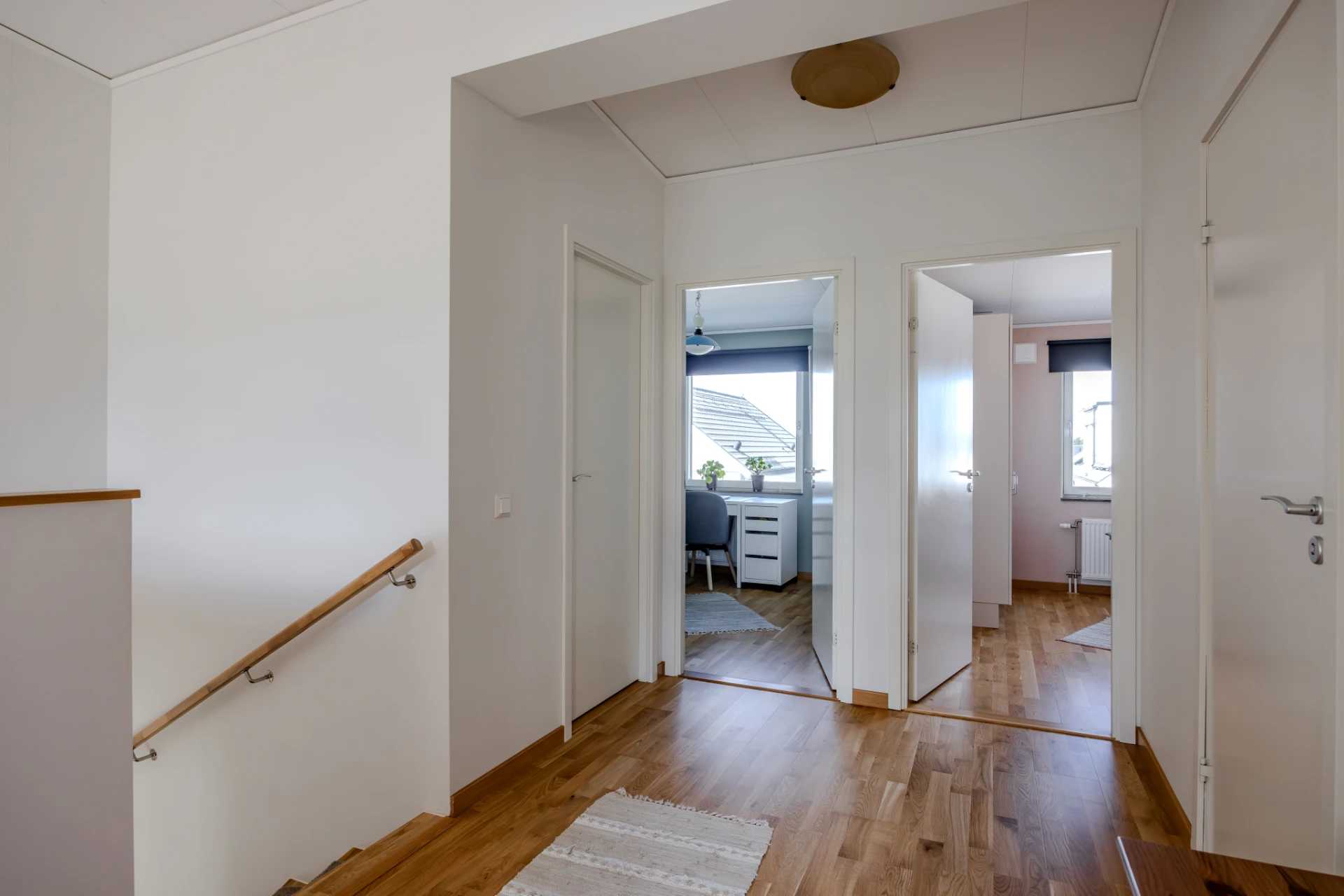 Parkettgolv och vitmålade väggar. Här finns plats för diverse avlastningsmöbel eller liknande.