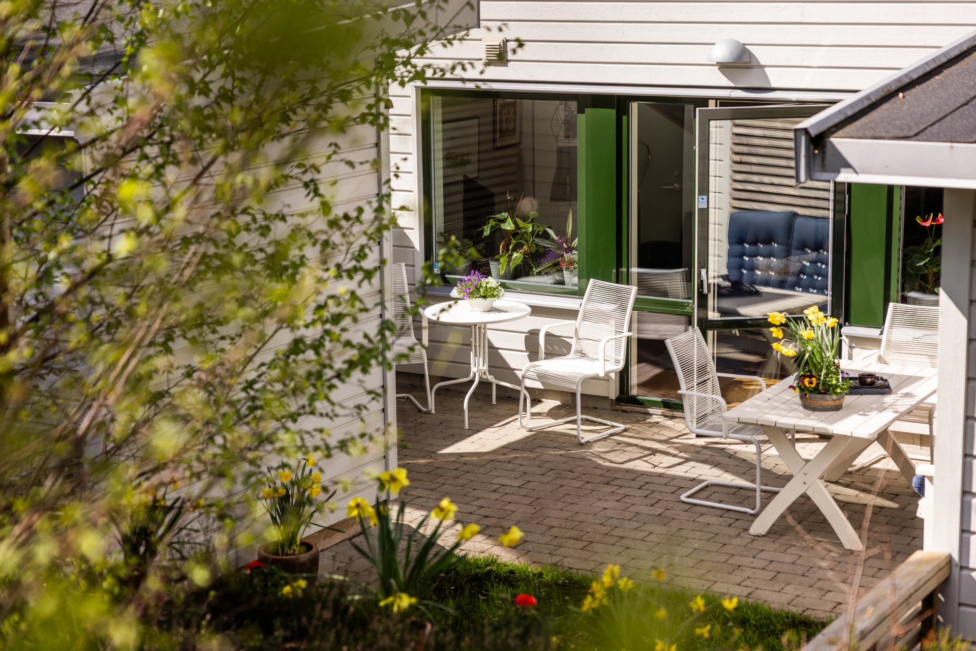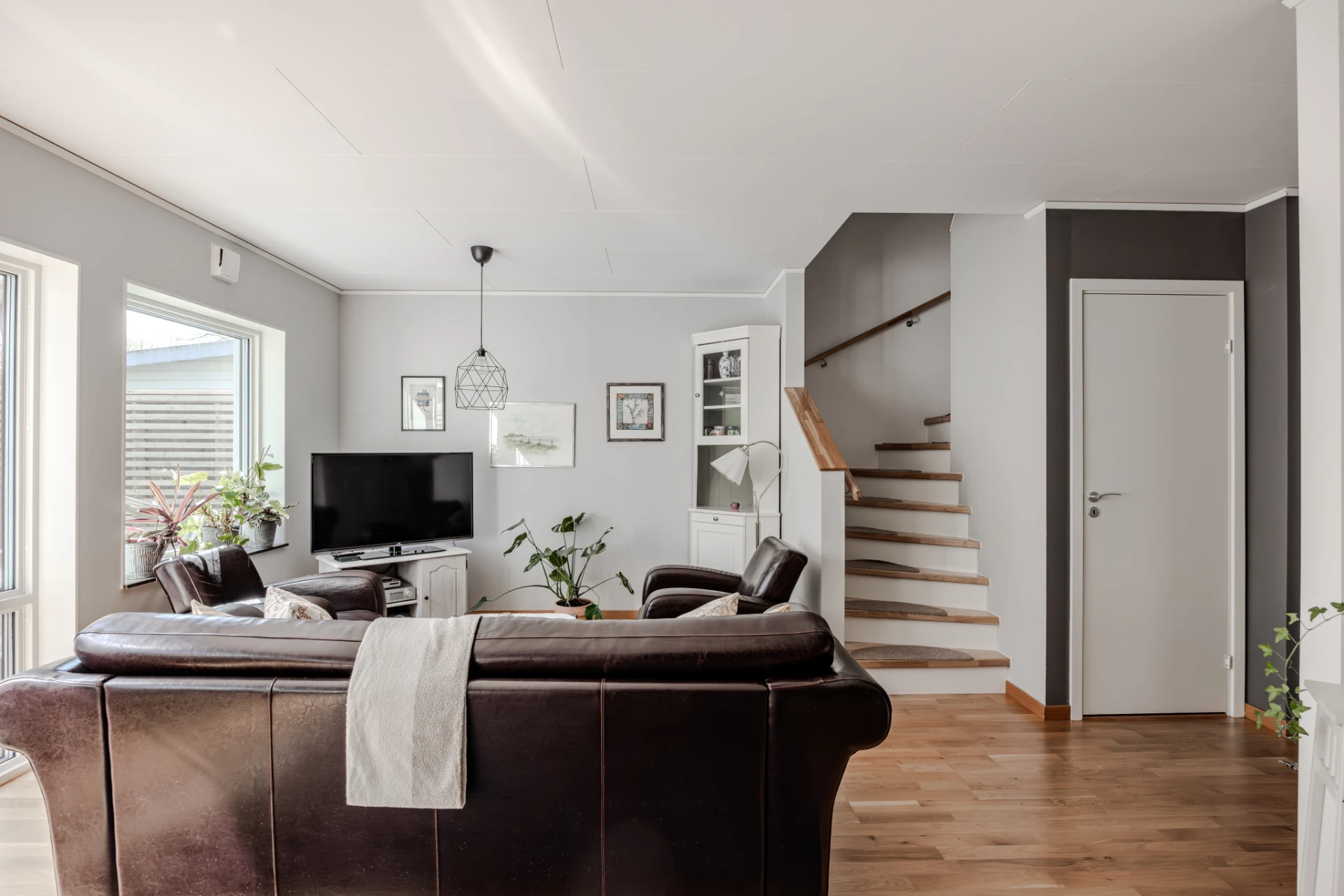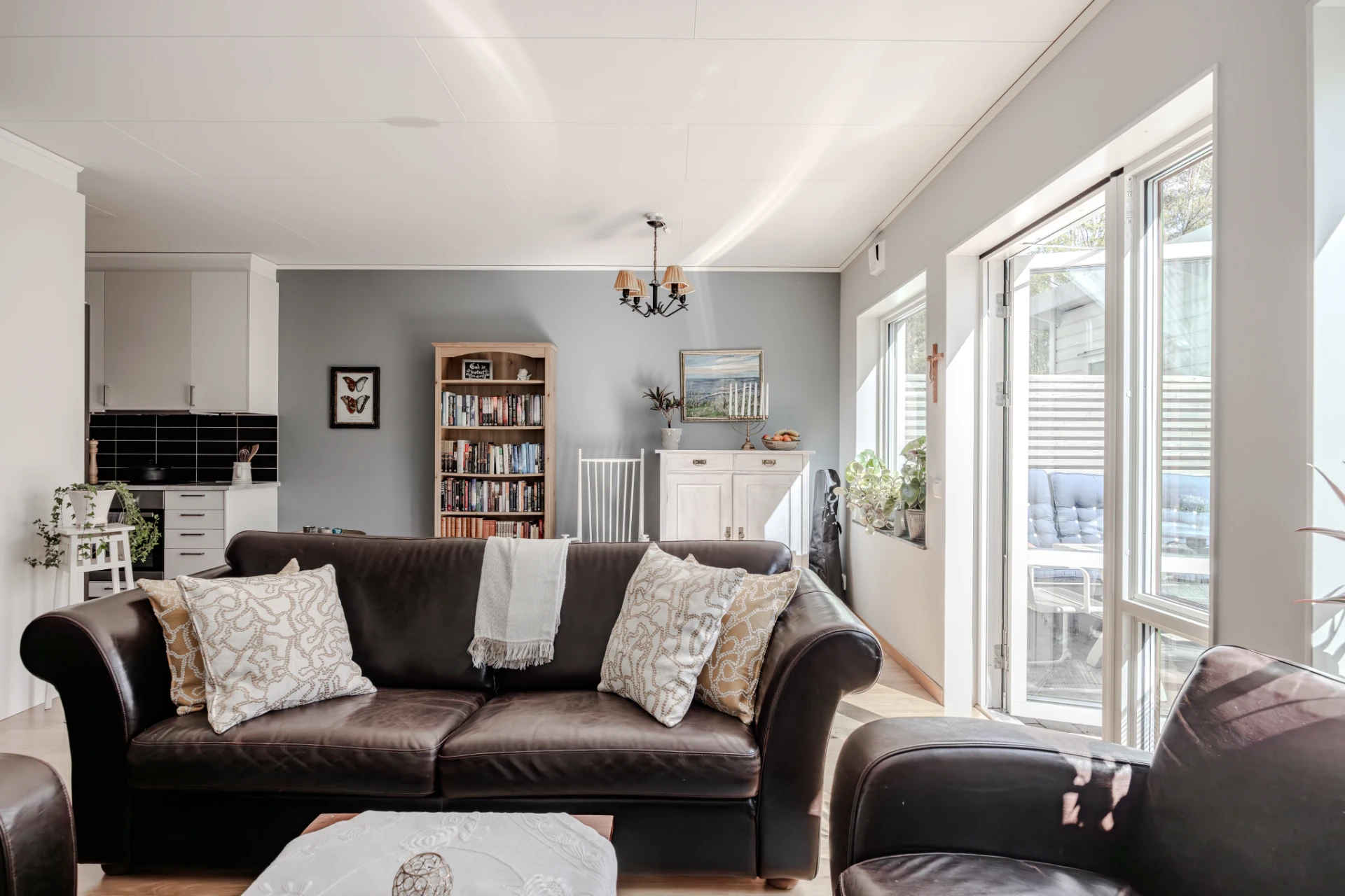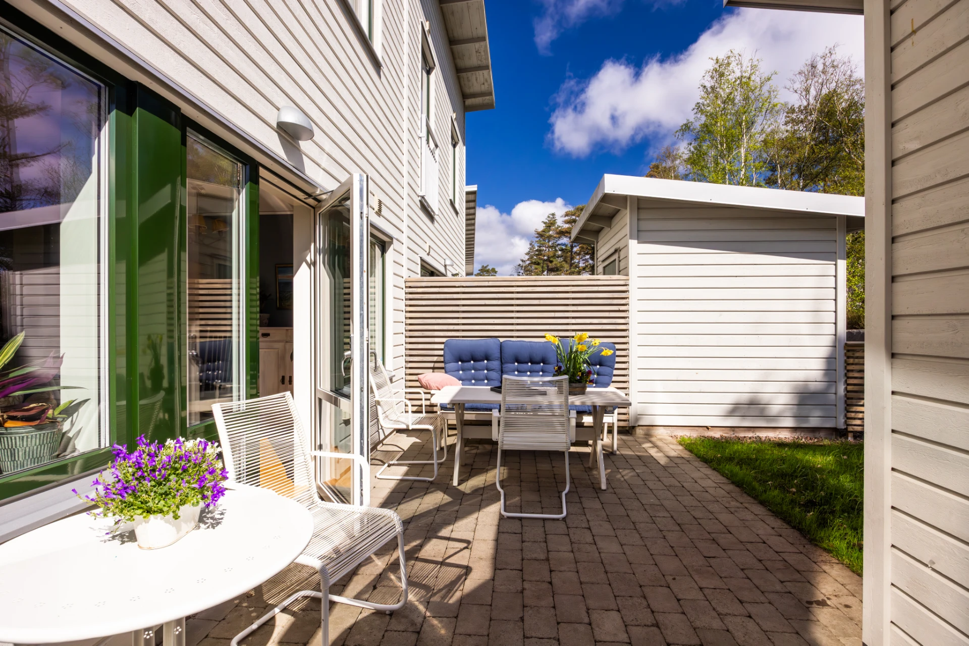 Parkettgolv med underliggande golvvärme och grå/blåmålade väggar. Här finns plats för soffgrupp med tillhörande möblemang. Härifrån nås hemmets insynsskyddade uteplats i västerläge. Förvaring sker i en klädkammare.