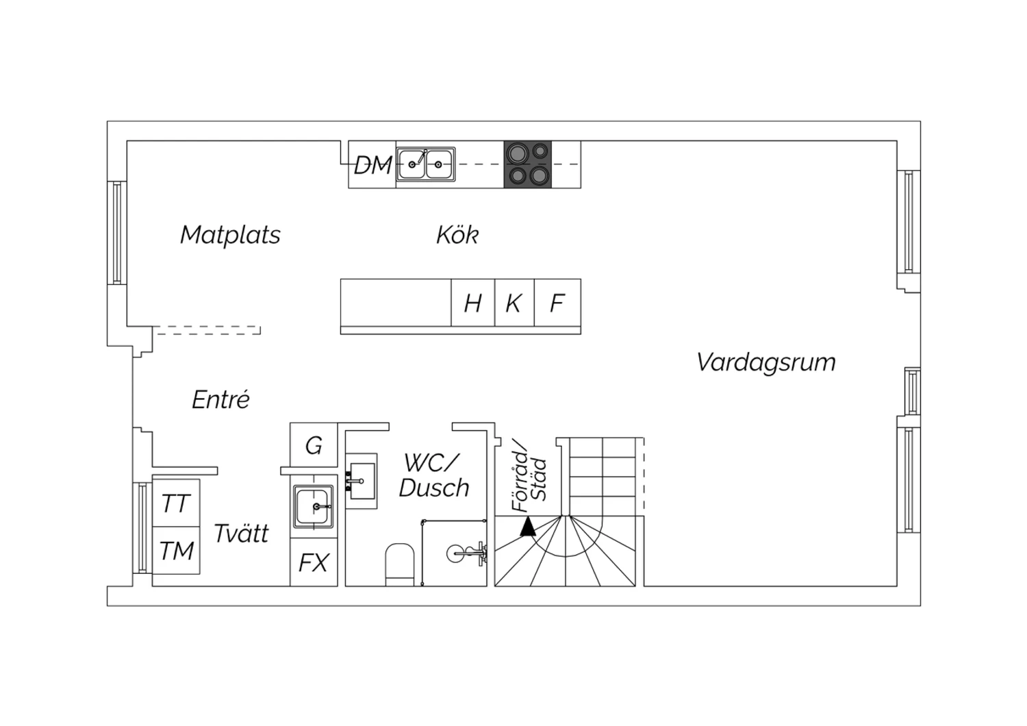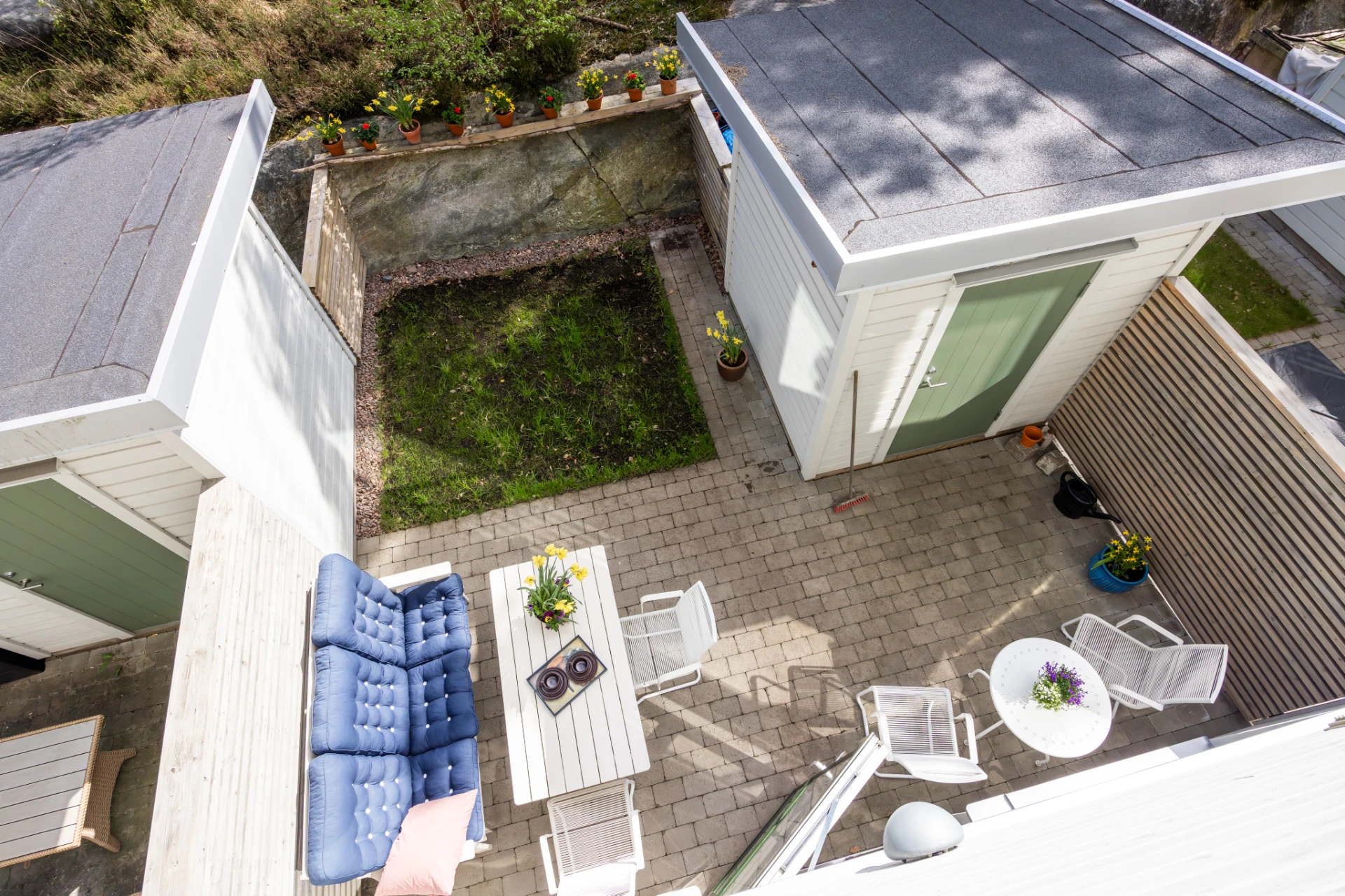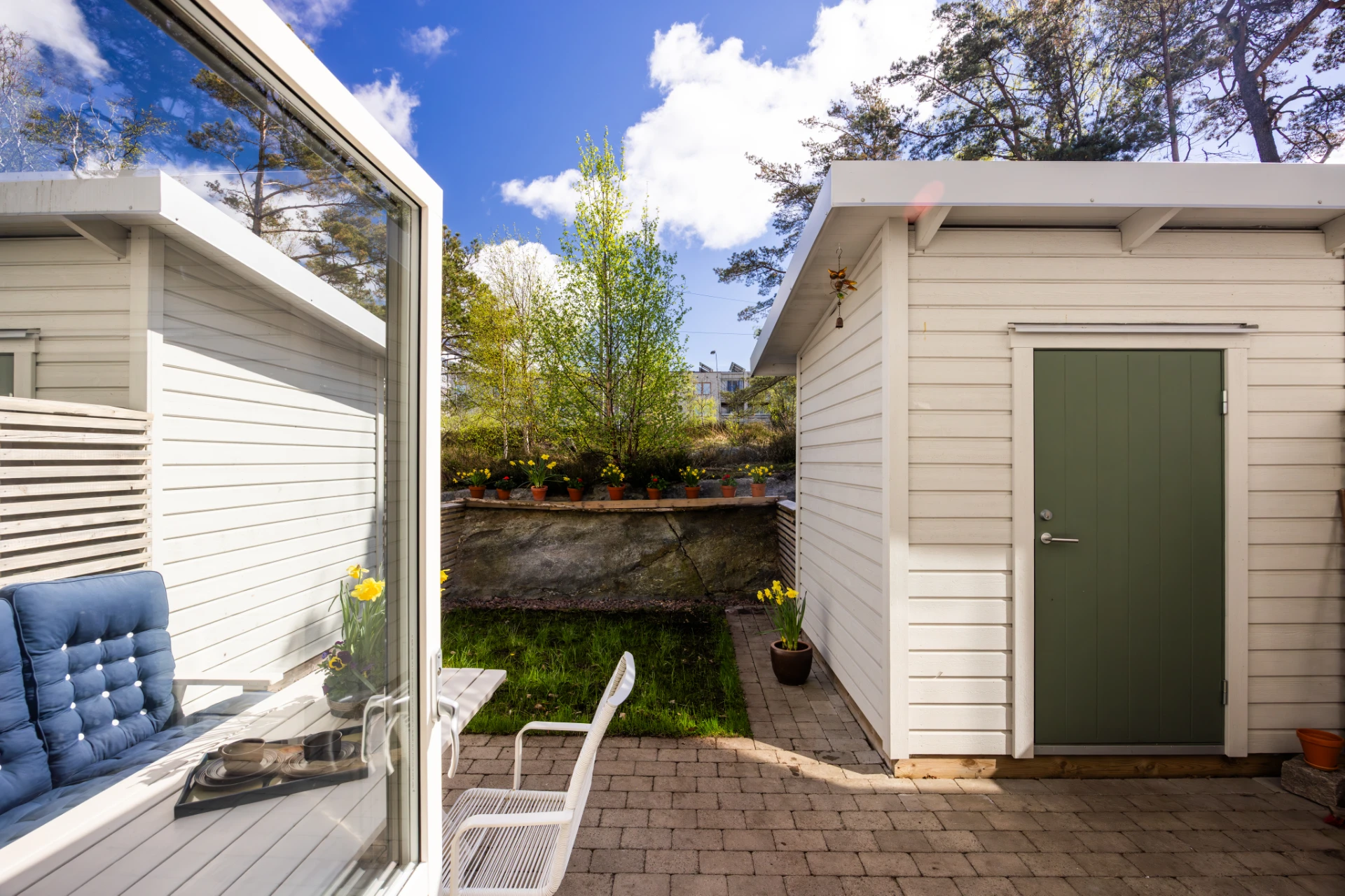 Till bostaden hör ett kallförråd som nås från utsidan. Det finns även ett förrådsutrymme under trappen.