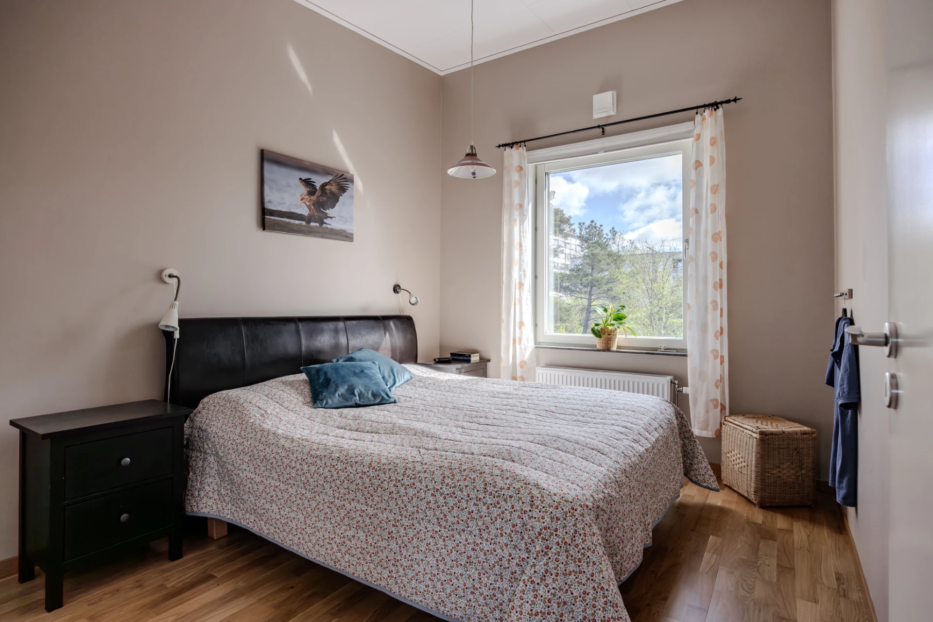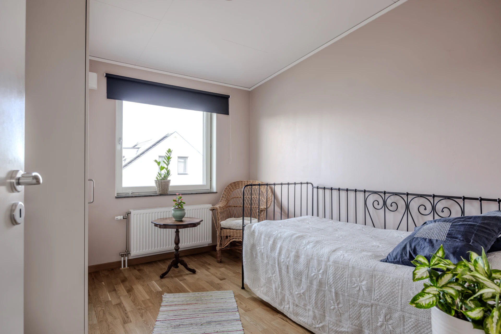 Parkettgolv och rosamålade väggar. Här finns plats för säng med tillhörande möblemang. Förvaringsmöjligheter erbjuds i två garderober.
