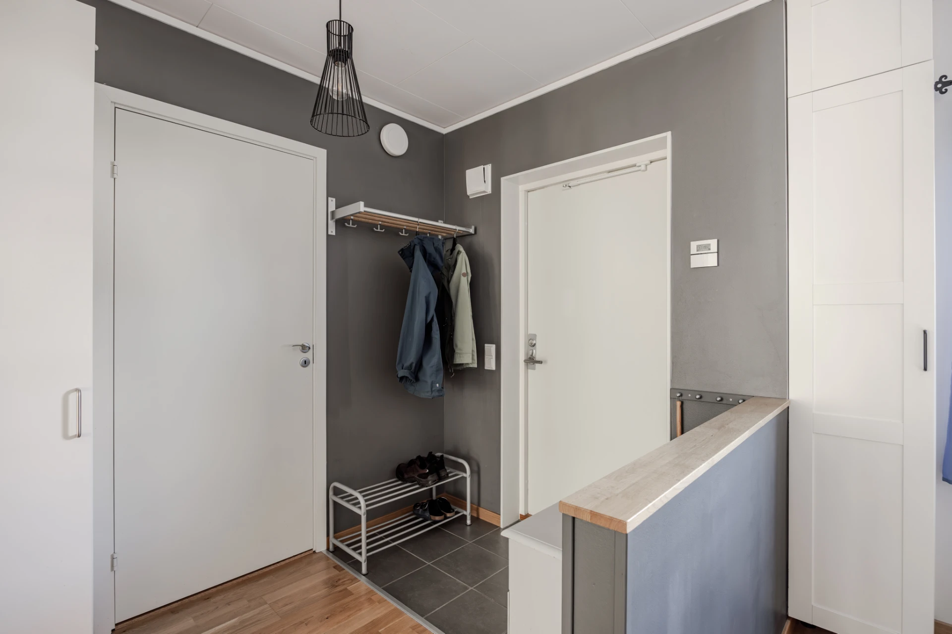 Parkettgolv och vitmålade väggar. Här finns plats för förvaring.