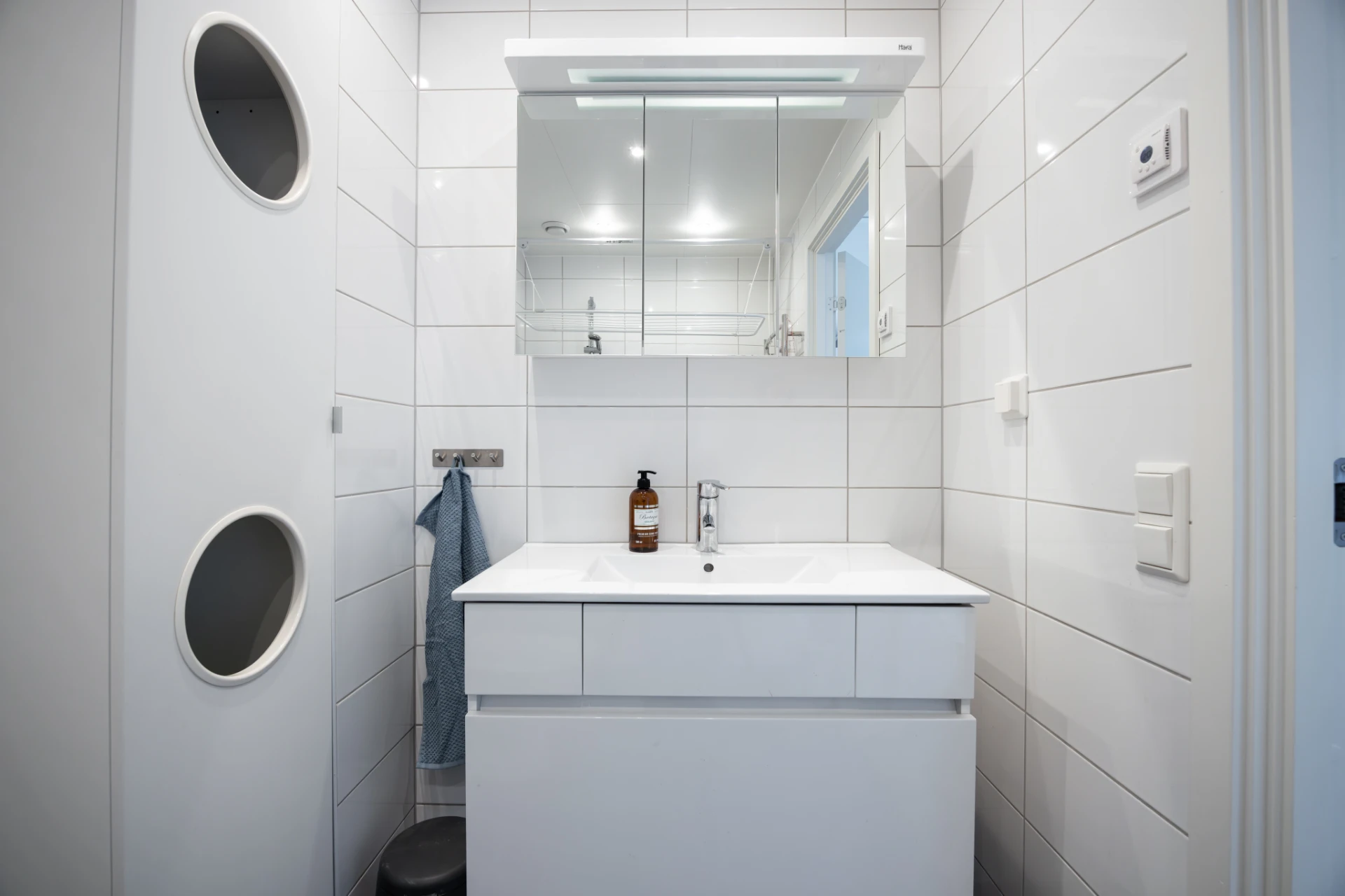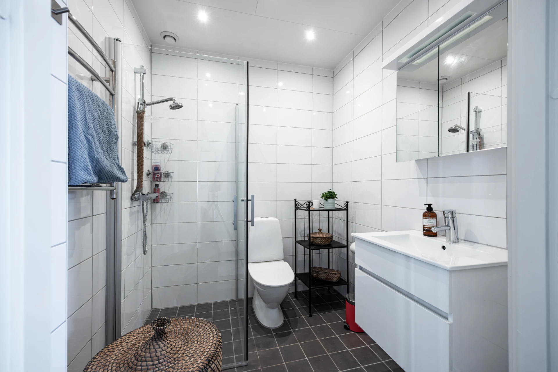 Grått klinkergolv med underliggande golvvärme och vita helkaklade väggar. Badrummet är utrustat med WC, handfat med kommod, spegelskåp, dusch och handdukstork. I taket sitter spotlights med dimmerfunktion.