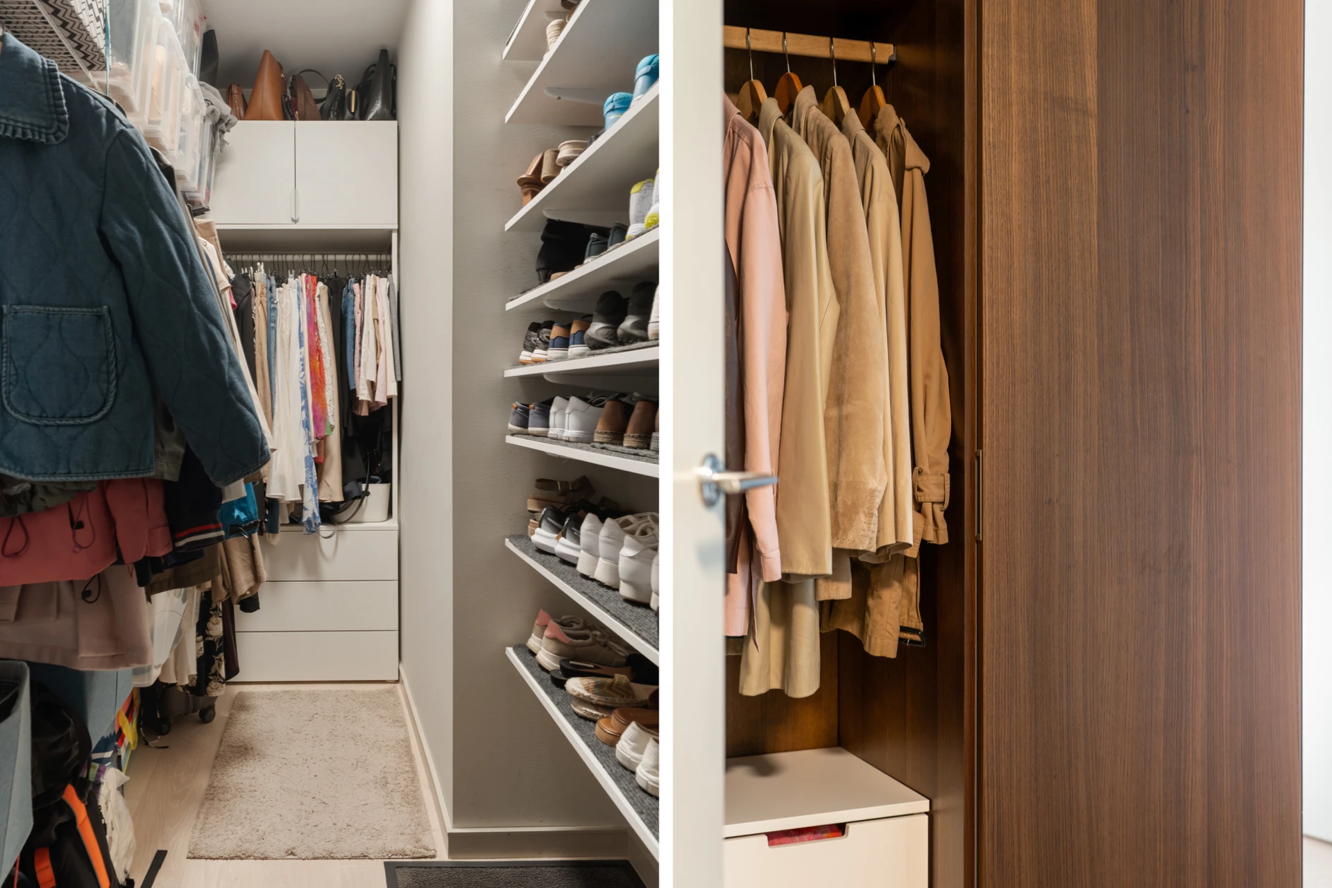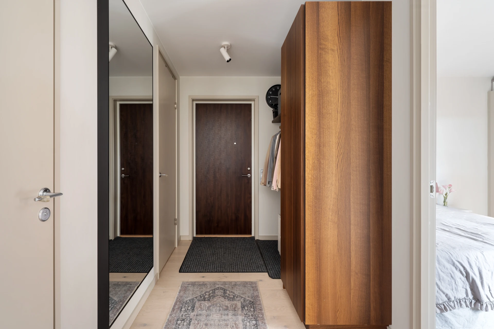 Ljus enstavsparkett och ljusa väggar. Här finns plats för avhängning och förvaring sker i en garderob.