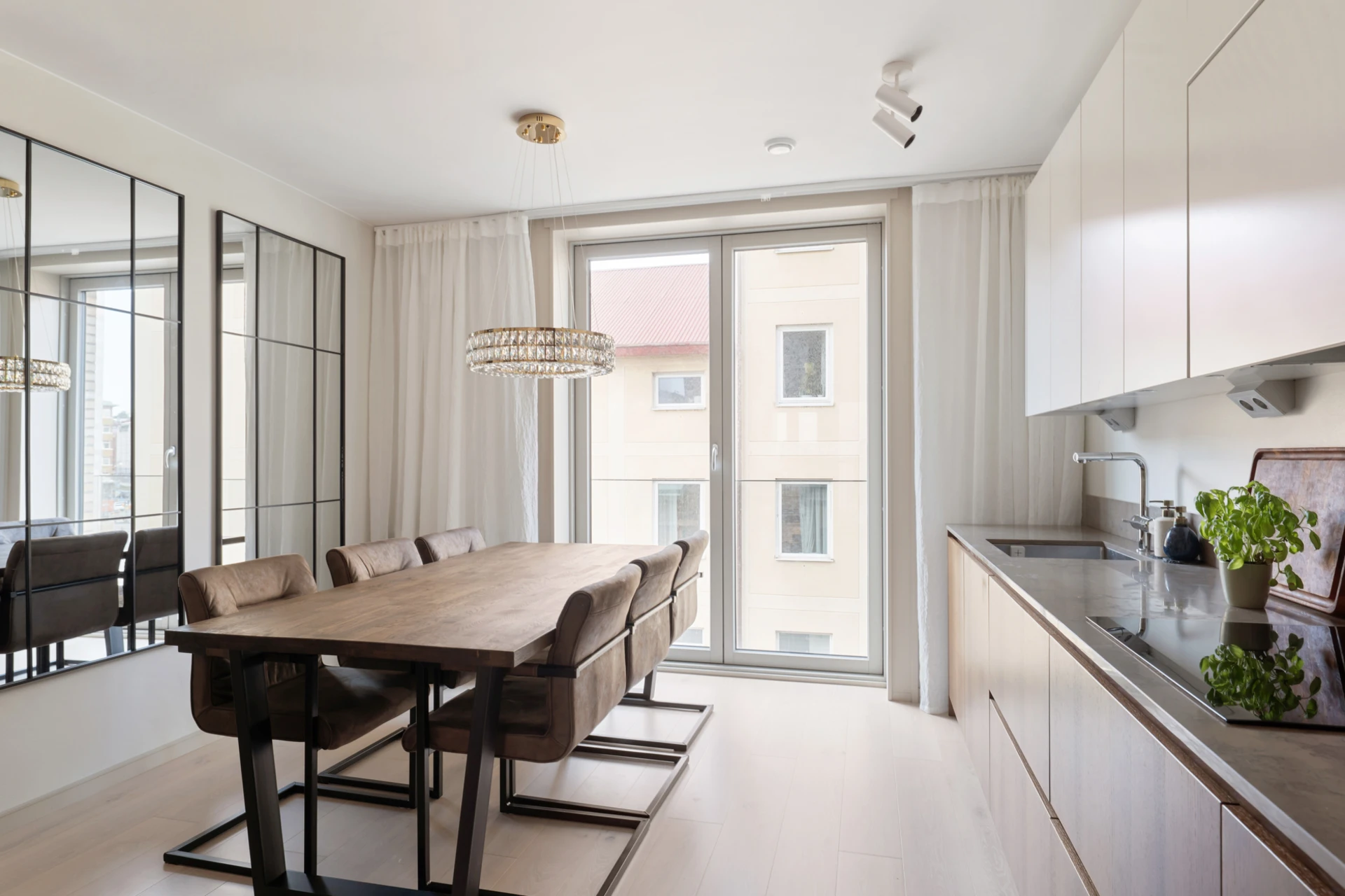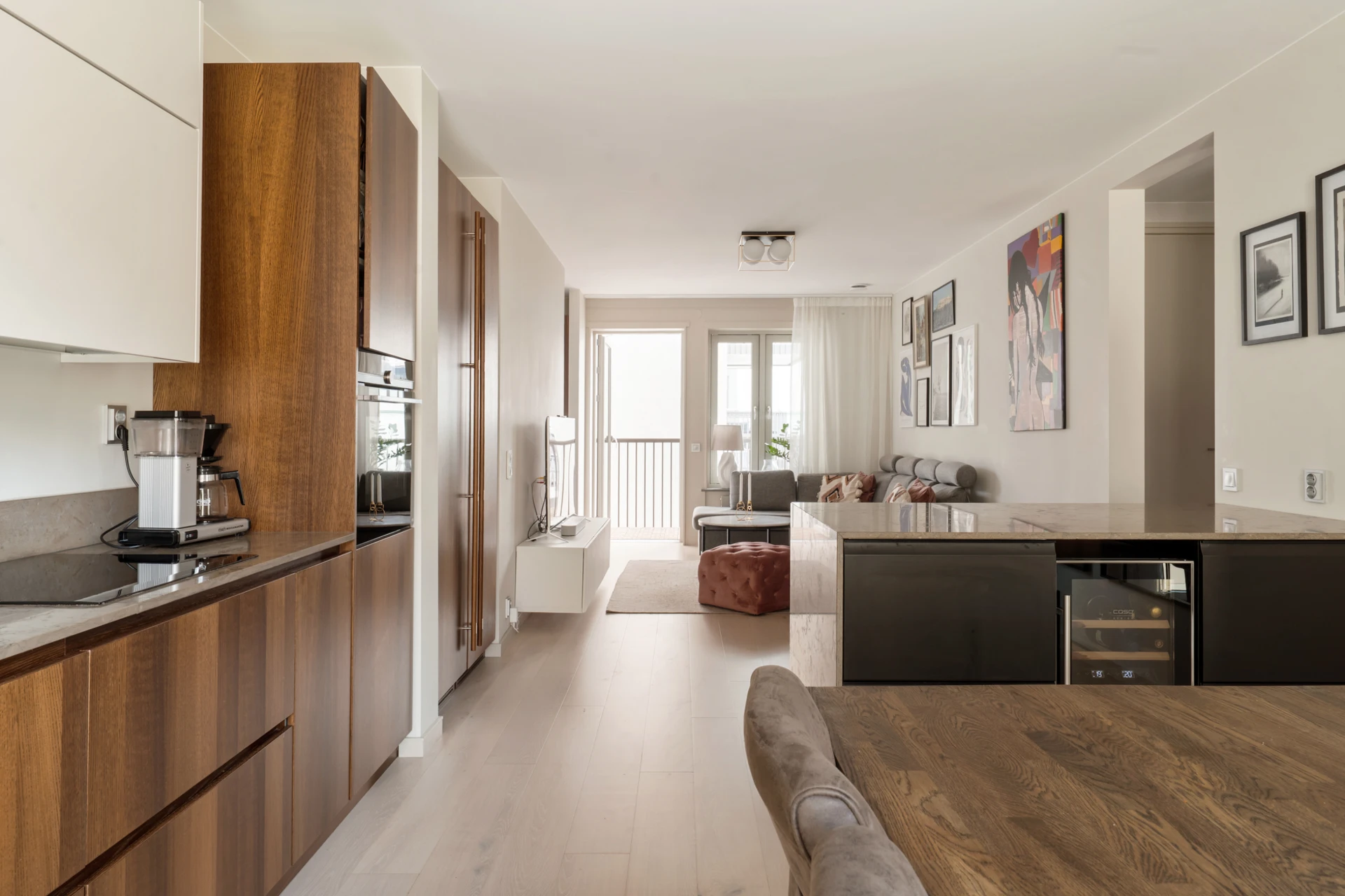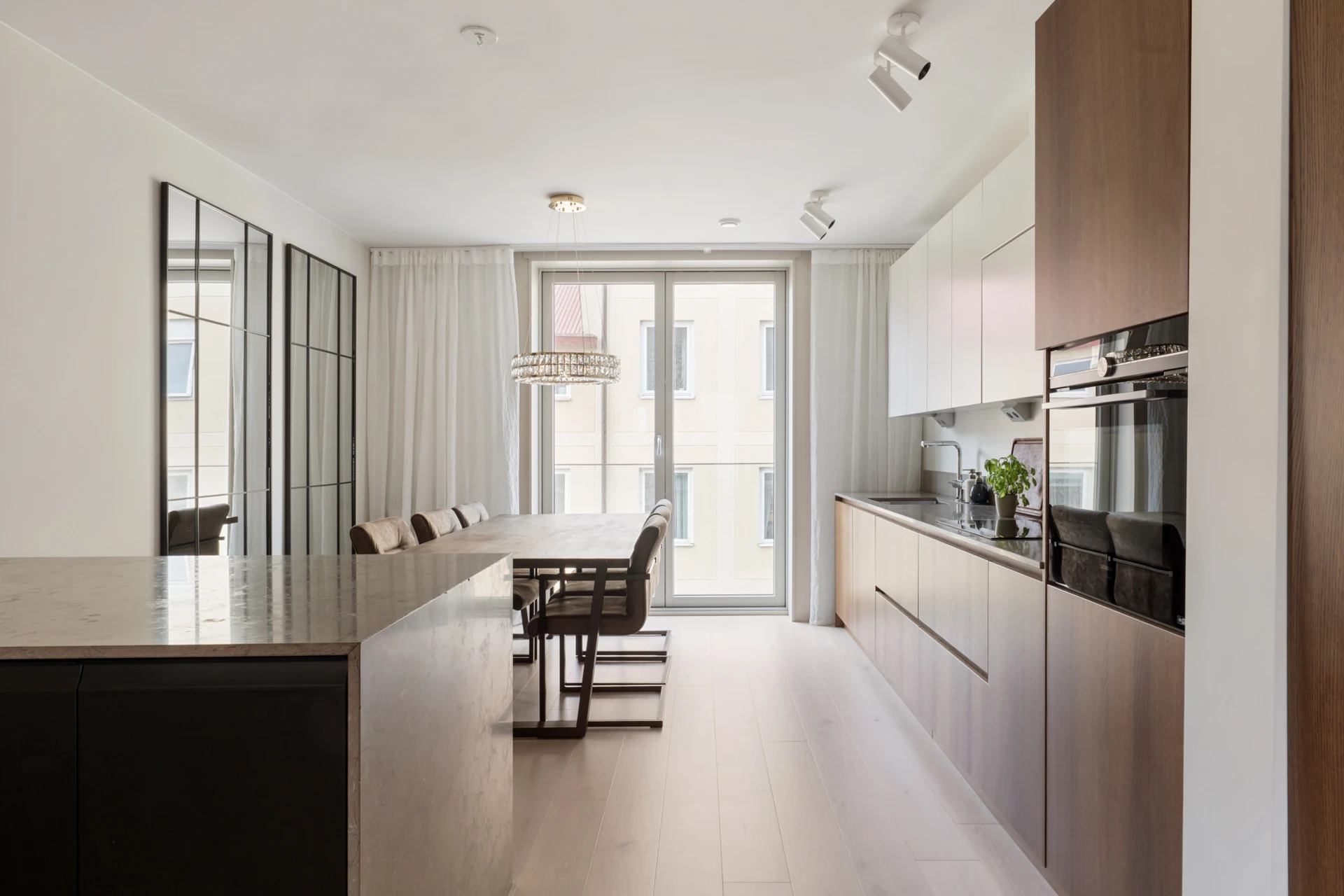 Ljus enstavsparkett och ljusa väggar. Köksinredning från Kvänum i vitt samt mörkpigmenterad ekfanér och bänkskiva samt stänkskydd i mattslipad kalksten. Köksutrustningen består av integrerad kyl och frys i fullhöjd, induktionshäll, ugn, fläkt och integrerad diskmaskin. Samtliga vitvaror från Siemens. I köksön finns en vinkyl. Spotlights under väggskåp. Matplats för ca 6 personer. Härifrån nås bostadens franska balkong.