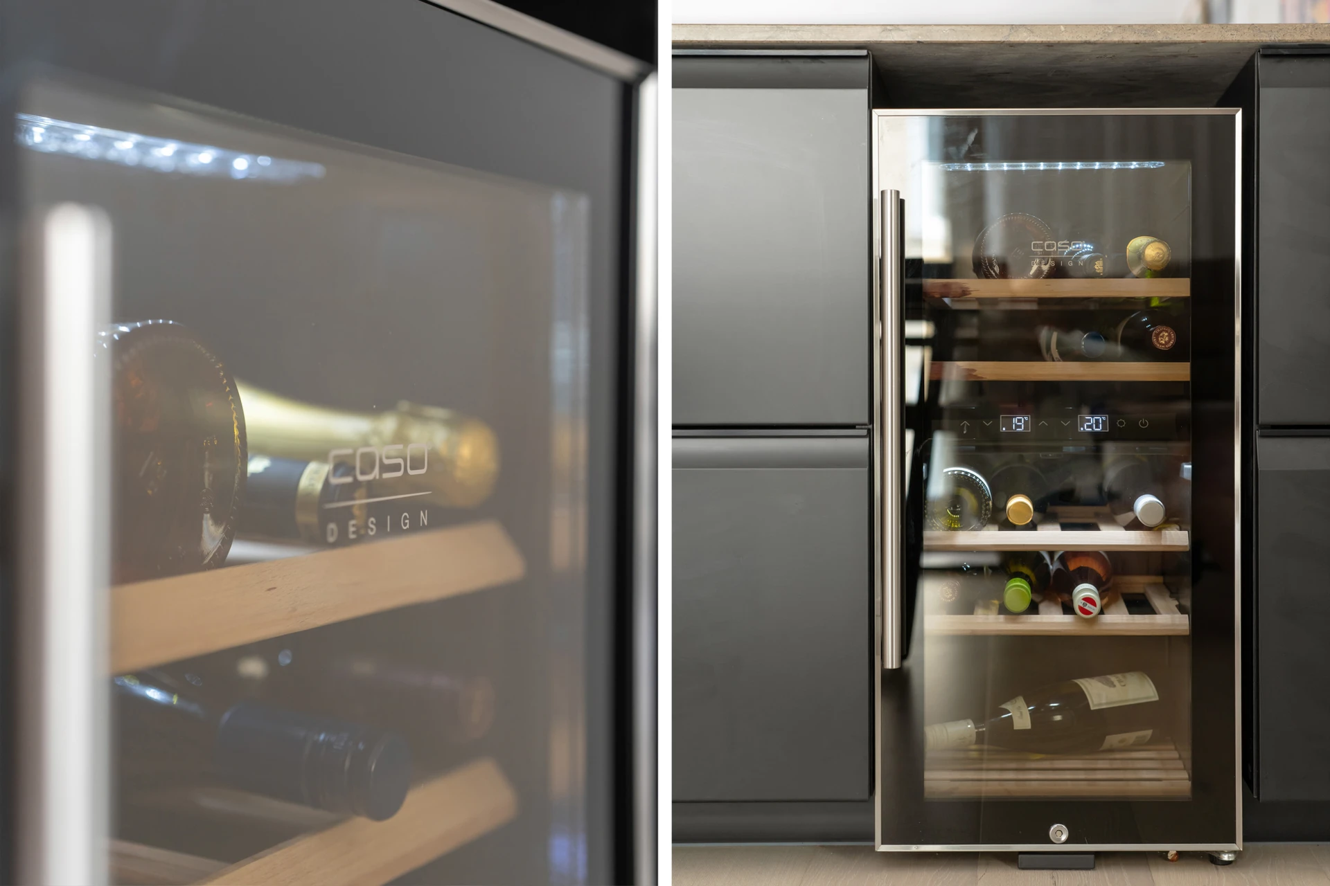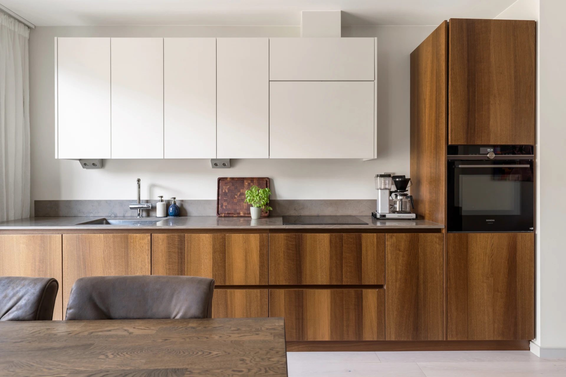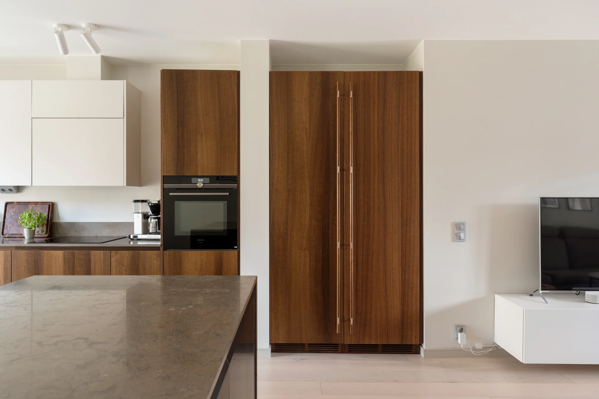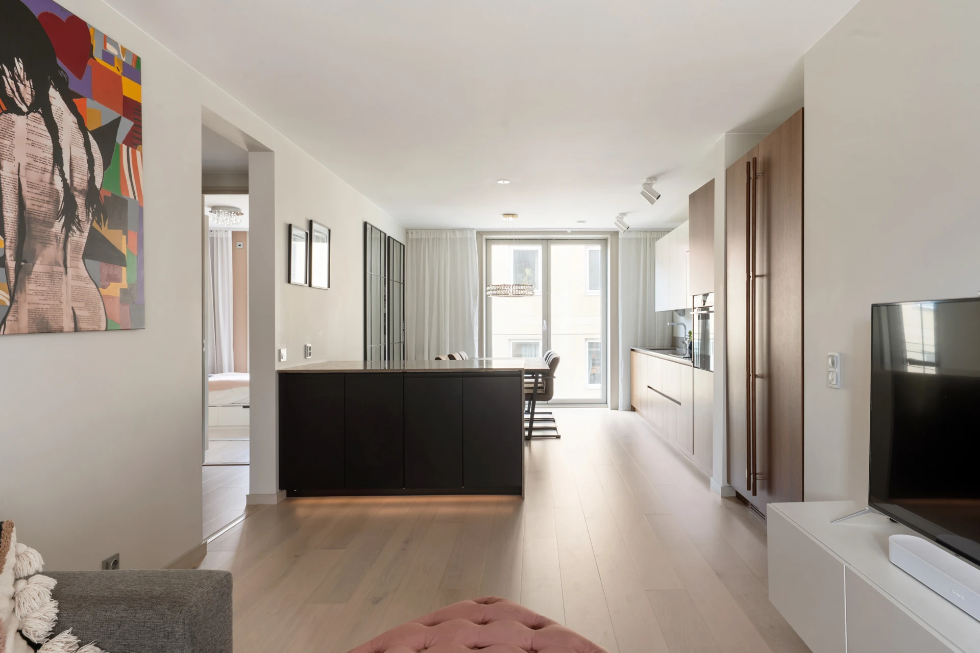 Ljus enstavsparkett och ljusa väggar. Köksinredning från Kvänum i vitt samt mörkpigmenterad ekfanér och bänkskiva samt stänkskydd i mattslipad kalksten. Köksutrustningen består av integrerad kyl och frys i fullhöjd, induktionshäll, ugn, fläkt och integrerad diskmaskin. Samtliga vitvaror från Siemens. I köksön finns en vinkyl. Spotlights under väggskåp. Matplats för ca 6 personer. Härifrån nås bostadens franska balkong.