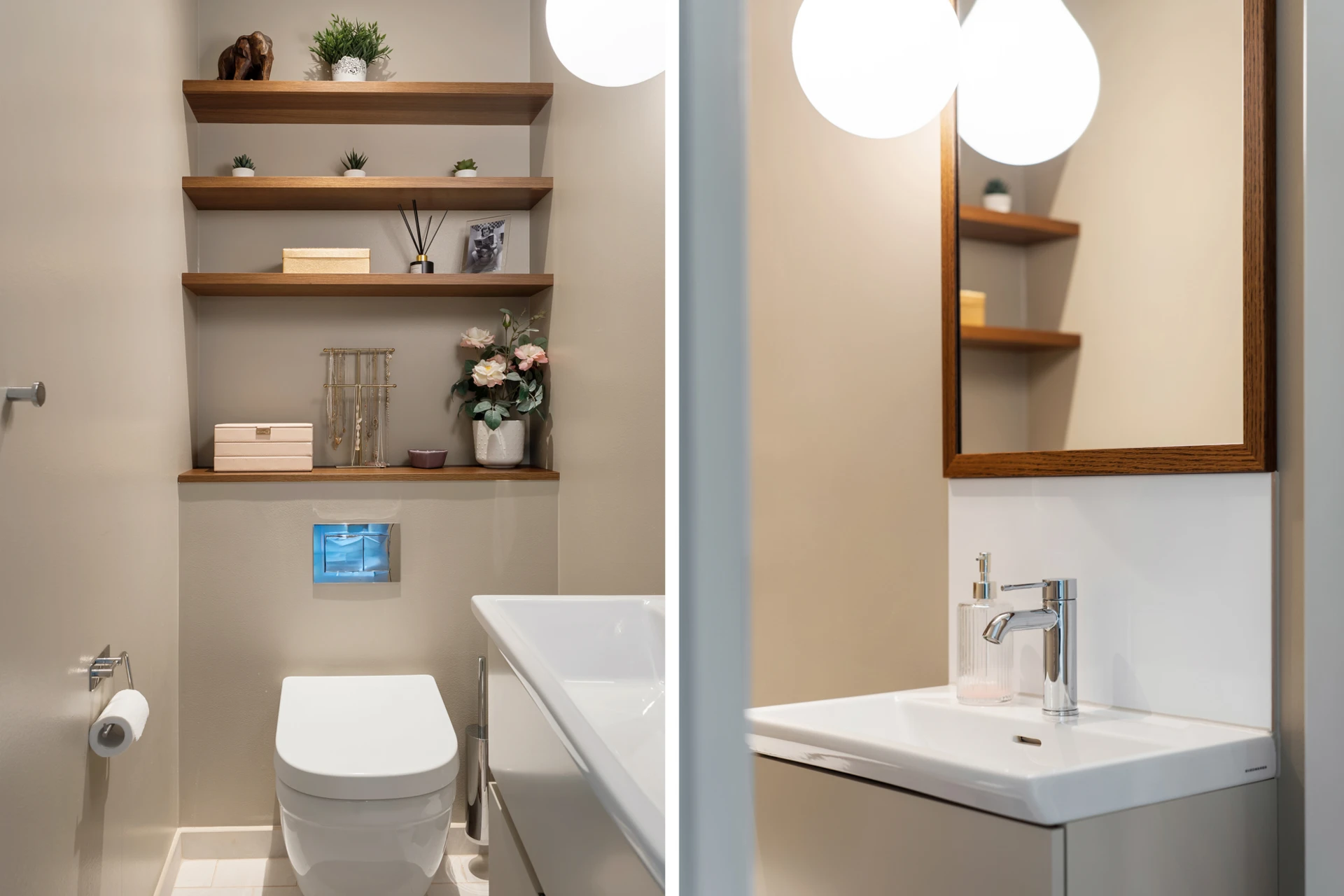 Beige klinkergolv och beige väggar. Här finns vägghängd WC, handfat med kommod, spegel samt dekorativa hyllplan i rökt ek.