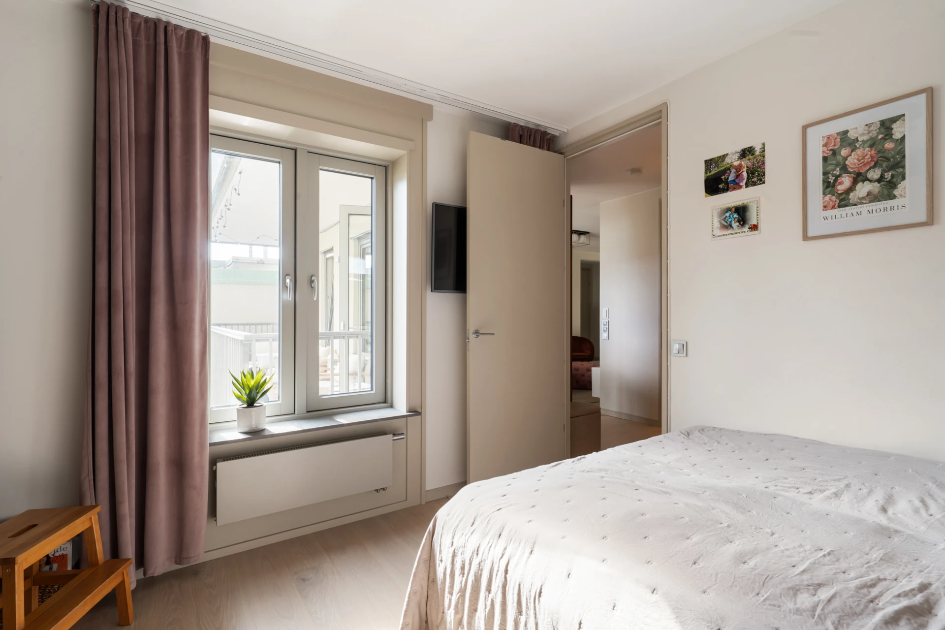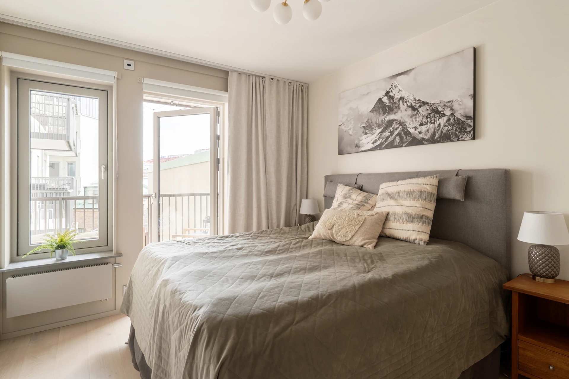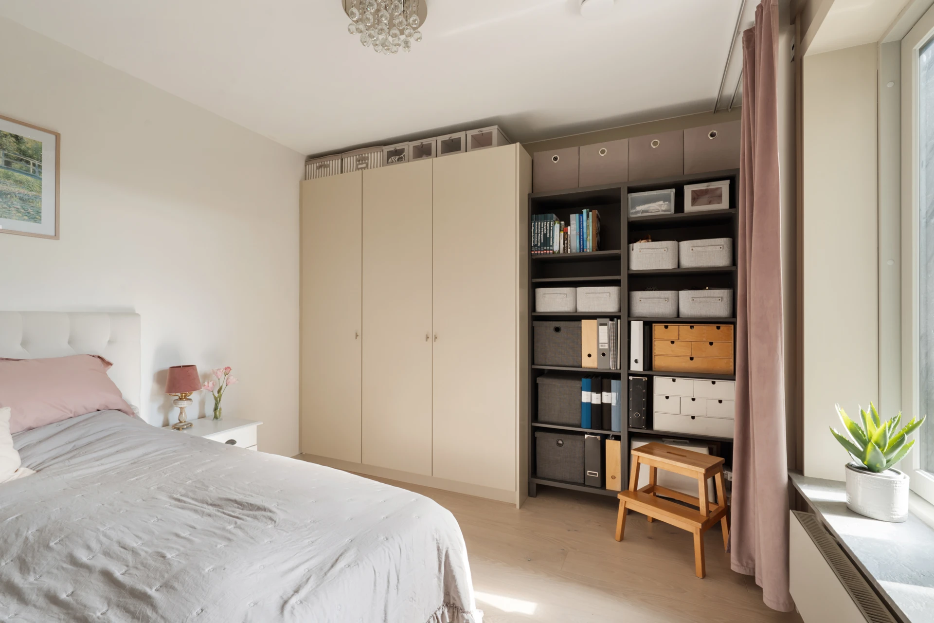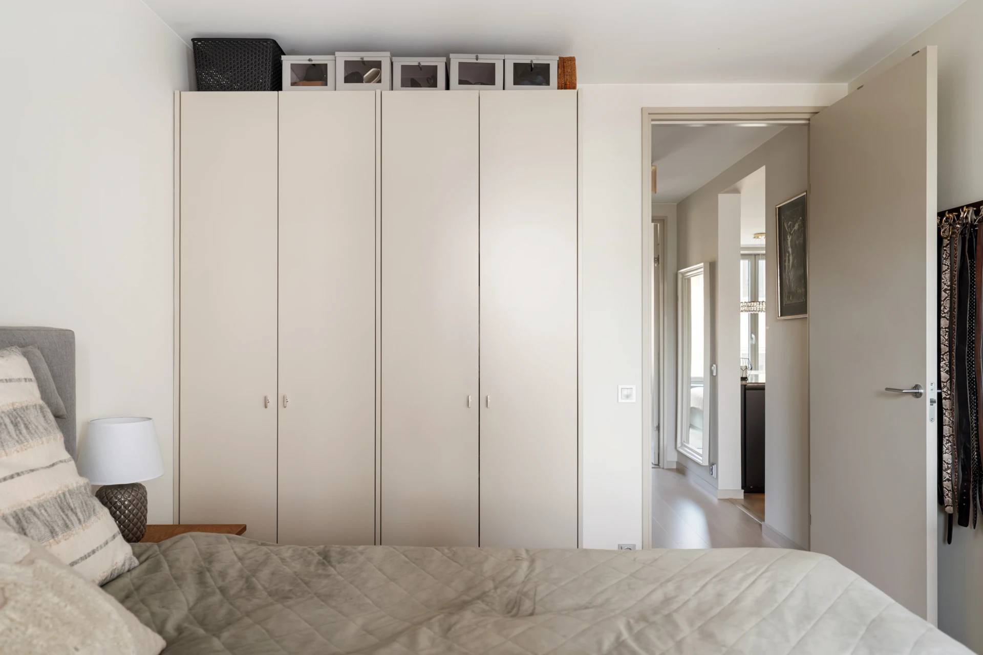 Ljus enstavsparkett och väggar i färgen "Lätthet" (Colorama). Här finns plats för dubbelsäng med tillhörande möblemang. Förvaring sker i en garderob. Även härifrån nås balkongen.