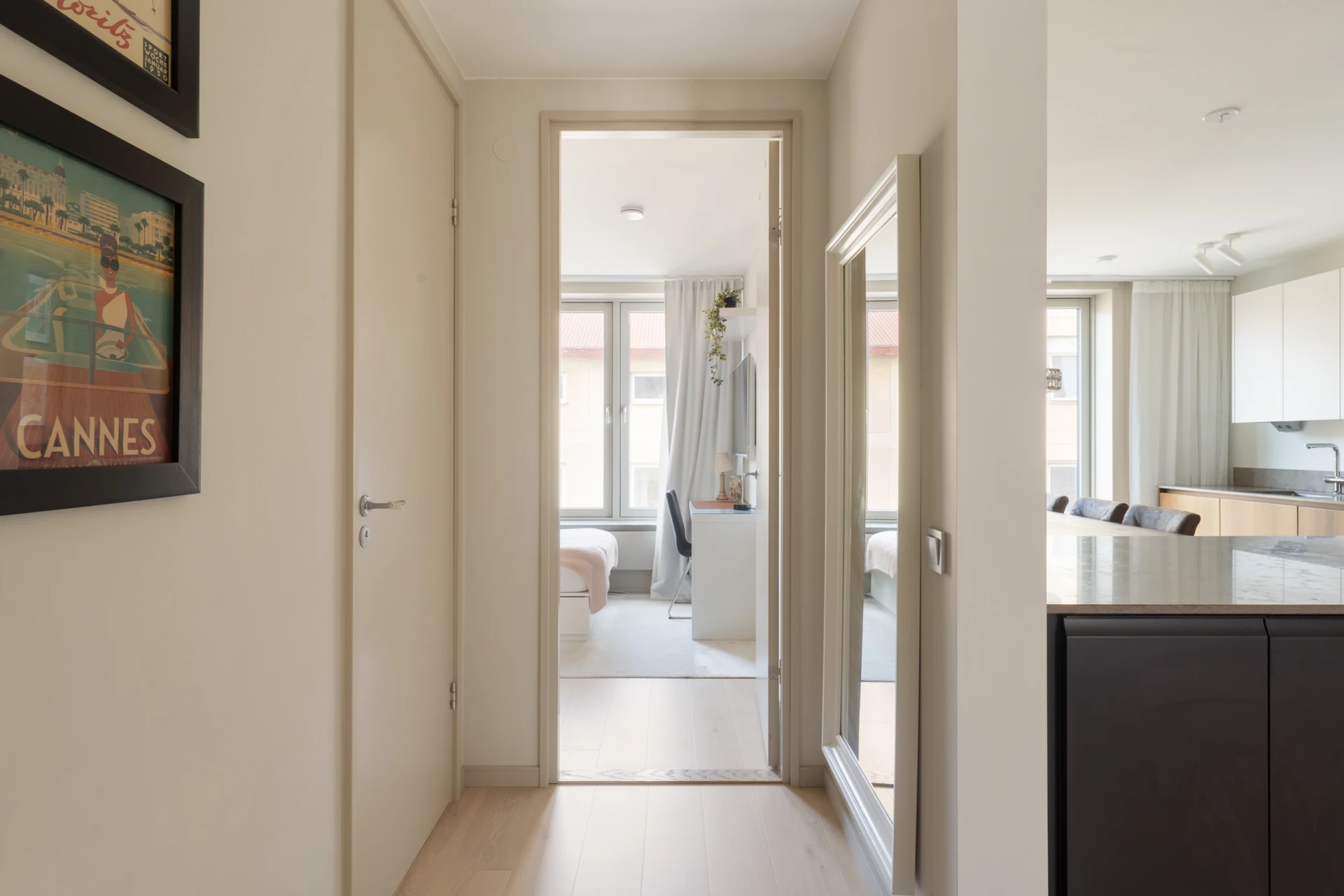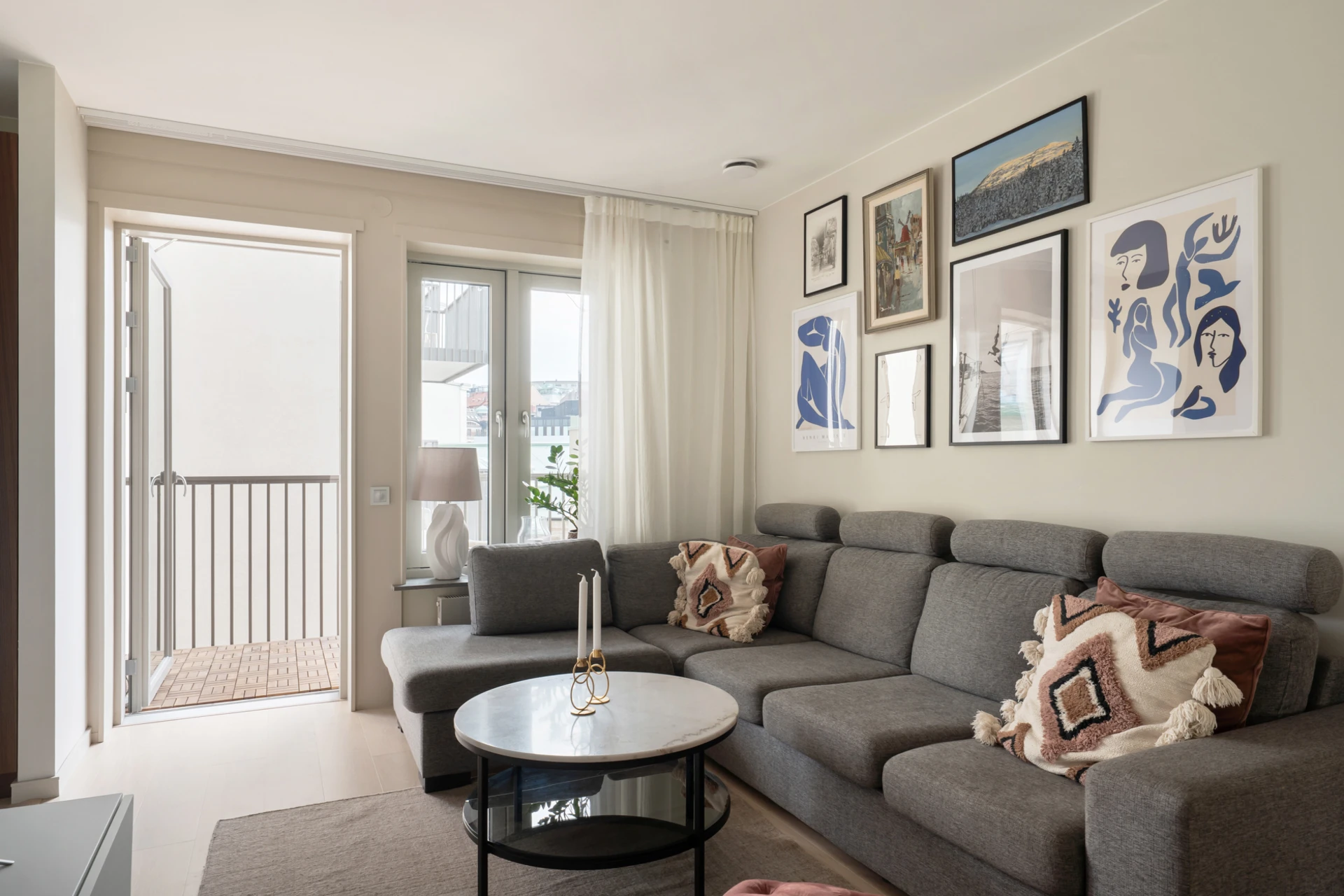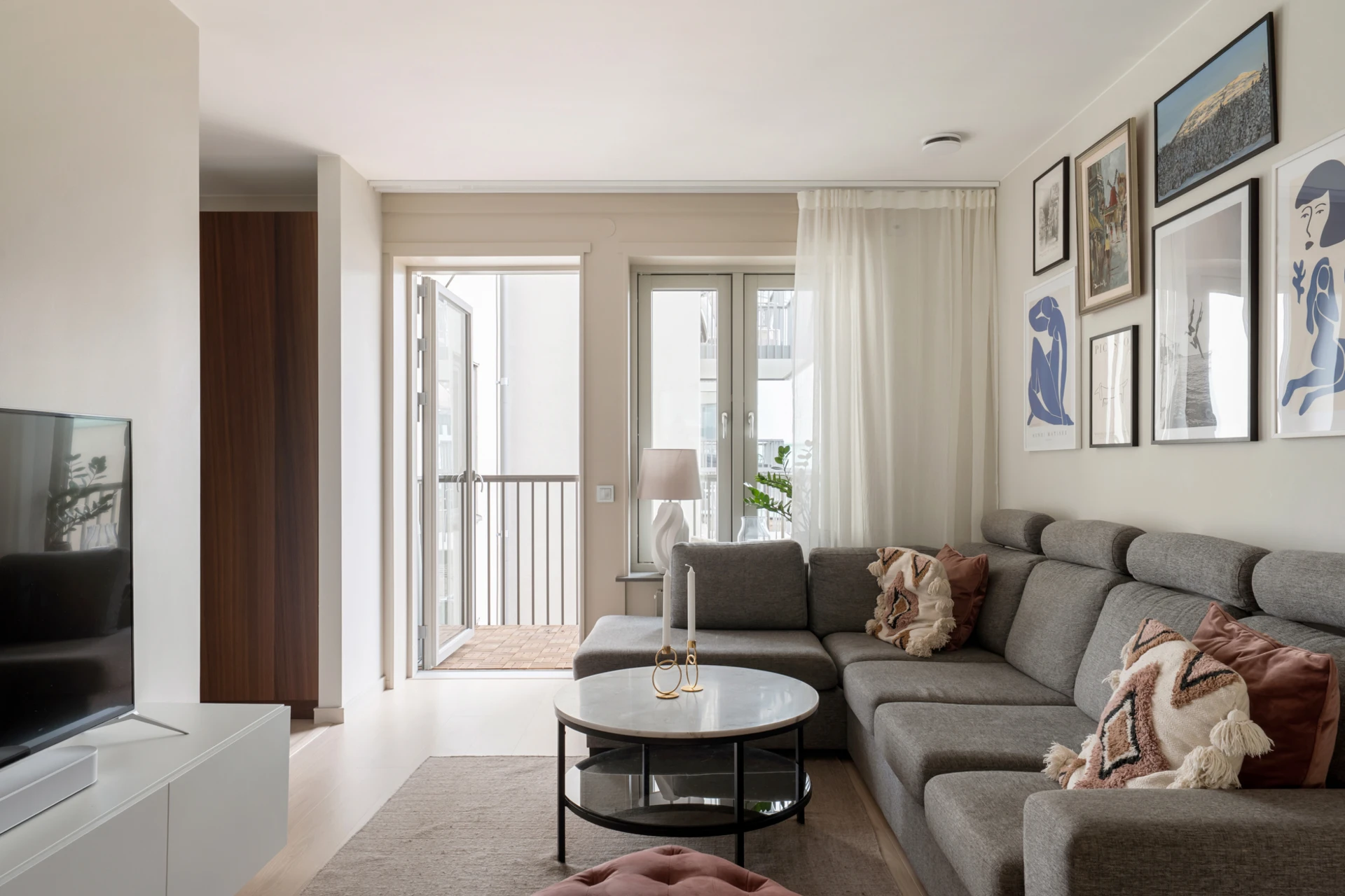 Ljus enstavsparkett och ljusa väggar. Här finns plats för soffgrupp med tillhörande möblemang. Härifrån nås hemmets balkong i norrläge.