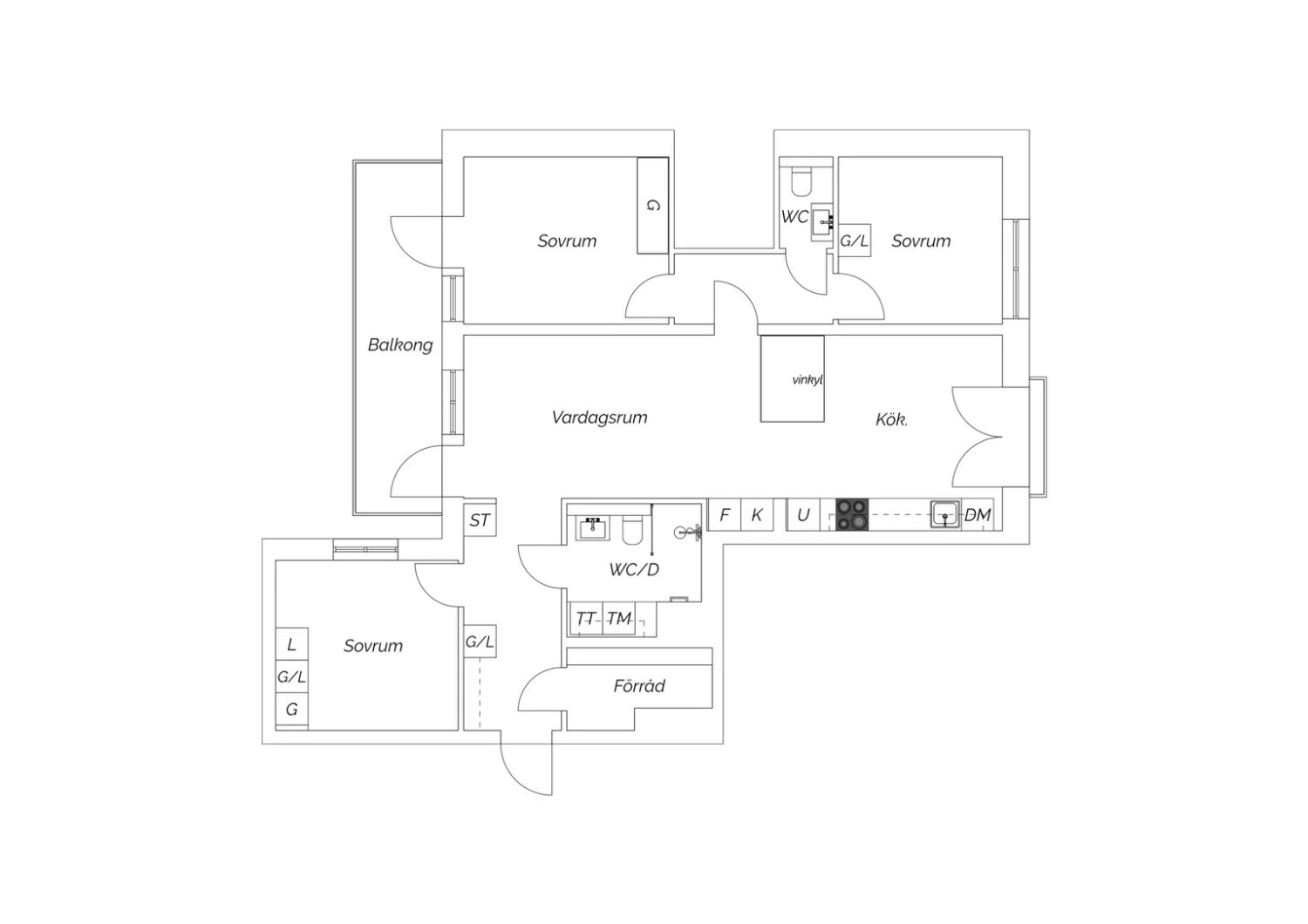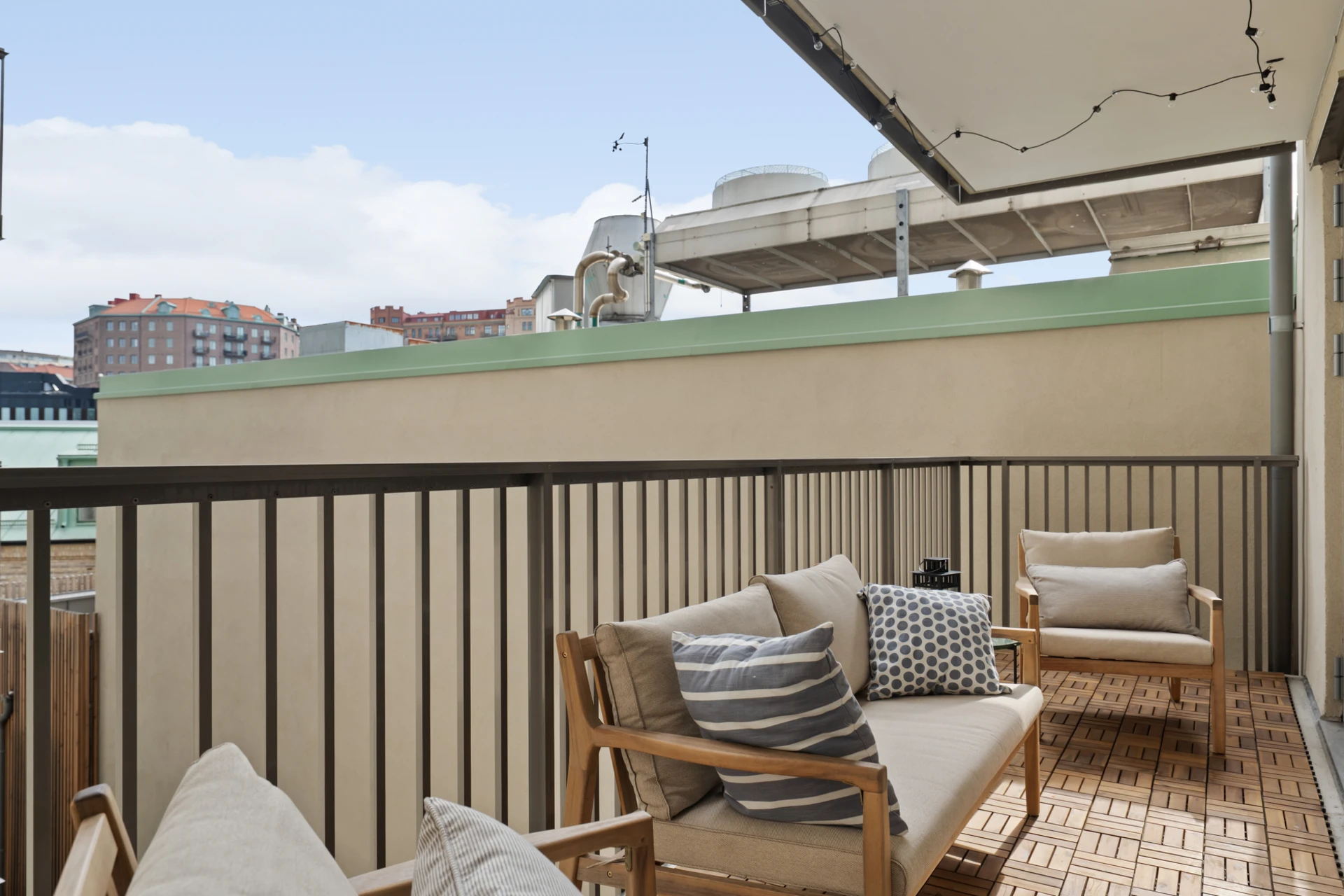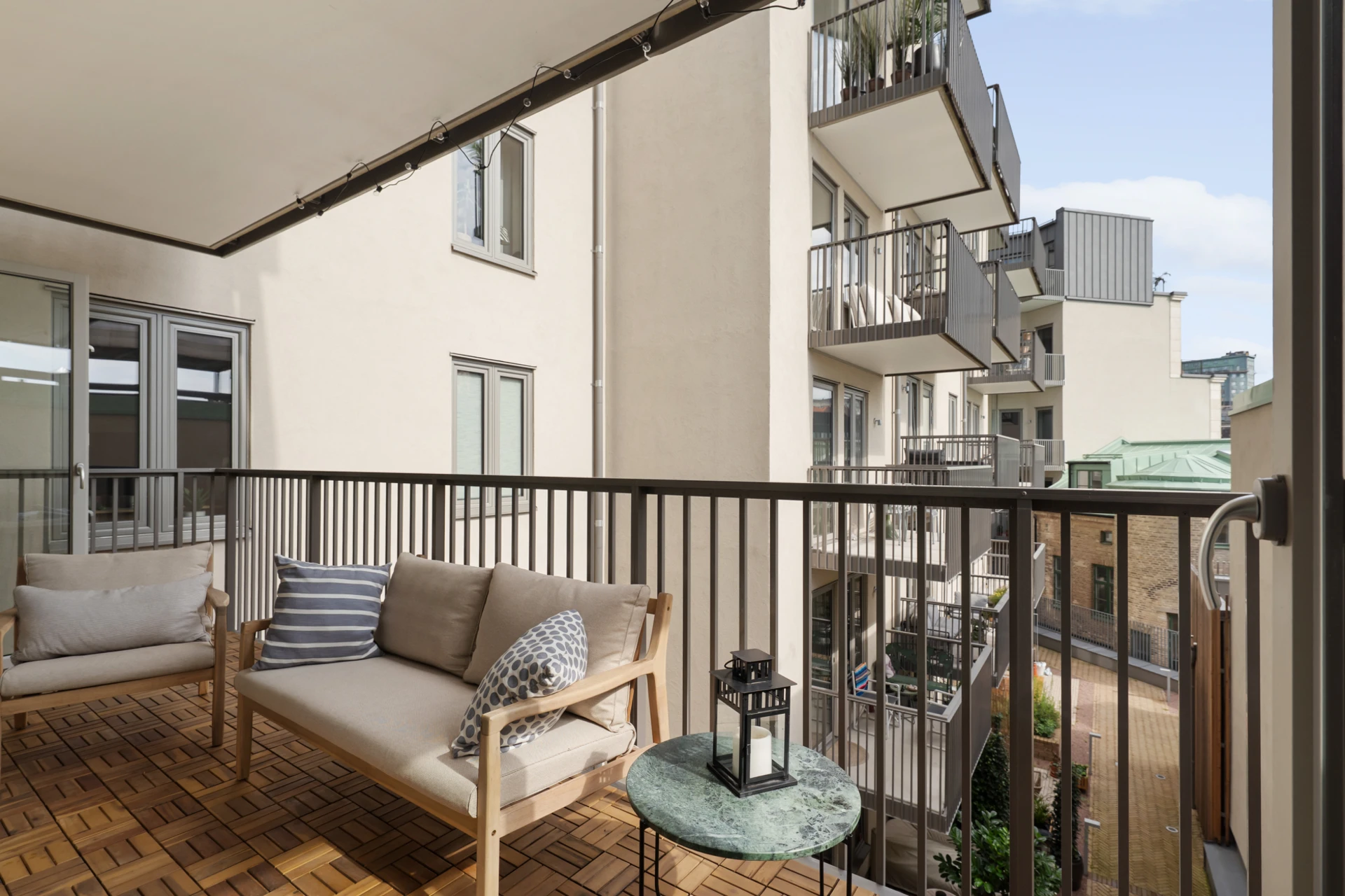 Ljus enstavsparkett och ljusa väggar. Här finns plats för soffgrupp med tillhörande möblemang. Härifrån nås hemmets balkong i norrläge.