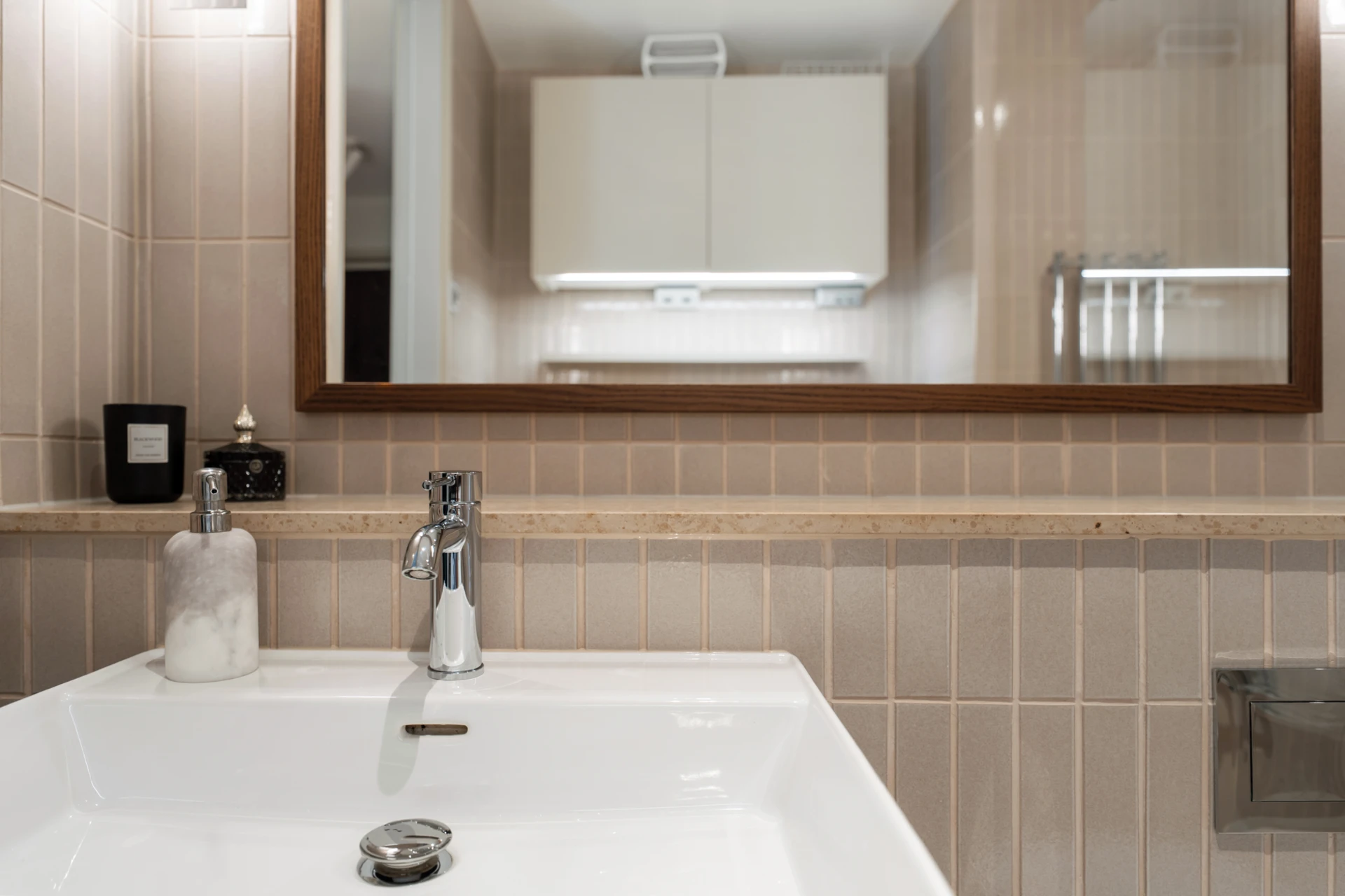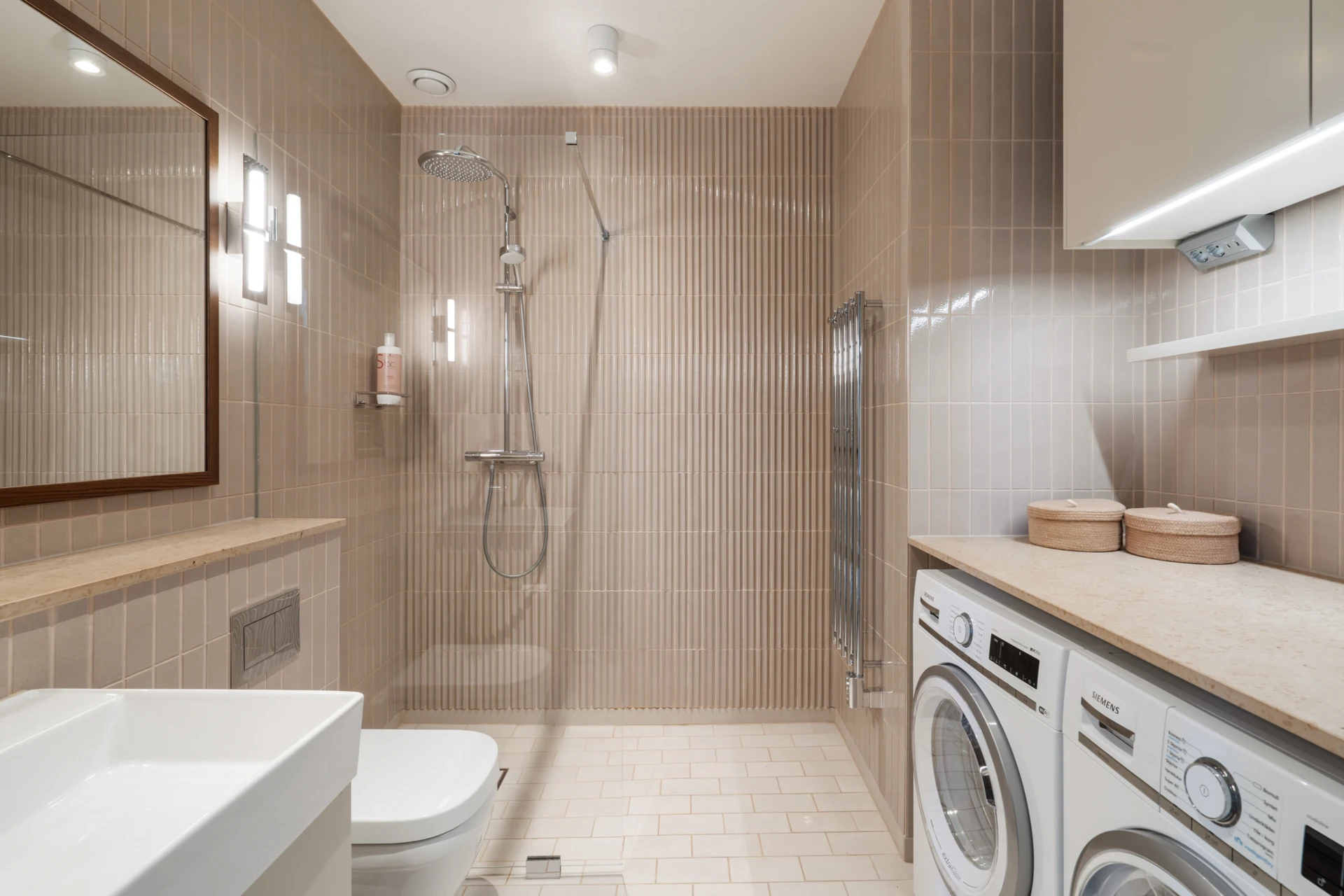 Beige klinkergolv och helkaklade väggar i beige. Badrummet är utrustat med vägghängd WC, handfat med kommod, stor spegel, dusch med glasvägg, handdukstork, tvättmaskin (Siemens), torktumlare (Siemens), arbetsbänk samt överskåp med förvaring och belysning.