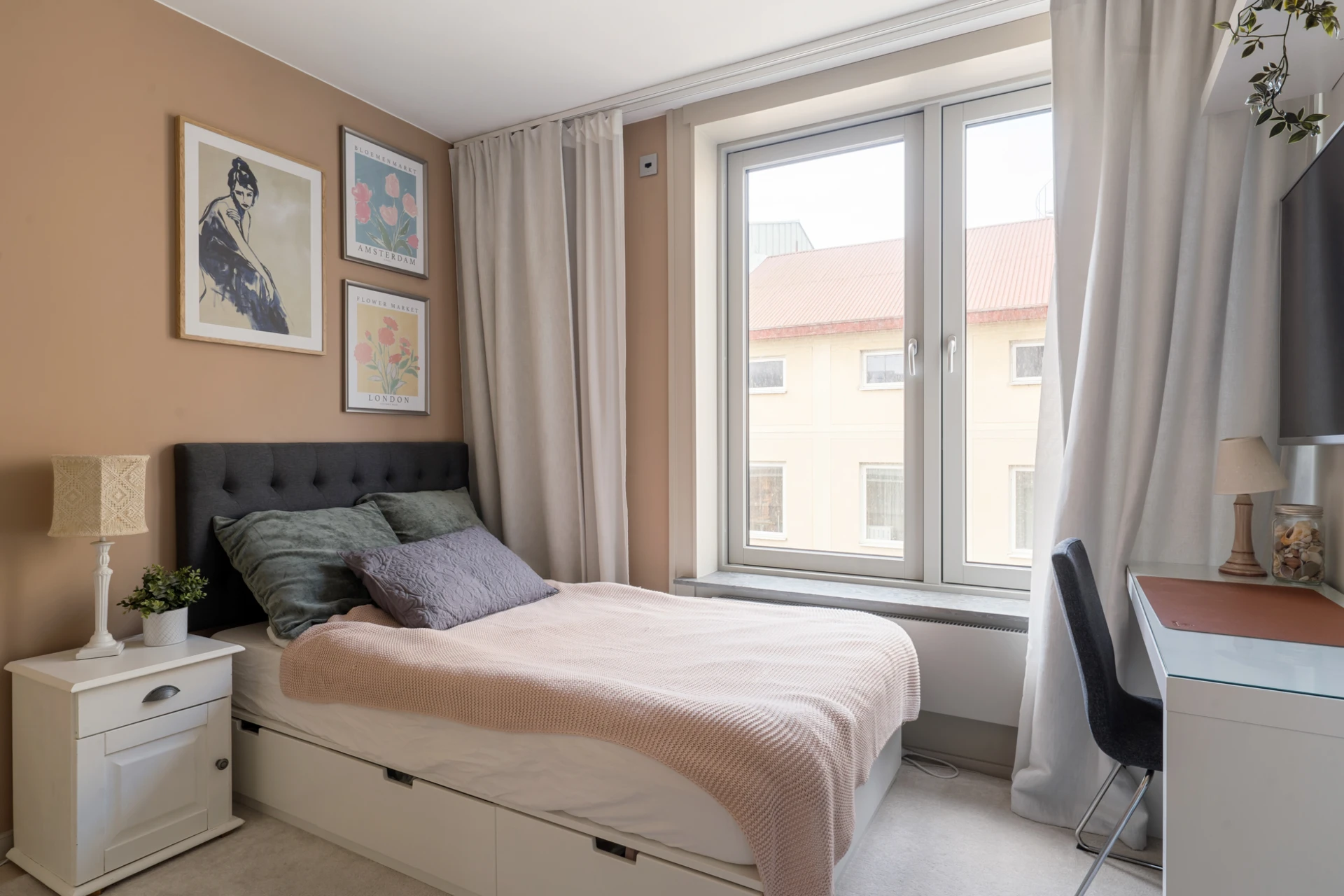 Ljus enstavsparkett och väggar i färgen "Desert Pink" (Colorama). Här finns plats för dubbelsäng med tillhörande möblemang. Förvaring sker i en garderob.