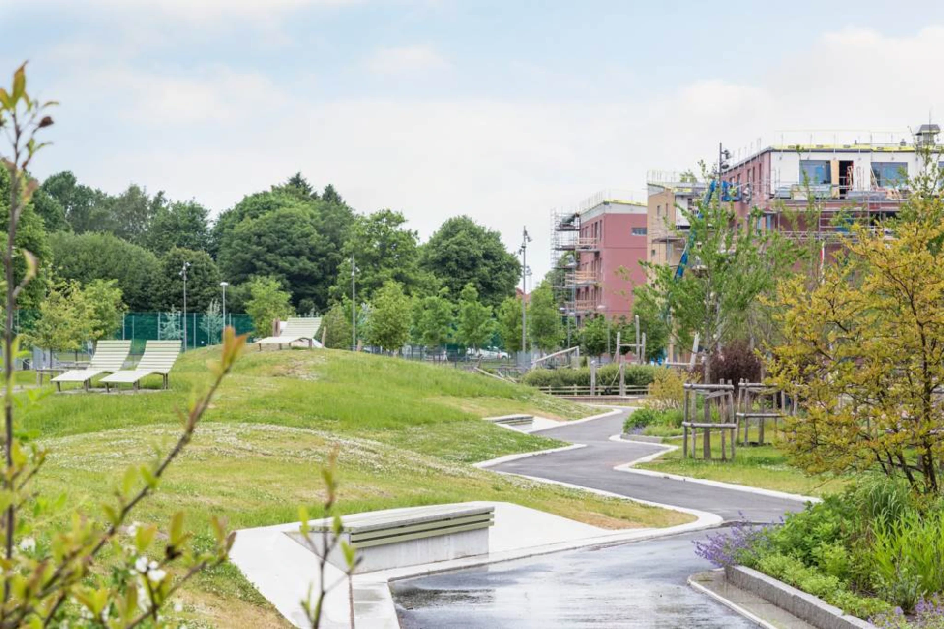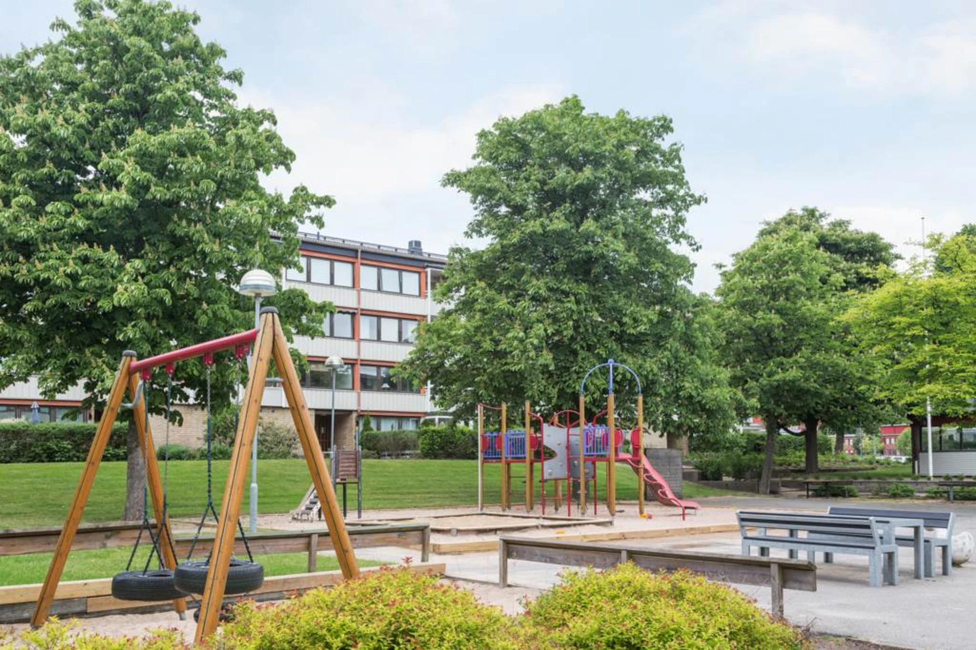 Gemensam innergård med utemöbler, grill, lekplats och boulebana.