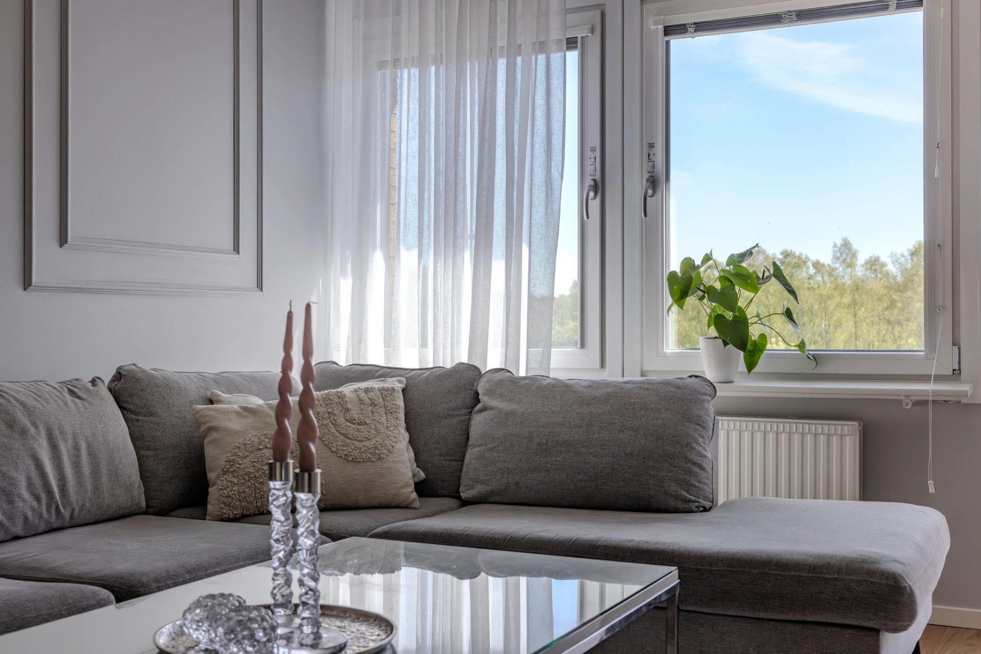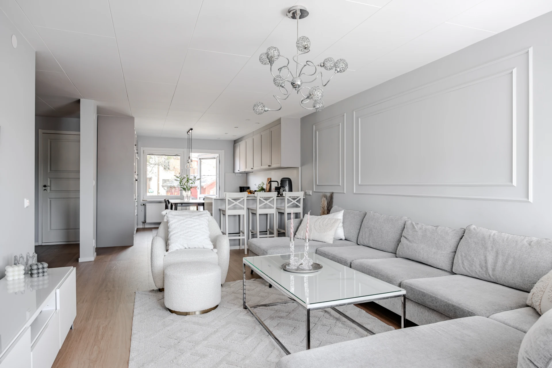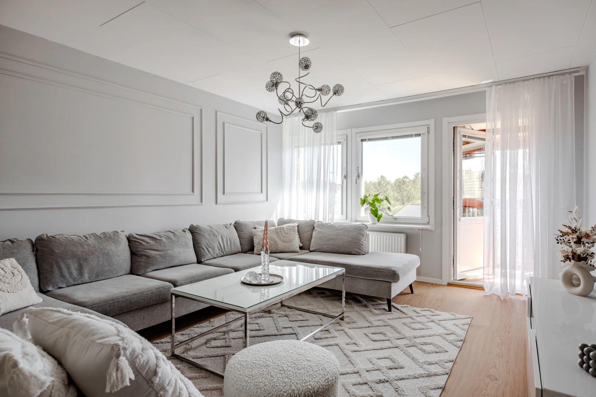 Parkettgolv och målade väggar. Plats för soffgrupp med tillhörande möblemang, öppen planlösning till köket. Utgång till bostadens inglasade balkong.