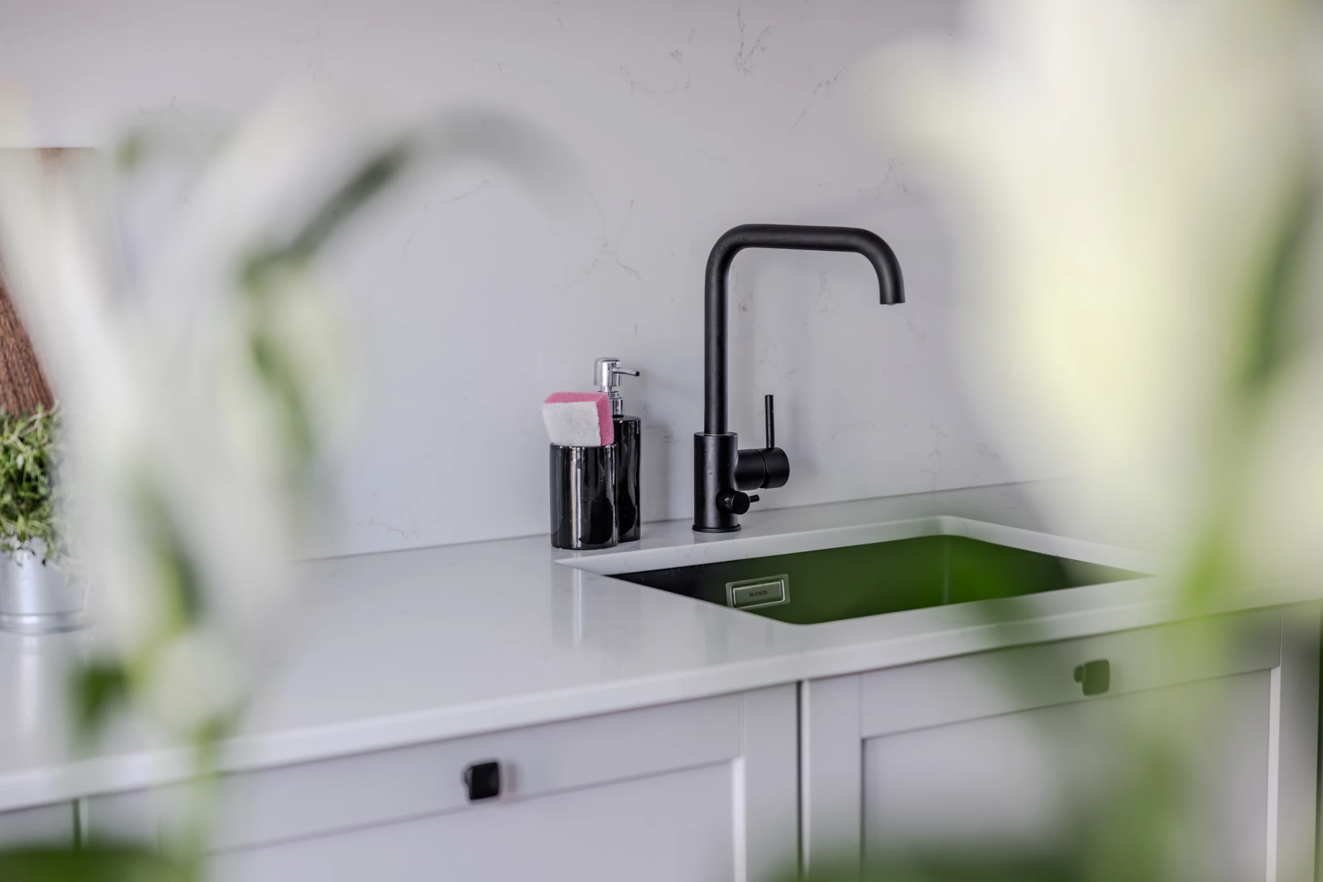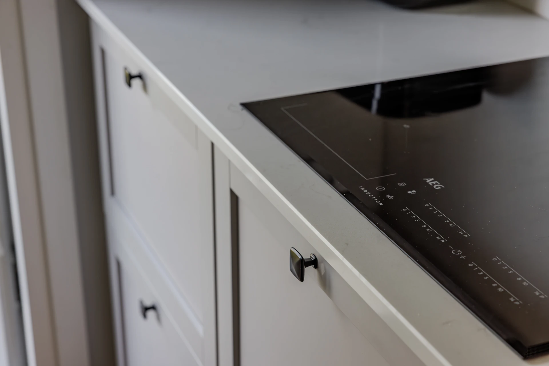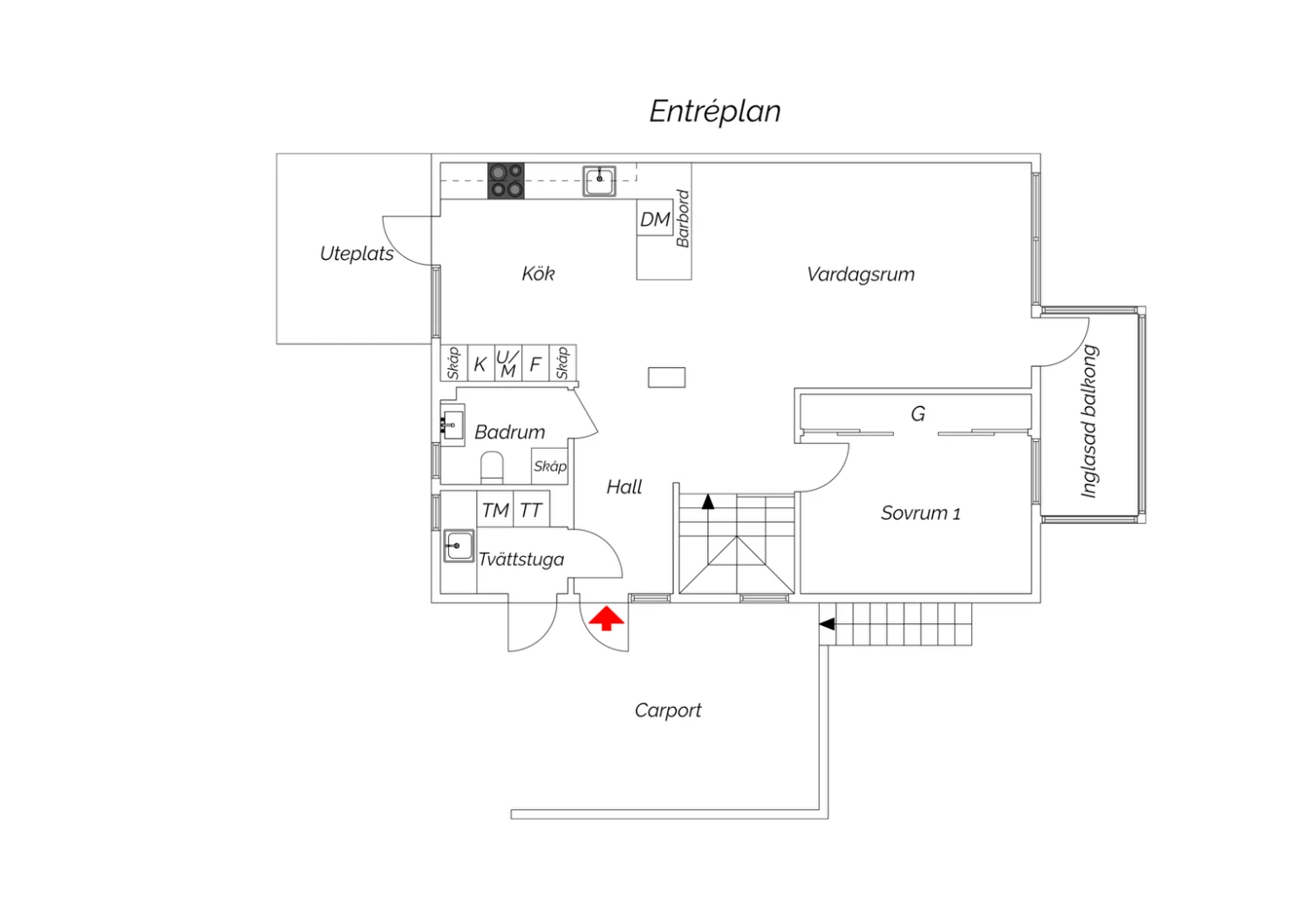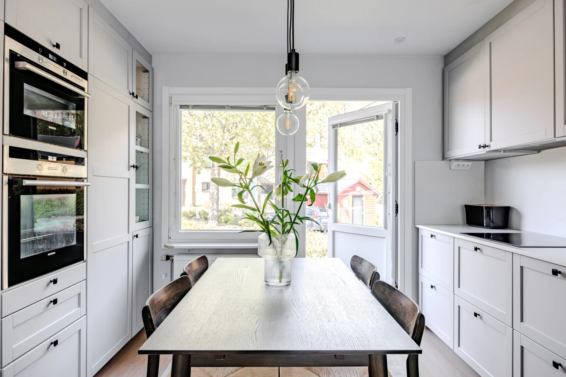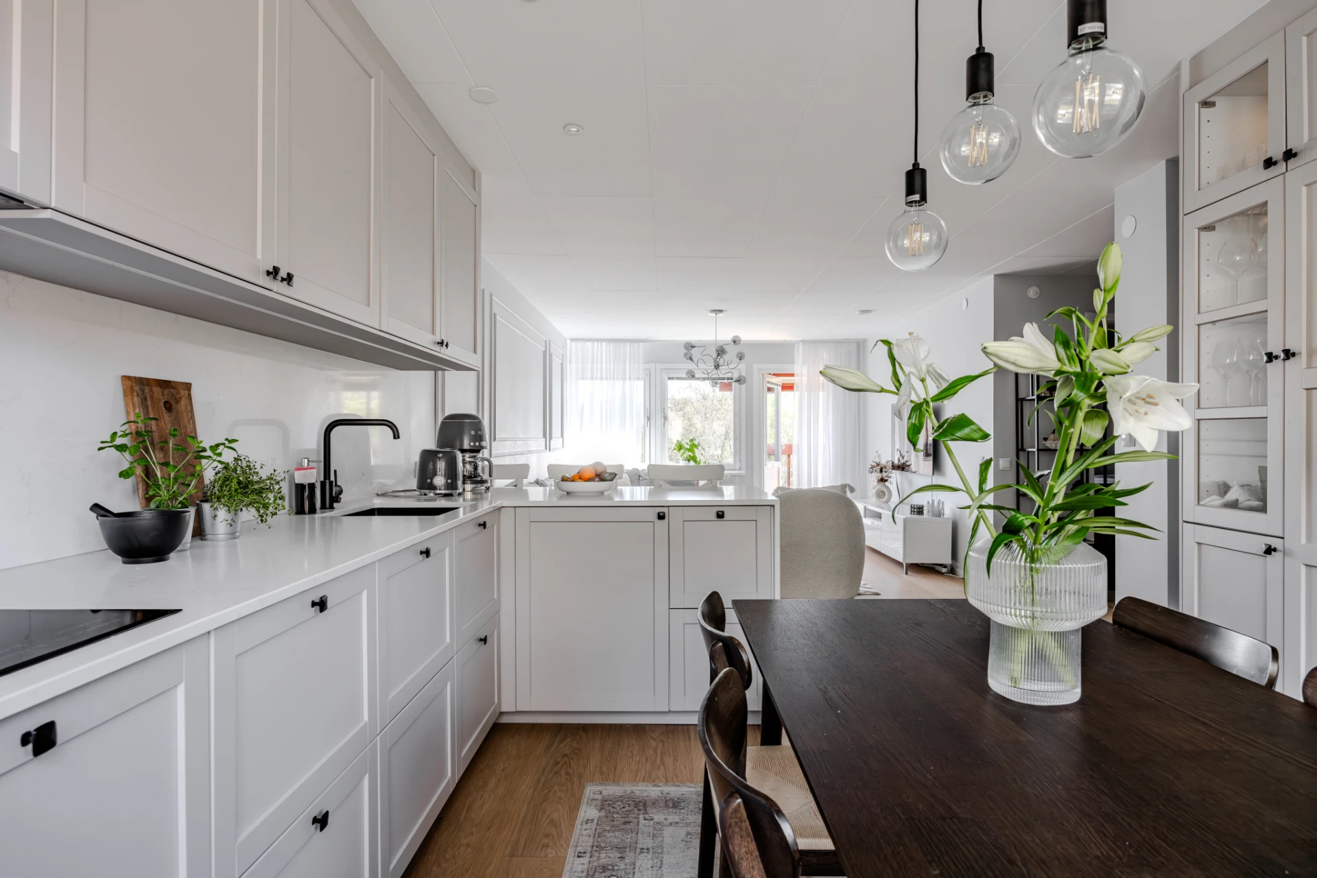 Parkettgolv och målade väggar. Köksinredning från IKEA och ovan arbetsbänken i kvartskomposit sitter ljust stänkskydd. Köket är utrustat med inbyggd induktionshäll (AEG), integrerade vitvaror, micro (SIEMENS), ugn (Siemens), diskmaskin (Torsboda), kyl, frys (Forsnäs) samt fläkt. Plats för matsalsbord för ca 4-6 personer. Öppen planlösning till vardagsrummet. Utgång till den mindre uteplatsen i nord/österläge.