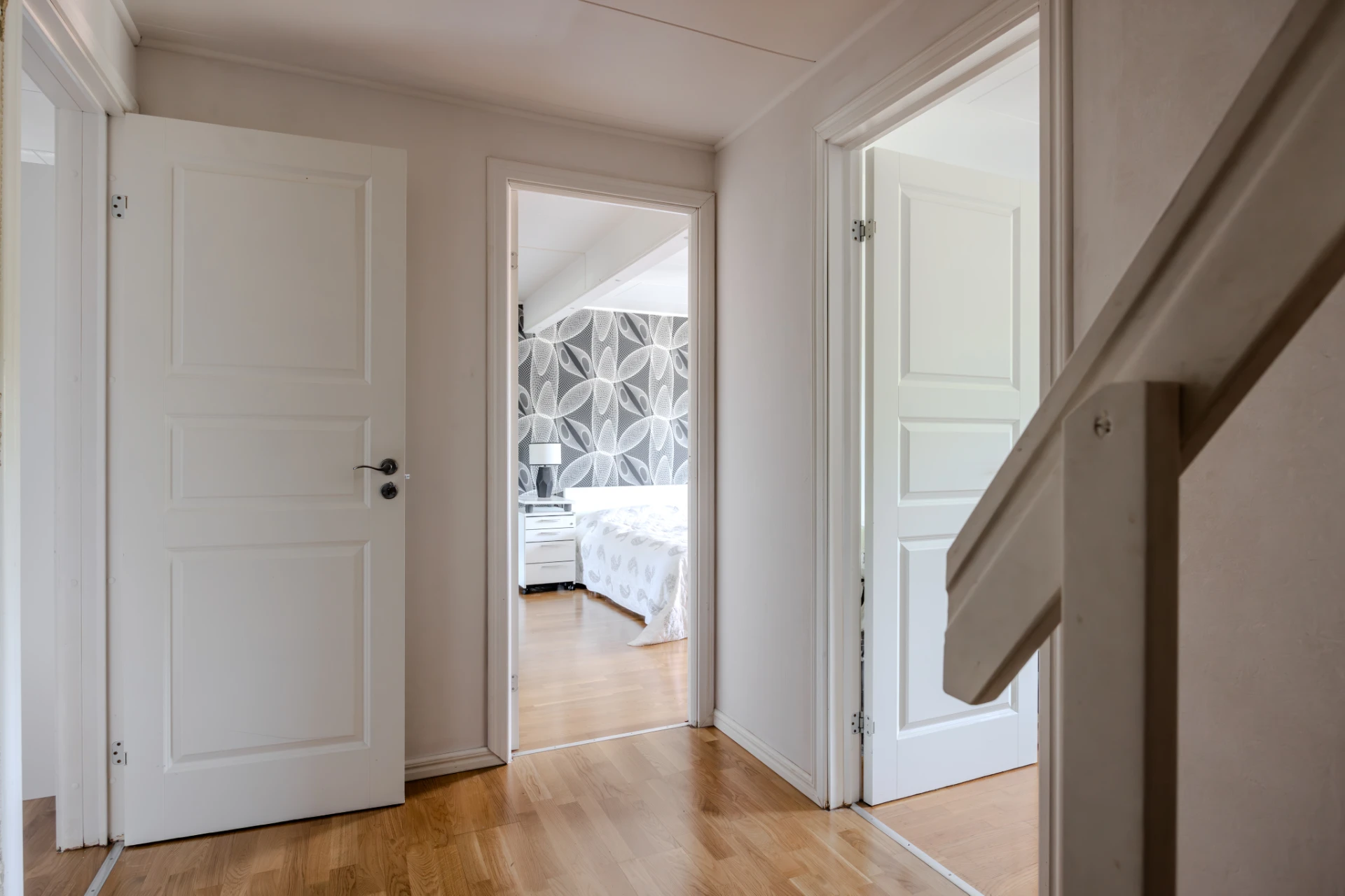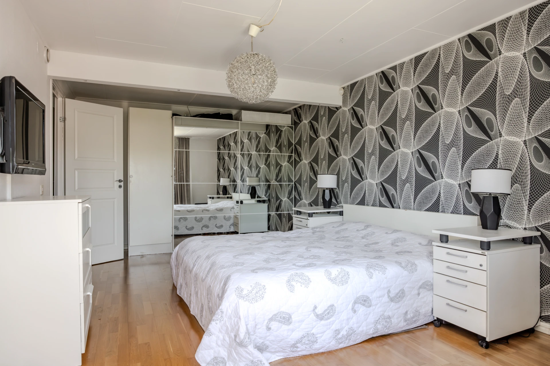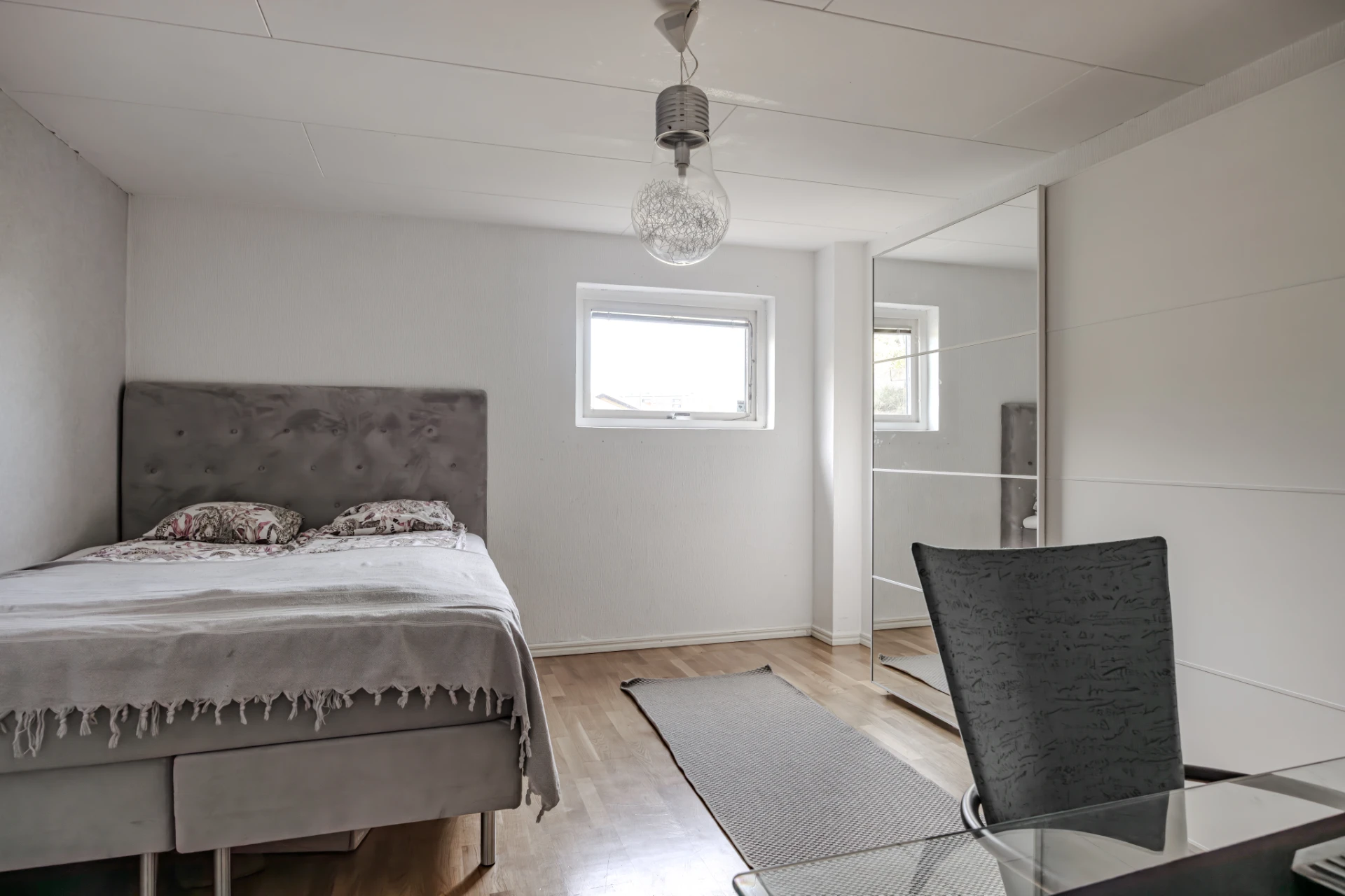 Parkettgolv och målade/fond -väggar. Plats för dubbelsäng med tillhörande möblemang. Förvaring i garderober.