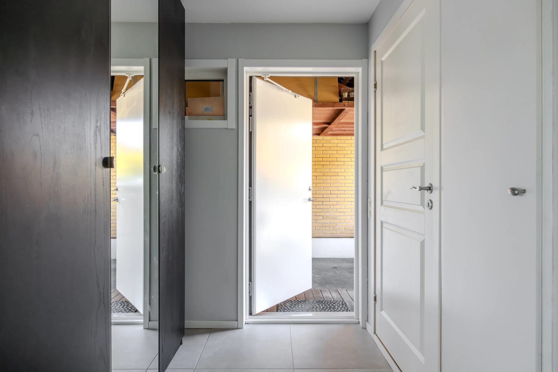 Klinkergolv och målade väggar. Här finns plats för avhängning och goda förvaringsmöjligheter i garderob.