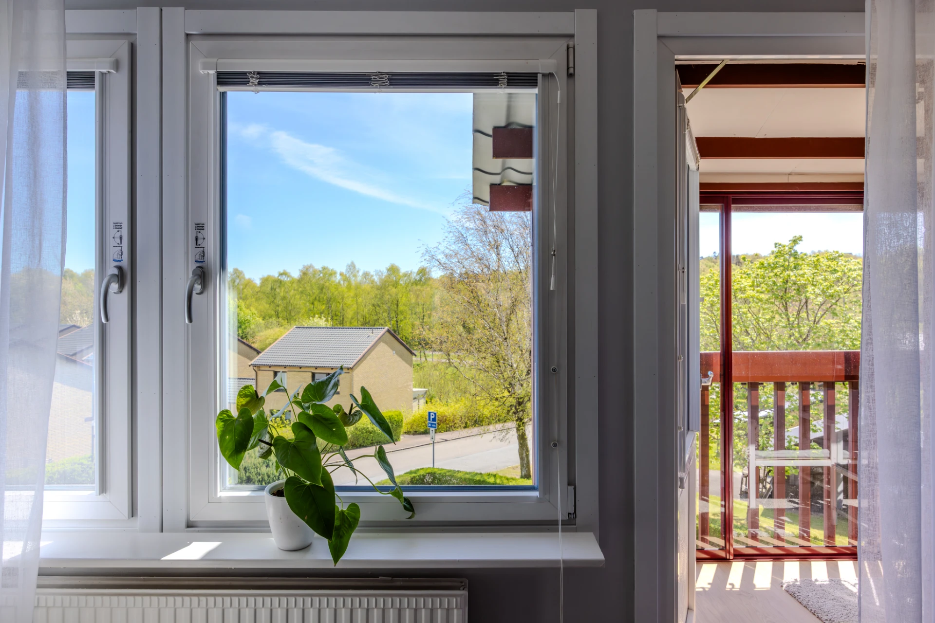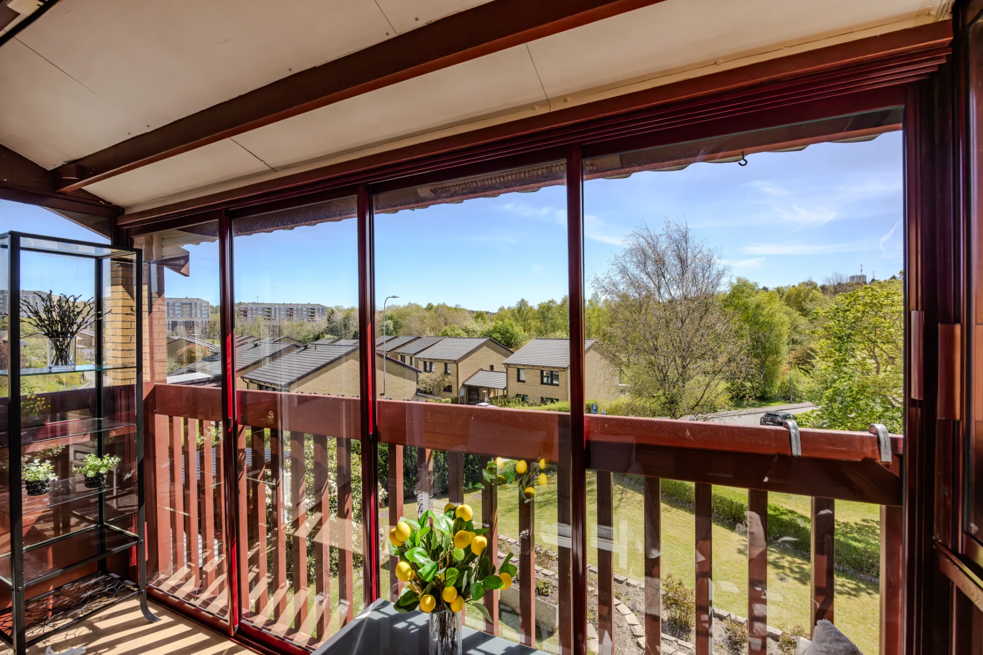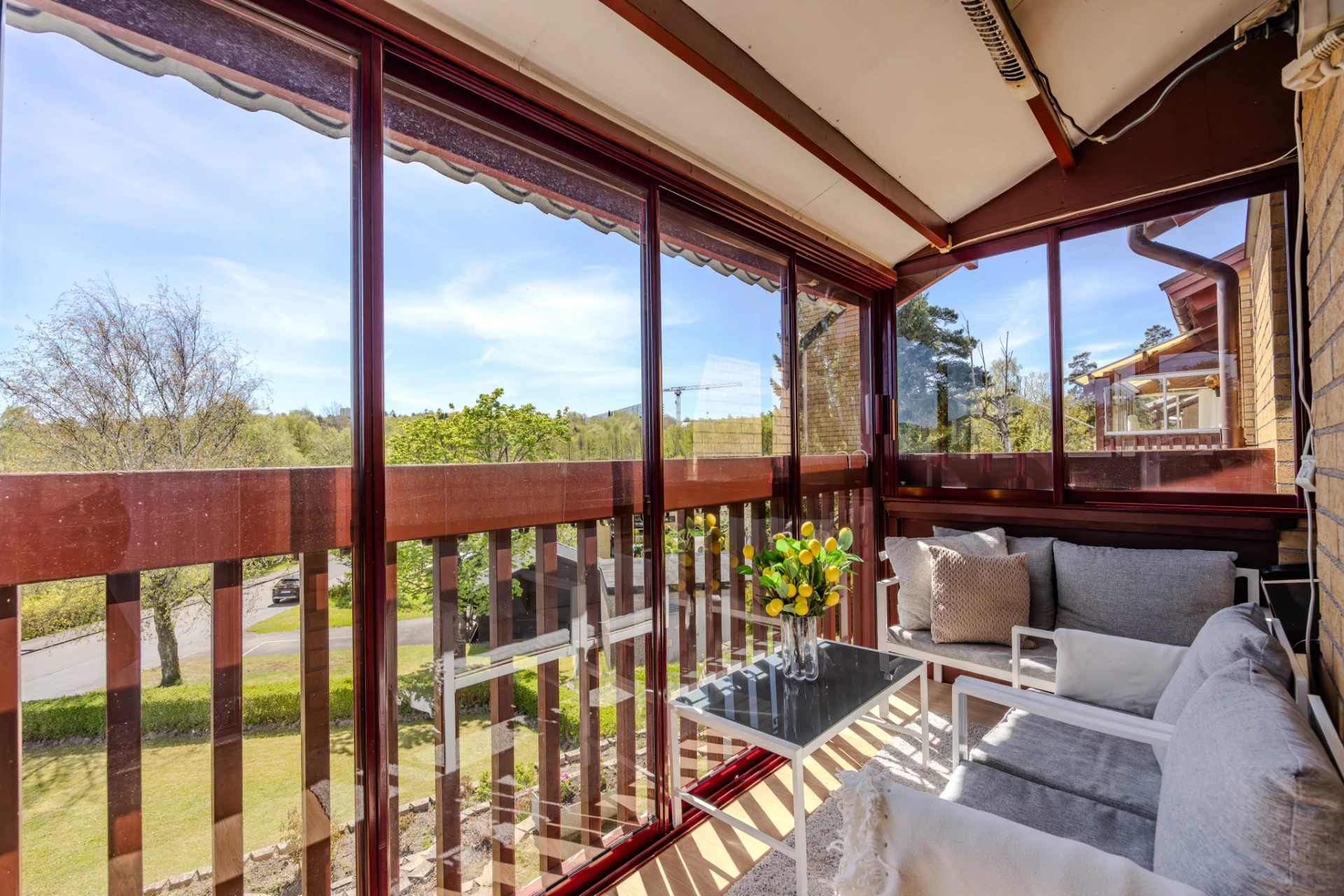 Inglasad balkong med grönskade utsikt och plats för utomhusmöbler.